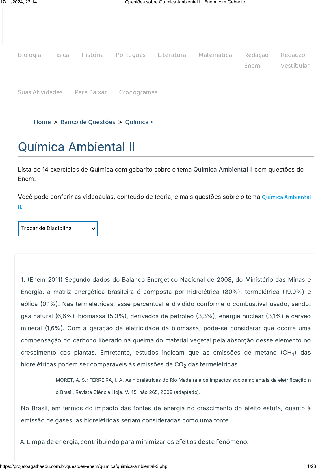 Biologia Física História Português Literatura Matemática Redação Enem Redação Vestibular Suas Atividades Para Baixar Cronogramas Home > Banco de Questões > Química > Química Ambiental II Lista de 14 exercícios de Química com gabarito sobre o tema Química Ambiental II com questões do Enem. Você pode conferir as videoaulas, conteúdo de teoria, e mais questões sobre o tema Química Ambiental II. Trocar de Disciplina 1. �Enem 2011� Segundo dados do Balanço Energético Nacional de 2008, do Ministério das Minas e Energia, a matriz energética brasileira é composta por hidrelétrica �80%�, termelétrica �19,9%) e eólica �0,1%�. Nas termelétricas, esse percentual é dividido conforme o combustıv́el usado, sendo: gás natural �6,6%�, biomassa �5,3%�, derivados de petróleo �3,3%�, energia nuclear �3,1%) e carvão mineral �1,6%�. Com a geração de eletricidade da biomassa, pode-se considerar que ocorre uma compensação do carbono liberado na queima do material vegetal pela absorção desse elemento no crescimento das plantas. Entretanto, estudos indicam que as emissões de metano �CH ) das hidrelétricas podem ser comparáveis às emissões de CO das termelétricas. MORET, A. S.; FERREIRA, I. A. As hidrelétricas do Rio Madeira e os impactos socioambientais da eletrificação n o Brasil. Revista Ciência Hoje. V. 45, não 265, 2009 (adaptado). No Brasil, em termos do impacto das fontes de energia no crescimento do efeito estufa, quanto à emissão de gases, as hidrelétricas seriam consideradas como uma fonte A. Limpa de energia, contribuindo para minimizar os efeitos deste fenômeno. 4 2 17/11/2024, 22:14 Questões sobre Química Ambiental II: Enem com Gabarito https://projetoagathaedu.com.br/questoes-enem/quimica/quimica-ambiental-2.php 1/23 https://projetoagathaedu.com.br/ https://projetoagathaedu.com.br/ https://projetoagathaedu.com.br/blog/biologia.php https://projetoagathaedu.com.br/blog/fisica.php https://projetoagathaedu.com.br/blog/historia.php https://projetoagathaedu.com.br/blog/linguagens.php https://projetoagathaedu.com.br/blog/literatura.php https://projetoagathaedu.com.br/blog/matematica.php https://projetoagatharedacao.com.br/guia-de-redacao-enem.php https://projetoagatharedacao.com.br/guia-de-redacao-enem.php https://projetoagatharedacao.com.br/guia-de-redacao-vestibular.php https://projetoagatharedacao.com.br/guia-de-redacao-vestibular.php https://projetoagathaedu.com.br/app/ https://projetoagathaedu.com.br/app/material.php https://projetoagathaedu.com.br/cronogramas-de-estudo.php https://projetoagathaedu.com.br/index.php https://projetoagathaedu.com.br/banco-de-questoes.php https://projetoagathaedu.com.br/banco-de-questoes/quimica.php https://projetoagathaedu.com.br/app/disciplinas/quimica/ambiental/introducao.php https://projetoagathaedu.com.br/app/disciplinas/quimica/ambiental/introducao.php B. E�caz de energia, tornando-se o percentual de oferta e os benefı́cios veri�cados. C. Limpa de energia, não afetando ou alterando os nı́veis dos gases do efeito estufa. D. Poluidora, colaborando com nı́veis altos de gases de efeito estufa em função de seu potencial de oferta. E. Alternativa, tomando-se por referência a grande emissão de gases de efeito estufa das demais fontes geradoras. 2. �Enem 2011� Os biocombustıv́eis de primeira geração são derivados da soja, milho e cana-de- açúcar e sua produção ocorre através da fermentação. Biocombustıv́eis derivados de material celulósico ou biocombustıv́eis de segunda geração - coloquialmente chamados de “gasolina de capim - são aqueles produzidos a partir de resıd́uos de madeira (serragem, por exemplo), talos de milho, palha de trigo ou capim de crescimento rápido e se apresentam como uma alternativa para os problemas enfrentados pelos de primeira geração, já que as matérias-primas são baratas e abundantes. DALE, B. E.; HUBER, G. W. Gasolina de capim e outros vegetais. Scientific American Brasil, Ago. 2009, n o 87 (adaptado). O texto mostra um dos pontos de vista a respeito do uso dos biocombustıv́eis na atualidade, os quais A. São matrizes energéticas com menor carga de poluição para o ambiente e podem propiciar a geração de novos empregos, entretanto, para serem oferecidos com baixo custo, a tecnologia da degradação da celulose nos biocombustı́veis de segunda geração deve ser extremamente e�ciente. B. Oferecem múltiplas di�culdades, pois a produção é de alto custo, sua implantação não gera empregos, e deve-se ter cuidado com o risco ambiental, pois eles oferecerem os mesmos riscos que o uso de combustı́veis fósseis. C. Sendo de segunda geração, são produzidos por uma tecnologia que acarreta problemas sociais, sobretudo decorrente do fato de a matéria-prima ser abundante e facilmente encontrada, o que impede a geração de novos empregos. D. Sendo de primeira e segunda geração, são produzidos por tecnologias que devem passar por uma avaliação criteriosa quanto ao uso, pois uma enfrenta o problema da falta de espaço para plantio da matéria-prima e a outra impede a geração de novas fontes de emprego. E. Podem acarretar sérios problemas econômicos e sociais, pois a substituição do uso de petróleo afeta negativamente toda uma cadeia produtiva na medida em que exclui diversas fontes de emprego nas re�narias, postos de gasolina e no transporte de petróleo e gasolina. 17/11/2024, 22:14 Questões sobre Química Ambiental II: Enem com Gabarito https://projetoagathaedu.com.br/questoes-enem/quimica/quimica-ambiental-2.php 2/23 3. �Enem 2011� A eutrofização é um processo em que rios, lagos e mares adquirem nıv́eis altos de nutrientes, especialmente fosfatos e nitratos, provocando posterior acúmulo de matéria orgânica em decomposição. Os nutrientes são assimilados pelos produtores primários e o crescimento desses é controlado pelo nutriente limıt́rofe, que é o elemento menos di