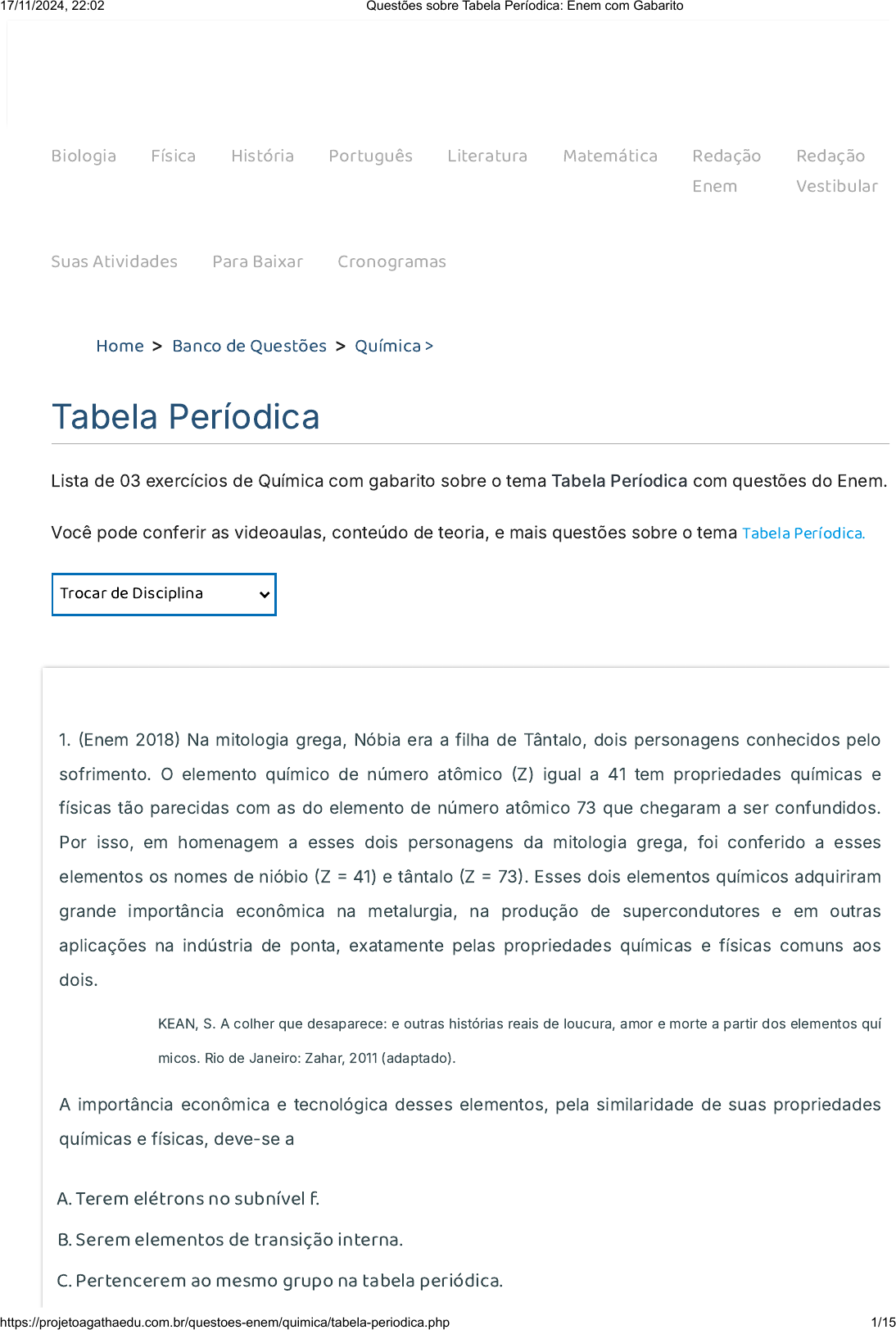 Biologia Física História Português Literatura Matemática Redação Enem Redação Vestibular Suas Atividades Para Baixar Cronogramas Home > Banco de Questões > Química > Tabela Períodica Lista de 03 exercícios de Química com gabarito sobre o tema Tabela Períodica com questões do Enem. Você pode conferir as videoaulas, conteúdo de teoria, e mais questões sobre o tema Tabela Períodica. Trocar de Disciplina 1. �Enem 2018� Na mitologia grega, Nóbia era a filha de Tântalo, dois personagens conhecidos pelo sofrimento. O elemento químico de número atômico �Z) igual a 41 tem propriedades químicas e físicas tão parecidas com as do elemento de número atômico 73 que chegaram a ser confundidos. Por isso, em homenagem a esses dois personagens da mitologia grega, foi conferido a esses elementos os nomes de nióbio �Z � 41) e tântalo �Z � 73�. Esses dois elementos químicos adquiriram grande importância econômica na metalurgia, na produção de supercondutores e em outras aplicações na indústria de ponta, exatamente pelas propriedades químicas e físicas comuns aos dois. KEAN, S. A colher que desaparece: e outras histórias reais de loucura, amor e morte a partir dos elementos quí micos. Rio de Janeiro: Zahar, 2011 (adaptado). A importância econômica e tecnológica desses elementos, pela similaridade de suas propriedades químicas e físicas, deve-se a A. Terem elétrons no subnível f. B. Serem elementos de transição interna. C. Pertencerem ao mesmo grupo na tabela periódica. 17/11/2024, 22:02 Questões sobre Tabela Períodica: Enem com Gabarito https://projetoagathaedu.com.br/questoes-enem/quimica/tabela-periodica.php 1/15 https://projetoagathaedu.com.br/ https://projetoagathaedu.com.br/ https://projetoagathaedu.com.br/blog/biologia.php https://projetoagathaedu.com.br/blog/fisica.php https://projetoagathaedu.com.br/blog/historia.php https://projetoagathaedu.com.br/blog/linguagens.php https://projetoagathaedu.com.br/blog/literatura.php https://projetoagathaedu.com.br/blog/matematica.php https://projetoagatharedacao.com.br/guia-de-redacao-enem.php https://projetoagatharedacao.com.br/guia-de-redacao-enem.php https://projetoagatharedacao.com.br/guia-de-redacao-vestibular.php https://projetoagatharedacao.com.br/guia-de-redacao-vestibular.php https://projetoagathaedu.com.br/app/ https://projetoagathaedu.com.br/app/material.php https://projetoagathaedu.com.br/cronogramas-de-estudo.php https://projetoagathaedu.com.br/index.php https://projetoagathaedu.com.br/banco-de-questoes.php https://projetoagathaedu.com.br/banco-de-questoes/quimica.php https://projetoagathaedu.com.br/app/disciplinas/quimica/atomistica/classificacao-periodica.php D. Terem seus elétrons mais externos dos níveis 4 e 5, respectivamente. E. Estarem localizados na família dos alcalinos terrosos e alcalinos, respectivamente. 2. �Enem 2017� No ar que respiramos existem os chamados “gases Inertes”. Trazem curiosos nomes gregos, que significam “o Novo”, “o Oculto”, “o Inativo”. E de fato são de tal modo inertes, tão satisfeitos em sua condição, que não interferem em nenhuma reação química, não se combinam com nenhum outro elemento e justamente por esse motivo ficaram sem ser observados durante séculos: só em 1962 um químico, depois de longos e engenhosos esforços, conseguiu forçar “o Estrangeiro” (o xenônio) a combinar-se fugazmente com o flúor ávido e vivaz, e a façanha pareceu tão extraordinária que lhe foi conferido o Prêmio Nobel. LEVI, P. A tabela periódica. Rio de Janeiro: Relume-Dumará, 1994 (adaptado). Qual propriedade do flúor justifica sua escolha como reagente para o processo mencionado? A. Densidade. B. Condutância. C. Eletronegatividade. D. Estabilidade nuclear. E. Temperatura de ebulição. 3. �Enem 2009� Os núcleos dos átomos são constituıd́os de prótons e nêutrons, sendo ambos os principais responsáveis pela sua massa. Nota-se que, na maioria dos núcleos, essas partıćulas não estão presentes na mesma proporção. O gráfico mostra a quantidade de nêutrons �N) em função da quantidade de prótons �Z) para os núcleos estáveis conhecidos. 17/11/2024, 22:02 Questões sobre Tabela Períodica: Enem com Gabarito https://projetoagathaedu.com.br/questoes-enem/quimica/tabela-periodica.php 2/15 O antimônio é um elemento quıḿico que possui 50 prótons e possui vários isótopos - átomos que só se diferem pelo número de nêutrons. De acordo com o gráfico, os isótopos estáveis do antimônio possuem A. Entre 12 e 24 nêutrons a menos que o número de prótons. B. Exatamente o mesmo número de prótons e nêutrons. C. Entre 0 e 12 nêutrons a mais que o número de prótons. D. Entre 12 e 24 nêutrons a mais que o número de prótons. E. Entre 0 e 12 nêutrons a menos que o número de prótons. Mostrar o Gabarito Gabarito com Resolução Clique Para Compartilhar Esta Página Nas Redes Sociais Imprimir WhatsApp Facebook Twitter Pinterest Linkedin E-Mail 17/11/2024, 22:02 Questões sobre Tabela Períodica: Enem com Gabarito https://projetoagathaedu.com.br/questoes-enem/quimica/tabela-periodica.php 3/15 https://projetoagathaedu.com.br/questoes-enem/resolucao-quimica/tabela-periodica.php https://projetoagathaedu.com.br/questoes-enem/resolucao-quimica/tabela-periodica.php https://projetoagathaedu.com.br/questoes-enem/resolucao-quimica/tabela-periodica.php https://projetoagathaedu.com.br/questoes-enem/quimica/tabela-periodica.php https://projetoagathaedu.com.br/questoes-enem/quimica/tabela-periodica.php https://api.whatsapp.com/send?text=Quest%C3%B5es%20sobre%20Tabela%20Per%C3%ADodica%3A%20Enem%20com%20Gabarito%20https%3A%2F%2Fprojetoagathaedu.com.br%2Fquestoes-enem%2Fquimica%2Ftabela-periodica.php https://api.whatsapp.com/send?text=Quest%C3%B5es%20sobre%20Tabela%20Per%C3%ADodica%3A%20Enem%20com%20Gabarito%20https%3A%2F%2Fprojetoagathaedu.com.br%2Fquestoes-enem%2Fquimica%2Ftabela-periodica.php https://www.facebook