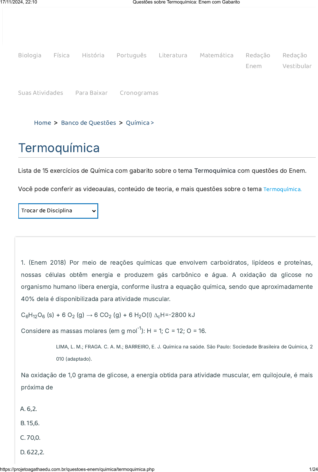 Biologia Física História Português Literatura Matemática Redação Enem Redação Vestibular Suas Atividades Para Baixar Cronogramas Home > Banco de Questões > Química > Termoquímica Lista de 15 exercícios de Química com gabarito sobre o tema Termoquímica com questões do Enem. Você pode conferir as videoaulas, conteúdo de teoria, e mais questões sobre o tema Termoquímica. Trocar de Disciplina 1. �Enem 2018� Por meio de reações químicas que envolvem carboidratos, lipídeos e proteínas, nossas células obtêm energia e produzem gás carbônico e água. A oxidação da glicose no organismo humano libera energia, conforme ilustra a equação química, sendo que aproximadamente 40% dela é disponibilizada para atividade muscular. C H O (s) + 6 O (g) → 6 CO (g) + 6 H O(l) ∆ H��2800 kJ Considere as massas molares (em g mol ): H � 1; C � 12; O � 16. LIMA, L. M.; FRAGA. C. A. M.; BARREIRO, E. J. Química na saúde. São Paulo: Sociedade Brasileira de Química, 2 010 (adaptado). Na oxidação de 1,0 grama de glicose, a energia obtida para atividade muscular, em quilojoule, é mais próxima de A. 6,2. B. 15,6. C. 70,0. D. 622,2. 6 12 6 2 2 2 c �1 17/11/2024, 22:10 Questões sobre Termoquímica: Enem com Gabarito https://projetoagathaedu.com.br/questoes-enem/quimica/termoquimica.php 1/24 https://projetoagathaedu.com.br/ https://projetoagathaedu.com.br/ https://projetoagathaedu.com.br/blog/biologia.php https://projetoagathaedu.com.br/blog/fisica.php https://projetoagathaedu.com.br/blog/historia.php https://projetoagathaedu.com.br/blog/linguagens.php https://projetoagathaedu.com.br/blog/literatura.php https://projetoagathaedu.com.br/blog/matematica.php https://projetoagatharedacao.com.br/guia-de-redacao-enem.php https://projetoagatharedacao.com.br/guia-de-redacao-enem.php https://projetoagatharedacao.com.br/guia-de-redacao-vestibular.php https://projetoagatharedacao.com.br/guia-de-redacao-vestibular.php https://projetoagathaedu.com.br/app/ https://projetoagathaedu.com.br/app/material.php https://projetoagathaedu.com.br/cronogramas-de-estudo.php https://projetoagathaedu.com.br/index.php https://projetoagathaedu.com.br/banco-de-questoes.php https://projetoagathaedu.com.br/banco-de-questoes/quimica.php https://projetoagathaedu.com.br/app/disciplinas/quimica/termoquimica/introducao.php E. 1 120,0. 2. �Enem 2017� O ferro é encontrado na natureza na forma de seus minérios, tais como a hematita (α-Fe O ), a magnetita �Fe O ) e a wustita �FeO�. Na siderurgia, o ferro-gusa é obtido pela fusão de minérios de ferro em altos fomos em condições adequadas. Uma das etapas nesse processo é a formação de monóxido de carbono. O CO (gasoso) é utilizado para reduzir o FeO (sólido), conforme a equação química: FeO(s) + CO(g) → Fe(s) + CO (g) Fe O (s) + 3 C (g) → 2 Fe(s) + 3 CO (g) Δ H = �25 kJ/mol de Fe O 3FeO(s) + CO (g) → Fe O (s) + CO(g) ∆ H = �36 kJ/mol de CO 2 Fe O (s) + CO (g) → 3 Fe O (s) + CO(g) Δ H = �47 kJ/mol de CO O valor mais próximo de Δ H Ɵ, em kJ/mol de FeO, para reação indicada do FeO (sólido) com CO (gasoso) é A. -14. B. -17. C. -50. D. -64. E. -100 3. �Enem 2016� O aquecimento de um material por irradiação com micro-ondas ocorre por causa da interação da onda eletromagnética com o dipolo elétrico da molécula. Um importante atributo do aquecimento por micro-ondas é a absorção direta da energia pelo material a ser aquecido. Assim, esse aquecimento é seletivo e dependerá, principalmente, da constante dielétrica e da frequência de relaxação do material. O gráfico mostra a taxa de aquecimento de cinco solventes sob irradiação de micro-ondas. O gráfico mostra a taxa de aquecimento de cinco solventes sob irradiação de micro-ondas. 2 3 3 4 2 2 3 O 2 r Ɵ 2 3 2 3 4 r Ɵ 2 3 4 2 2 3 r Ɵ 2 r 17/11/2024, 22:10 Questões sobre Termoquímica: Enem com Gabarito https://projetoagathaedu.com.br/questoes-enem/quimica/termoquimica.php 2/24 No gráfico, qual solvente apresenta taxa média de aquecimento mais próxima de zero, no intervalo de 0s a 40 s? A. HO B. CH OH C. CH CH OH D. CH CH CH OH E. CH CH CH CH CH CH 4. �Enem 2016� O benzeno, um importante solvente para a indústria química, é obtido industrialmente pela destilação do petróleo. Contudo, também pode ser sintetizado pela trimerização do acetileno catalisada por ferro metálico sob altas temperaturas, conforme a equação química: 3 C H → C H A energia envolvida nesse processo pode ser calculada indiretamente pela variação de entalpia das reações de combustão das substâncias participantes, nas mesmas condições experimentais: I. C H + 5/2O → 2CO (g) + H O(l) ∆H o = �310 kcal/mol II. C6H6(l) + 15/2O2(g) à 6CO2(g) + 3H2O(l) ∆Hco = �780 kcal/mol A variação de entalpia do processo de trimerização, e kcal para a formação de um mol de benzeno é mais próxima de, A. -1.090. B. -150. 2 3 3 2 3 2 2 3 2 2 2 2 3 2 2 6 6(l) 2 2(g) 2(g) 2 2 c 17/11/2024, 22:10 Questões sobre Termoquímica: Enem com Gabarito https://projetoagathaedu.com.br/questoes-enem/quimica/termoquimica.php 3/24 C. -50. D. +157. E. +470 5. �Enem PPL 2015� O urânio é um elemento cujos átomos contêm 92 prótons, 92 elétrons e entre 135 e 148 nêutrons. O isótopo de urânio U é utilizado como combustível em usinas nucleares, onde, ao ser bombardeado por nêutrons, sofre fissão de seu núcleo e libera uma grande quantidade de energia �2,35X10 kJ/mol). O isótopo U ocorre naturalmente em minérios de urânio, com concentração de apenas 0,7%. Para ser utilizado na geração de energia nuclear, o minério é submetido a um processo de enriquecimento, visando aumentar a concentração do isótopo Upara, aproximadamente, 3% nas pastilhas. Em décadas anteriores, houve um movimento mundial para aumentar a geração de energia nuclear buscando substituir, parcialmente, a geração de energia elétrica a partir da queima do carvão, o que dimin