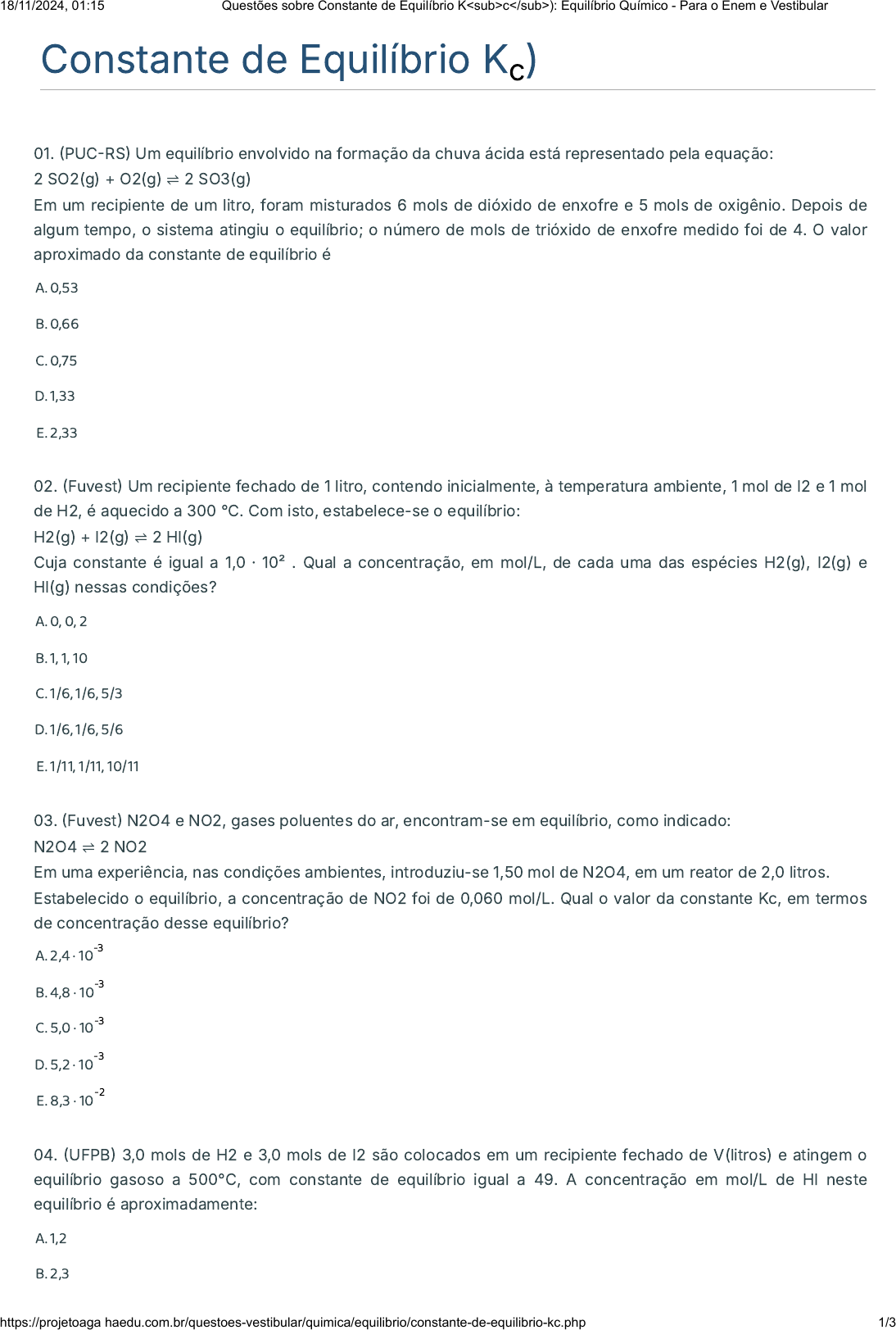 Constante de Equilíbrio K ) 01. �PUC�RS� Um equilíbrio envolvido na formação da chuva ácida está representado pela equação: 2 SO2(g) + O2(g) ⇌ 2 SO3(g) Em um recipiente de um litro, foram misturados 6 mols de dióxido de enxofre e 5 mols de oxigênio. Depois de algum tempo, o sistema atingiu o equilíbrio; o número de mols de trióxido de enxofre medido foi de 4. O valor aproximado da constante de equilíbrio é A. 0,53 B. 0,66 C. 0,75 D. 1,33 E. 2,33 02. �Fuvest� Um recipiente fechado de 1 litro, contendo inicialmente, à temperatura ambiente, 1 mol de I2 e 1 mol de H2, é aquecido a 300 °C. Com isto, estabelece-se o equilíbrio: H2(g) + I2(g) ⇌ 2 HI(g) Cuja constante é igual a 1,0 · 10² . Qual a concentração, em mol/L, de cada uma das espécies H2(g), I2(g) e HI(g) nessas condições? A. 0, 0, 2 B. 1, 1, 10 C. 1/6, 1/6, 5/3 D. 1/6, 1/6, 5/6 E. 1/11, 1/11, 10/11 03. �Fuvest� N2O4 e NO2, gases poluentes do ar, encontram-se em equilíbrio, como indicado: N2O4 ⇌ 2 NO2 Em uma experiência, nas condições ambientes, introduziu-se 1,50 mol de N2O4, em um reator de 2,0 litros. Estabelecido o equilíbrio, a concentração de NO2 foi de 0,060 mol/L. Qual o valor da constante Kc, em termos de concentração desse equilíbrio? A. 2,4 · 10 B. 4,8 · 10 C. 5,0 · 10 D. 5,2 · 10 E. 8,3 · 10 04. �UFPB� 3,0 mols de H2 e 3,0 mols de I2 são colocados em um recipiente fechado de V(litros) e atingem o equilíbrio gasoso a 500°C, com constante de equilíbrio igual a 49. A concentração em mol/L de HI neste equilíbrio é aproximadamente: A. 1,2 B. 2,3 c -3 -3 -3 -3 -2 18/11/2024, 01:15 Questões sobre Constante de Equilíbrio Kc): Equilíbrio Químico - Para o Enem e Vestibular https://projetoagathaedu.com.br/questoes-vestibular/quimica/equilibrio/constante-de-equilibrio-kc.php 1/3 C. 3,5 D. 4,7 E. 5,6 05. �UECE� A 620 K, o valor de Kc para CO(g) + H2O(g) ⇌ CO2(g) + H2(g) é 324. Números iguais de mols de CO e H2O são adicionados a um recipiente, a 620 K. Depois de estabelecido o equilíbrio, �CO2) é igual a 9,0 M. A concentração de CO no equilíbrio é: A. 0,5 M B. 8,5 M C. 9,0 M D. 9,5 M 06. �Unifenas) O valor da constante de equilíbrio, em concentração, da reação de esterificação entre 1 mol de etanol e 1 mol de ácido acético, na temperatura T, é igual a 4. Dada a reação em equilíbrio: C2H5OH � C2H3OOH ⇌ C2H3OOC2H5 � H2O O número de mols do éster obtido no equilíbrio, na temperatura T, é aproximadamente: A. 3/4 B. 2/3 C. 1/3 D. 1/4 E. 1/2 07. �Unesp� Considere o equilíbrio a 25°C PCℓ5(g) ⇌ PCℓ3(g) + Cℓ2(g) Conhecendo-se as concentrações iniciais: �PC ℓ 5)i = 0,100 mol/L; �C ℓ 2)i = 0,0200 mol/L; �PC ℓ 3)i = 0 e a constante de equilíbrio �Kc = 0,030 mol/L) para a decomposição do PC ℓ 5 à mesma temperatura, a concentração de PCl5 no equilíbrio é igual a: A. 0,035 B. 0,050 C. 0,065 D. 0,120 E. 0,230 08. �UFPI� Um método proposto para coletar energia solar consiste na utilização desta energia para aquecer a 800 ºC trióxido de enxofre – SO3 – ocasionalmente a reação: 2 SO3(g) ⇌ 2 SO3(g) + O2(g) Os compostos SO2 (g) e O2 (g), assim produzidos, são introduzidos em um trocador de calor de volume corresponde a 1,0 L e se recombinam produzindo SO3 e liberando calor. Se 5,0 mols de SO3 sofrem 60% de dissociação nesta temperatura marque o valor correto de Kc: A. 1,1 B. 1,5 C. 3,4 18/11/2024, 01:15 Questões sobre Constante de Equilíbrio Kc): Equilíbrio Químico - Para o Enem e Vestibular https://projetoagathaedu.com.br/questoes-vestibular/quimica/equilibrio/constante-de-equilibrio-kc.php 2/3 D. 6,7 E. 9,0 09. �FEI� Em um recipiente de volume V ocorre a seguinte reação de equilíbrio em fase gasosa: 1A � 1B ⇌ 2C. No início são colocados 6,5 mols de cada reagente e após atingido o equilíbrio, restaram 1,5 mols de cada reagente. A constante de equilíbrio �Kc� é igual a: A. 45 V B. 22,2 V C. 44,4 V2 D. 44,4 E. 22,2 V 10. �UECE� A 620 K, o valor de Kc para CO(g) + H2O(g) ⇌ CO2(g) + H2(g) é 324. Números iguais de mols de CO e H2O são adicionados a um recipiente, a 620 K. Depois de estabelecido o equilíbrio, �CO2) é igual a 9,0 M. A concentração de CO no equilíbrio é: A. 0,5 M B. 8,5 M C. 9,0 M D. 9,5 M Gabarito 1.D 2.C 3.C 4.D 5.A 6.B 7.C 8.C 9.D 10.A Clique Para Compartilhar Esta Página Nas Redes Sociais Imprimir WhatsApp Facebook Twitter Pinterest Linkedin E-Mail 18/11/2024, 01:15 Questões sobre Constante de Equilíbrio Kc): Equilíbrio Químico - Para o Enem e Vestibular https://projetoagathaedu.com.br/questoes-vestibular/quimica/equilibrio/constante-de-equilibrio-kc.php 3/3 https://projetoagathaedu.com.br/questoes-vestibular/quimica/equilibrio/constante-de-equilibrio-kc.php https://projetoagathaedu.com.br/questoes-vestibular/quimica/equilibrio/constante-de-equilibrio-kc.php https://api.whatsapp.com/send?text=Quest%C3%B5es%20sobre%20Constante%20de%20Equil%C3%ADbrio%20K%3Csub%3Ec%3C%2Fsub%3E)%3A%20Equil%C3%ADbrio%20Qu%C3%ADmico%20-%20Para%20o%20Enem%20e%20Vestibular%20https%3A%2F%2Fprojetoagathaedu.com.br%2Fquestoes-vestibular%2Fquimica%2Fequilibrio%2Fconstante-de-equilibrio-kc.php https://api.whatsapp.com/send?text=Quest%C3%B5es%20sobre%20Constante%20de%20Equil%C3%ADbrio%20K%3Csub%3Ec%3C%2Fsub%3E)%3A%20Equil%C3%ADbrio%20Qu%C3%ADmico%20-%20Para%20o%20Enem%20e%20Vestibular%20https%3A%2F%2Fprojetoagathaedu.com.br%2Fquestoes-vestibular%2Fquimica%2Fequilibrio%2Fconstante-de-equilibrio-kc.php https://www.facebook.com/sharer/sharer.php?u=https%3A%2F%2Fprojetoagathaedu.com.br%2Fquestoes-vestibular%2Fquimica%2Fequilibrio%2Fconstante-de-equilibrio-kc.php https://www.facebook.com/sharer/sharer.php?u=https%3A%2F%2Fprojetoagathaedu.com.br%2Fquestoes-vestibular%2Fquimica%2Fequilibrio%2Fconstante-de-equilibrio-kc.php https://twitter.com/intent/tweet?url=https%3A%2F%2Fprojetoagathaedu.com.br%2Fquestoes-vestibular%2Fquimica%2Fequilibrio%2Fconstante-de-eq