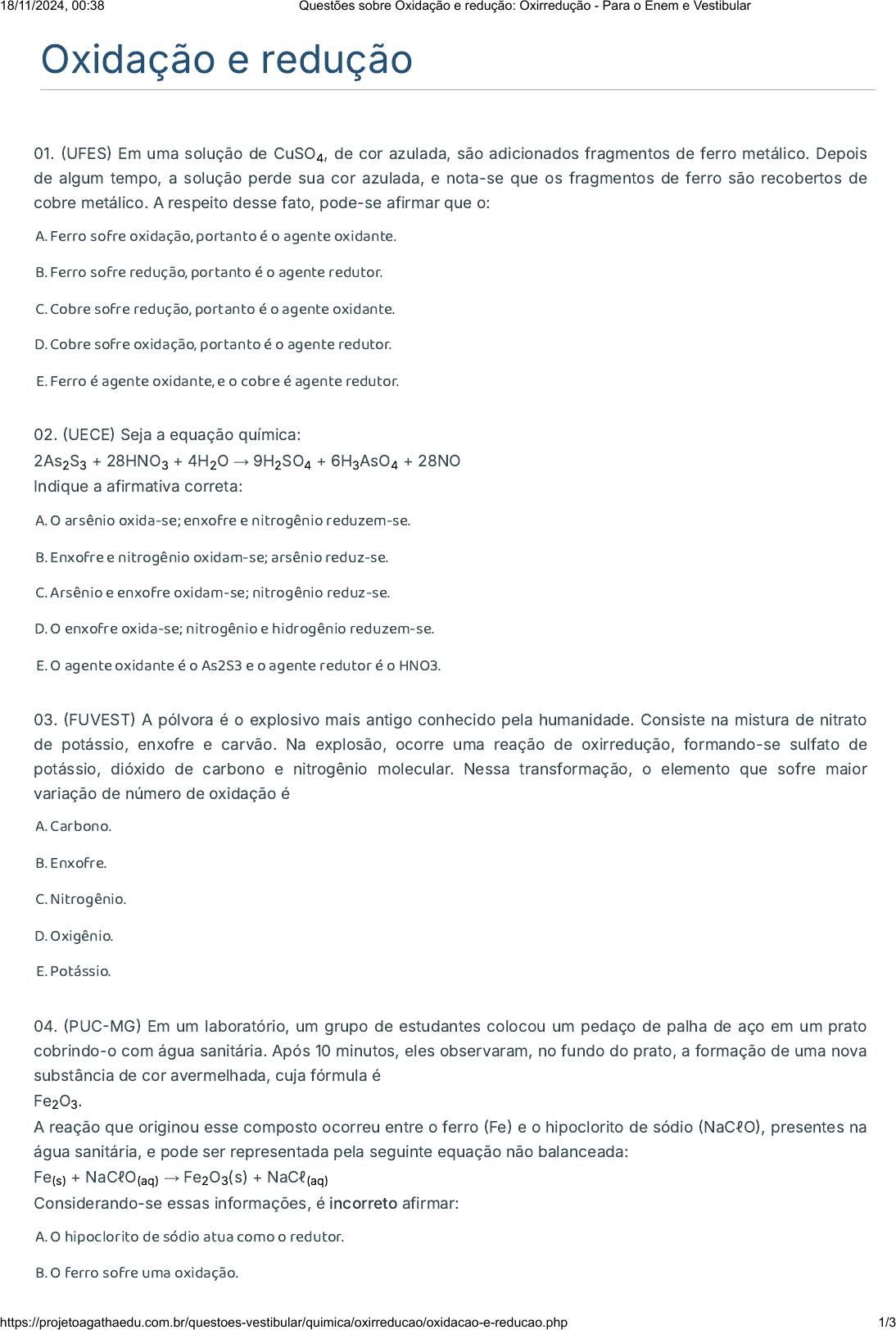 Oxidação e redução 01. �UFES� Em uma solução de CuSO , de cor azulada, são adicionados fragmentos de ferro metálico. Depois de algum tempo, a solução perde sua cor azulada, e nota-se que os fragmentos de ferro são recobertos de cobre metálico. A respeito desse fato, pode-se afirmar que o: A. Ferro sofre oxidação, portanto é o agente oxidante. B. Ferro sofre redução, portanto é o agente redutor. C. Cobre sofre redução, portanto é o agente oxidante. D. Cobre sofre oxidação, portanto é o agente redutor. E. Ferro é agente oxidante, e o cobre é agente redutor. 02. �UECE� Seja a equação química: 2As S + 28HNO + 4H O → 9H SO + 6H AsO + 28NO Indique a afirmativa correta: A. O arsênio oxida-se; enxofre e nitrogênio reduzem-se. B. Enxofre e nitrogênio oxidam-se; arsênio reduz-se. C. Arsênio e enxofre oxidam-se; nitrogênio reduz-se. D. O enxofre oxida-se; nitrogênio e hidrogênio reduzem-se. E. O agente oxidante é o As2S3 e o agente redutor é o HNO3. 03. �FUVEST� A pólvora é o explosivo mais antigo conhecido pela humanidade. Consiste na mistura de nitrato de potássio, enxofre e carvão. Na explosão, ocorre uma reação de oxirredução, formando-se sulfato de potássio, dióxido de carbono e nitrogênio molecular. Nessa transformação, o elemento que sofre maior variação de número de oxidação é A. Carbono. B. Enxofre. C. Nitrogênio. D. Oxigênio. E. Potássio. 04. �PUC�MG� Em um laboratório, um grupo de estudantes colocou um pedaço de palha de aço em um prato cobrindo-o com água sanitária. Após 10 minutos, eles observaram, no fundo do prato, a formação de uma nova substância de cor avermelhada, cuja fórmula é Fe O . A reação que originou esse composto ocorreu entre o ferro �Fe� e o hipoclorito de sódio �NaCℓO�, presentes na água sanitária, e pode ser representada pela seguinte equação não balanceada: Fe + NaCℓO → Fe O (s) + NaCℓ Considerando-se essas informações, é incorreto afirmar: A. O hipoclorito de sódio atua como o redutor. B. O ferro sofre uma oxidação. 4 2 3 3 2 2 4 3 4 2 3 (s) (aq) 2 3 (aq) 18/11/2024, 00:38 Questões sobre Oxidação e redução: Oxirredução - Para o Enem e Vestibular https://projetoagathaedu.com.br/questoes-vestibular/quimica/oxirreducao/oxidacao-e-reducao.php 1/3 C. A soma dos coe�cientes das substâncias que participam da reação é igual a 9. D. O átomo de cloro do hipoclorito de sódio ganhou 2 elétrons. 05. �PUC�RIO� O fenômeno da oxirredução ocorre em reações com transferência de elétrons. Sobre a reação do permanganato de potássio com peróxido de hidrogênio em meio ácido, representada pela equação não balanceada abaixo, uma espécie doa elétrons, e a outra recebe esses elétrons de maneira espontânea, o que pode ser verificado pela variação do número de oxidação. Sobre essa reação, é correto afirmar que: A. O manganês no permanganato de potássio tem Nox 5+. B. Permanganato de potássio é a substância oxidante. C. Ácido sulfúrico é o agente redutor. D. O oxigênio no peróxido de hidrogênio tem Nox médio 1+. E. Peróxido de hidrogênio é a substância que sofre redução. 06.�UFPA�PA� Em relação à equação de oxidação-redução balanceada: 2 Fe0 � 3 CuSO → Fe �SO ) + 3 Cu0 Pode-se afirmar que o: A. Número de oxidação do cobre no sulfato cúprico é + 1. B. Átomo de ferro perde dois elétrons. C. Cobre sofre oxidação. D. Ferro é o agente oxidante. E. Ferro sofre oxidação. 07. �FUVEST� Na produção de combustível nuclear, o trióxido de urânio é transformado no hexafluoreto de urânio, como representado pelas equações químicas: Sobre tais transformações, pode-se afirmar, corretamente, que ocorre oxirredução apenas em: A. I. B. II. C. III. D. I e II. E. I e III 08. �PUC�RS� Em relação à equação de oxidação - redução não balanceada Fe + CuSO → Fe �SO ) + Cu , pode-se afirmar que o: A. Número de oxidação do cobre no sulfato cúprico é +1. B. Átomo de ferro perde 2 elétrons. C. Cobre sofre oxidação. D. Ferro é agente oxidante. E. Ferro sofre oxidação. 4 2 4 3 0 4 2 4 3 0 18/11/2024, 00:38 Questões sobre Oxidação e redução: Oxirredução - Para o Enem e Vestibular https://projetoagathaedu.com.br/questoes-vestibular/quimica/oxirreducao/oxidacao-e-reducao.php 2/3 09. �UFRGS� A cebola, por conter derivados de enxofre, pode escurecer talheres de prata. Este fenômeno pode ser representado pela equação: 4Ag + 2H S + O → 2Ag S + 2H O A respeito deste fato, pode-se afirmar que: A. A prata sofre redução. B. A prata é o agente redutor. C. O oxigênio sofre oxidação. D. O H2S é o agente oxidante. E. O enxofre sofre redução. 10. �ITA� Na reação iônica: Ni + Cu → Ni + Cu A. O níquel é o oxidante porque ele é oxidado. B. O níquel é o redutor porque ele é oxidado. C. O íon cúprico é o oxidante porque ele é oxidado. D. O íon cúprico é o redutor porque ele é reduzido. E. Não se trata de uma reação de redox, logo não há oxidante e nem redutor. Gabarito 1.C 2.C 3.B 4.A 5.B 6.E 7.E 8.E 9.B 10.B Clique Para Compartilhar Esta Página Nas Redes Sociais Imprimir WhatsApp Facebook Twitter Pinterest Linkedin E-Mail (s) 2 (g) 2(g) 2 (s) 2 (l) (s) 2� �aq� 2� �aq� (s) 18/11/2024, 00:38 Questões sobre Oxidação e redução: Oxirredução - Para o Enem e Vestibular https://projetoagathaedu.com.br/questoes-vestibular/quimica/oxirreducao/oxidacao-e-reducao.php 3/3 https://projetoagathaedu.com.br/questoes-vestibular/quimica/oxirreducao/oxidacao-e-reducao.php https://projetoagathaedu.com.br/questoes-vestibular/quimica/oxirreducao/oxidacao-e-reducao.php https://api.whatsapp.com/send?text=Quest%C3%B5es%20sobre%20Oxida%C3%A7%C3%A3o%20e%20redu%C3%A7%C3%A3o%3A%20Oxirredu%C3%A7%C3%A3o%20-%20Para%20o%20Enem%20e%20Vestibular%20https%3A%2F%2Fprojetoagathaedu.com.br%2Fquestoes-vestibular%2Fquimica%2Foxirreducao%2Foxidacao-e-