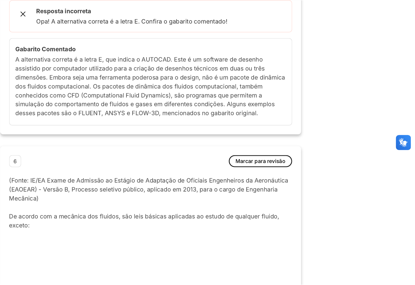 Resposta incorreta Opa! A alternativa correta é a letra E. Confira o gabarito comentado! Gabarito Comentado A alternativa correta é a letra E, que indica o AUTOCAD. Este é um software de desenho assistido por computador utilizado para a criação de desenhos técnicos em duas ou três dimensões. Embora seja uma ferramenta poderosa para o design, não é um pacote de dinâmica dos fluidos computacional. Os pacotes de dinâmica dos fluidos computacional, também conhecidos como CFD �Computational Fluid Dynamics), são programas que permitem a simulação do comportamento de fluidos e gases em diferentes condições. Alguns exemplos desses pacotes são o FLUENT, ANSYS e FLOW�3D, mencionados no gabarito original. 6 Marcar para revisão �Fonte: IE/EA Exame de Admissão ao Estágio de Adaptação de Oficiais Engenheiros da Aeronáutica �EAOEAR� - Versão B, Processo seletivo público, aplicado em 2013, para o cargo de Engenharia Mecânica) De acordo com a mecânica dos fluidos, são leis básicas aplicadas ao estudo de qualquer fluido, exceto: A B C D E Lei da conservação de massa. Primeira lei da termodinâmica. Segunda lei da termodinâmica. Lei da conservação do momento linear. Lei de conservação do momento angular. Resposta incorreta Opa! A alternativa correta é a letra C. Confira o gabarito comentado! Gabarito Comentado A alternativa correta é a letra C, que se refere à segunda lei da termodinâmica. Esta lei é fundamental para entendermos as transformações naturais ou espontâneas que ocorrem no universo, porém, ela não é aplicada diretamente no estudo da mecânica dos fluidos. A mecânica dos fluidos se concentra em aspectos como a conservação de massa, a conservação do momento linear e a conservação do momento angular, bem como a primeira lei da termodinâmica. Portanto, a segunda lei da termodinâmica é a única opção listada que não é uma lei básica aplicada ao estudo de qualquer fluido na mecânica dos fluidos.