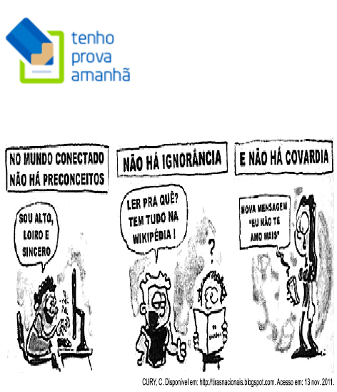 Provas ENEM Português www.tenhoprovaamanha.com.br www.tenhoprovaamanha.com.br 3 A tirinha denota a postura assumida por seu produtor frente ao uso social da tecnologia para fins de interação e de informação. Tal posicionamento é expresso, de forma argumentativa, por meio de uma atitude a) crítica, expressa pelas ironias. b) resignada, expressa pelas enumerações. c) indignada, expressa pelos discursos diretos. d) agressiva, expressa pela contra-argumentação. e) alienada, expressa pela negação da realidade. 8. (Enem 2013) Até quando? Não adianta olhar pro céu Com muita fé e pouca luta Levanta aí que você tem muito protesto pra fazer E muita greve, você pode, você deve, pode crer Não adianta olhar pro chão Virar a cara pra não ver Se liga aí que te botaram numa cruz e só porque Jesus Sofreu não quer dizer que você tenha que sofrer! GABRIEL, O PENSADOR. “Seja você mesmo (mas não seja sempre o mesmo)”. Rio de Janeiro: Sony Music, 2001 (fragmento). As escolhas linguísticas feitas pelo autor conferem ao texto a) caráter atual, pelo uso de linguagem própria da internet. b) cunho apelativo, pela predominância de imagens metafóricas. c) tom de diálogo, pela recorrência de gírias. d) espontaneidade, pelo uso da linguagem coloquial. e) originalidade, pela concisão da linguagem. 9. (Enem 2013) Capítulo LIV — A pêndula Saí dali a saborear o beijo. Não pude dormir; estirei-me na cama, é certo, mas foi o mesmo que nada. Ouvi as horas todas da noite. Usualmente, quando eu perdia o sono, o bater da pêndula fazia-me muito mal; esse tique- taque soturno, vagaroso e seco parecia dizer a cada golpe que eu ia ter um instante menos de vida. Imaginava então um velho diabo, sentado entre dois sacos, o da vida e o da morte, e a contá-las assim: — Outra de menos… — Outra de menos… — Outra de menos… — Outra de menos… O mais singular é que, se o relógio parava, eu dava-lhe corda, para que ele não deixasse de bater nunca, e eu pudesse contar todos os meus instantes perdidos. Invenções há, que se transformam ou acabam; as mesmas instituições morrem; o relógio é definitivo e perpétuo. O derradeiro homem, ao despedir-se do sol frio e gasto, há de ter um relógio na algibeira, para saber a hora exata em que morre. Naquela noite não padeci essa triste sensação de enfado, mas outra, e deleitosa. As fantasias tumultuavam- me cá dentro, vinham umas sobre outras, à semelhança de devotas que se abalroam para ver o anjo-cantor das procissões. Não ouvia os instantes perdidos, mas os minutos ganhados. ASSIS, M. Memórias póstumas de Brás Cubas. Rio de Janeiro: Nova Aguilar, 1992 (fragmento). O capítulo apresenta o instante em que Brás Cubas revive a sensação do beijo trocado com Virgília, casada com Lobo Neves. Nesse contexto, a metáfora do relógio desconstrói certos paradigmas românticos, porque a) o narrador e Virgília não têm percepção do tempo em seus encontros adúlteros. b) como “defunto autor”, Brás Cubas reconhece a inutilidade de tentar acompanhar o fluxo do tempo. c) na contagem das horas, o narrador metaforiza o desejo de triunfar e acumular riquezas. d) o relógio representa a materialização do tempo e redireciona o comportamento idealista de Brás Cubas. e) o narrador compara a duração do sabor do beijo à perpetuidade do relógio. 10. (Enem 2012) Aquele bêbado — Juro nunca mais beber — e fez o sinal da cruz com os indicadores. Acrescentou: — Álcool. O mais, ele achou que podia beber. Bebia paisagens, músicas de Tom Jobim, versos de Mário Quintana. Tomou um pileque de Segall. Nos fins de semana embebedava-se de Índia Reclinada, de Celso Antônio. — Curou-se 100% de vício — comentavam os amigos. Só ele sabia que andava bêbado que nem um gambá. Morreu de etilismo abstrato, no meio de uma carraspana de pôr do sol no Leblon, e seu féretro ostentava inúmeras coroas de ex-alcoólatras anônimos. ANDRADE, C. D. Contos plausíveis. Rio de Janeiro: Record, 1991. Provas ENEM Português www.tenhoprovaamanha.com.br www.tenhoprovaamanha.com.br 4 A causa mortis do personagem, expressa no último parágrafo, adquire um efeito irônico no texto porque, ao longo da narrativa, ocorre uma a) metaforização do sentido literal do verbo “beber”. b) aproximação exagerada da estética abstracionista. c) apresentação gradativa da coloquialidade da linguagem. d) exploração hiperbólica da expressão “inúmeras coroas”. e) citação aleatória de nomes de diferentes artistas. 11. (Enem 2012) O efeito de sentido da charge é provocado pela combinação de informações visuais e recursos linguísticos. No contexto da ilustração, a frase proferida recorre à a) polissemia, ou seja, aos múltiplos sentidos da expressão “rede social” para transmitir a ideia que pretende veicular. b) ironia para conferir um novo significado ao termo “outra coisa”. c) homonímia para opor, a partir do advérbio de lugar, o espaço da população pobre e o espaço da população rica. d) personificação para opor o mundo real pobre ao mundo virtual rico. e) antonímia para comparar a rede mundial de computadores com a rede caseira de descanso da família. 12. (Enem 2011) Lépida e leve Língua do meu Amor velosa e doce, que me convences de que sou frase, que me contornas, que me vestes quase, como se o corpo meu de ti vindo me fosse. Língua que me cativas, que me enleias os surtos de ave estranha, em linhas longas de invisíveis teias, de que és, há tanto, habilidosa aranha... [...] Amo-‐te as sugestões gloriosas e funestas, amo-‐te como todas as mulheres te amam, ó língua-‐lama, ó lingua-‐resplendor, pela carne de som que à ideia emprestas e pelas frases mudas que proferes nos silêncios de Amor!... MACHADO. G. In: MORICONI, I. (org). Os cem melhores poemas brasileiros do século. Rio de Janeiro: Objetiva, 2001 (fragmento). A poesia de Gilka Machado identifica-‐se com as concepções artí