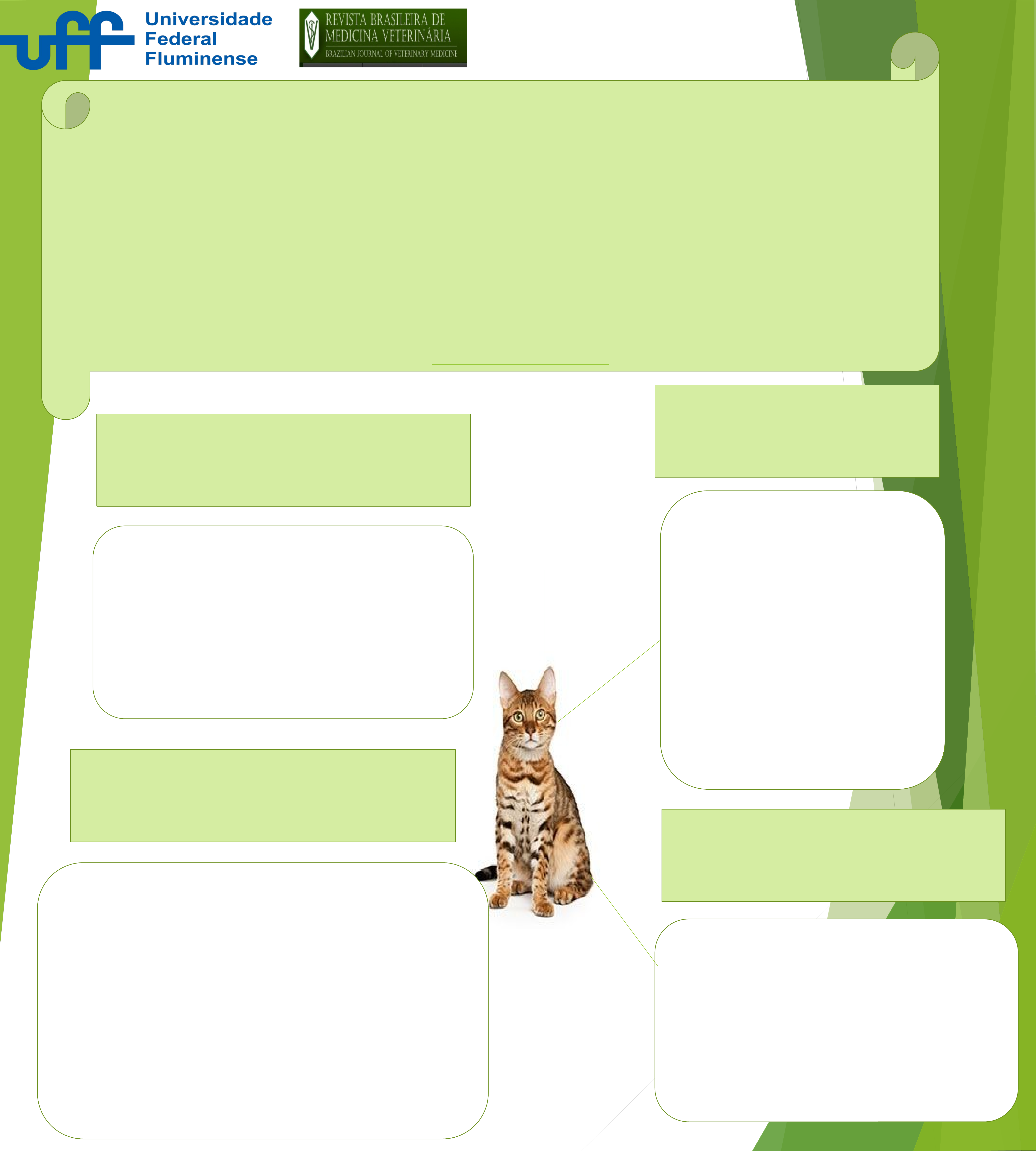 Avaliação da pressão arterial sistólica não invasiva e do grau de proteinúria em gatos domésticos diabéticos Mariana Pereira de Moura, Katia B. Corgozinho, Jacqueline Vallim J. Cavalcanti, Heloisa Justen M. de Souza, Maria Cristina N. Castro e Ana Maria Reis Ferreira Revista Brasileira de Medicina Veterinária 37(4):334-338, 2015. Setor de Clínica e Patologia Veterinária, Faculdade de Veterinária, Universidade Federal Fluminense, Rua Vital Brasil, 64, Niterói, RJ 24230-340, Brazil. E-mail: marivuff@yahoo.com.br Objetivo Avaliar a pressão arterial sistólica não invasiva e a proteinúria em gatos já diabéticos possibilitando a observação das alterações no corpo. Materiais e Métodos Resultados Principais Conclusão Sobrepeso e obesidade foram os scores mais observados em animais diabéticos Proteinúria foi encontrada em 5 pacientes A frutosamina teve correlação positiva e significante com a pressão arterial sistólica(PAS) indicando que quanto maior o descontrole glicêmico, maior a PAS. Foram utilizados 17 gatos domésticos diabéticos Exames laboratoriais completos foram realizados A pressão arterial foi determinada com a média de 5 avaliações feitas a cada 5 minutos. Recomenda-se a avaliação da pressão arterial sistólica em felinos diabéticos para que o diagnóstico de doenças relacionadas a proteinúria e hipertensão ocorra precocemente antes de acometer os órgãos. 1 image1.png image2.png image3.jpg