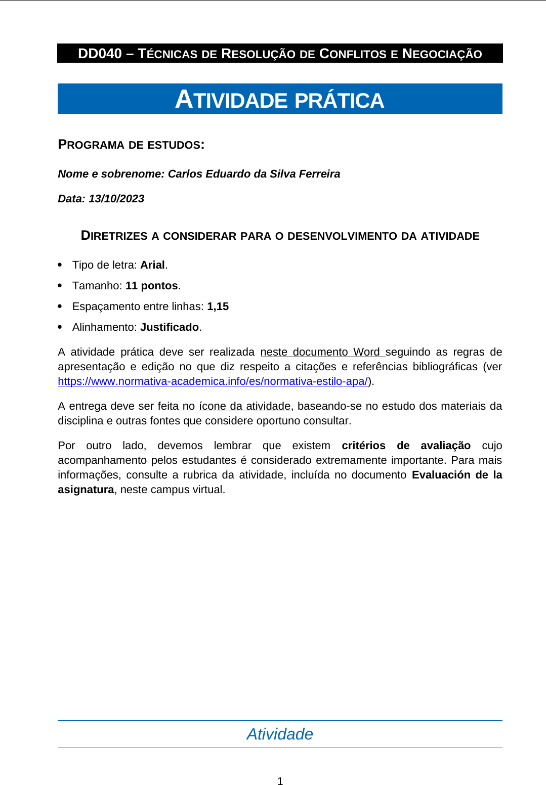 DD040 – TÉCNICAS DE RESOLUÇÃO DE CONFLITOS E NEGOCIAÇÃO ATIVIDADE PRÁTICA PROGRAMA DE ESTUDOS: Nome e sobrenome: Carlos Eduardo da Silva Ferreira Data: 13/10/2023 DIRETRIZES A CONSIDERAR PARA O DESENVOLVIMENTO DA ATIVIDADE Tipo de letra: Arial. Tamanho: 11 pontos. Espaçamento entre linhas: 1,15 Alinhamento: Justificado. A atividade prática deve ser realizada neste documento Word seguindo as regras de apresentação e edição no que diz respeito a citações e referências bibliográficas (ver https://www.normativa-academica.info/es/normativa-estilo-apa/). A entrega deve ser feita no ícone da atividade, baseando-se no estudo dos materiais da disciplina e outras fontes que considere oportuno consultar. Por outro lado, devemos lembrar que existem critérios de avaliação cujo acompanhamento pelos estudantes é considerado extremamente importante. Para mais informações, consulte a rubrica da atividade, incluída no documento Evaluación de la asignatura, neste campus virtual. Atividade 1This study source was downloaded by 100000842215225 from collegesidekick.com on 11-12-2024 04:27:47 GMT -06:00 https://www.collegesidekick.com//study-docs/7367357 https://www.collegesidekick.com//study-docs/7367357 1. Em uma negociação em nível corporativo, o que importa é ganhar a qualquer custo. Reflita sobre se você é a favor ou contra este julgamento e compartilhe alguma experiência a respeito (extensão da resposta entre 250 e 300 palavras). R: Em um primeiro momento isso parece ser o correto, mas entendemos que em um cenário atual, a relação de Colaboração, Cooperação, com um proposito de “ganhar- ganhar” faz mais sentido para um modelo de negócio, principalmente a longo prazo uma vez que ambos os lados saem ganhando. Em minha experiencia, construir um relacionamento saudável com seu parceiro, fornecedor ou cliente, depende claramente de um cenário “Ganhar-Ganhar”, onde ambos passam a contar com o outro para um modelo de negócio duradouro, garantindo planejamento financeiro, fornecimento de insumos e garantia de estoque, bem como um caixa financeiro mais saudável para ambas as empresas participantes. 2. Em um mecanismo de busca de textos científicos (EBSCO, Google Scholar, etc.) 3 artigos refletindo os últimos avanços e descobertas sobre Conflitos e Negociação, elaborando uma análise do assunto (extensão da resposta entre 250 e 300 palavras). R: Artigos escolhidos: Efeito da cultura de conflitos na negociação interna (2020) Fonte: https://repositorio.iscte-iul.pt/bitstream/10071/21709/1/Master_Maria_Gentil_Pimentel. pdf COMUNICAÇÃO, CONFLITOS E NEGOCIAÇÃO: UMA PERSPETIVA TEÓRICA E IMPLICAÇÕES PRÁTICAS (2021) Fonte: https://repositorium.sdum.uminho.pt/bitstream/1822/85946/1/1-Artigo- Comunica%20e%20gest%20confl-R%20Gomes-Rev%20Psicologia%20Aplicada.pdf Conflitos e negociações nas organizações: um estudo de casos: na Empresa Kaizen do Brasil LTDA 2This study source was downloaded by 100000842215225 from collegesidekick.com on 11-12-2024 04:27:47 GMT -06:00 https://www.collegesidekick.com//study-docs/7367357 https://www.collegesidekick.com//study-docs/7367357 Fonte: https://ojs.brazilianjournals.com.br/ojs/index.php/BRJD/article/view/34552/pdf Acima os 3 artigos que irão nortear o tema, com base nos estudos, podemos destacar alguns pontos-chave sobre a evolução nos estudos a cerca da Resolução de Conflitos e Negociação. No estudo Conflitos e negociações nas organizações: um estudo de casos: na Empresa Kaizen do Brasil LTDA, em sua conclusão, é citado: “Concluímos também quepara conduzir estas mudanças as maturidades da liderança e da chefia podem minimizar, podem evitar ou mesmo ampliar os conflitos que são provindos de uma transformação.”, onde mais uma vez temos como pilar uma Gestão Efetiva, de forma, a guiar o conflito e a resolução do mesmo pelo caminho menos tortuoso. Ainda sobre o estudo, fica claro que a falta de comunicação foi o ponto central do problema, onde as equipes/setores buscavam atender seus próprios objetivos ao invés do objetivo comum da empresa. Por fim, fica entendido que a comunicação, para alinhamento dos setores é o fator chave para a resolução e ficarmos atentos aos aspectos geradores dos conflitos, a fim de minimizá-los antes de se inflamarem. “De facto, sem comunicação e sem uma boa capacidade de gestão de conflitos, a vida em sociedade seria muito difícil, se não mesmo impraticável.” (GOMES, Antonio. 2021) Sob esta perspectiva, fica evidente também que o ponto central, torna-se sempre a Comunicação, como meio para evitar e reduzir os conflitos. Já a Gestão de Conflitos e Negociação, em suma é um processo complexo, que em geral exige muito das partes, para que sua conclusão ocorra de forma saudável, requerendo um esforço das partes para que ocorra um cenário onde ambos os lados possam sair com ganhos e não ocorra perdas significativas. Gomes (2021) ainda ressalta que “um gestor de conflitos e negociador implica possuir, no mínimo, três competências: dominar bem o assunto em debate, dominar os estilos de gestão de conflitos e de negociação e, acima de tudo, ser genuíno e fraterno na relação estabelecida com a outra parte”, com isso retomamos os pilares para a Estratégia da Gestão de Conflitos que são: Comunicação Efetiva, Negociação, Mediação, Arbitragem e Liderança Efetiva. Conforme Pimentel cita em seu artigo: “O conflito expressa-se nas organizações nas mais diferentes formas, as quais obviamente têm diferentes causas e, por conseguinte, implicam capacidades de gestão em conformidade. Assim, cada situação específica de conflito, tem elementos contextuais que a enquadram e apelam a estratégias diferenciadas de gestão do conflito (Simões, 2020).”, novamente temos o ponto como Comunicação sendo um dos pilares para a gestão de conflitos. “O facto de um colaborador experienciar um sentimento de justiça pode minimizar 