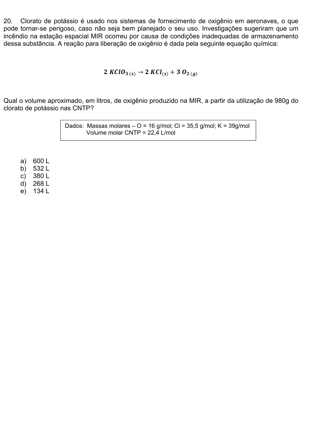 SSA – 2ª Fase 2º Dia Página 14 20. Clorato de potássio é usado nos sistemas de fornecimento de oxigênio em aeronaves, o que pode tornar-se perigoso, caso não seja bem planejado o seu uso. Investigações sugeriram que um incêndio na estação espacial MIR ocorreu por causa de condições inadequadas de armazenamento dessa substância. A reação para liberação de oxigênio é dada pela seguinte equação química: → Qual o volume aproximado, em litros, de oxigênio produzido na MIR, a partir da utilização de 980g do clorato de potássio nas CNTP? a) 600 L b) 532 L c) 380 L d) 268 L e) 134 L Dados: Massas molares – O = 16 g/mol; Cl = 35,5 g/mol; K = 39g/mol Volume molar CNTP = 22,4 L/mol