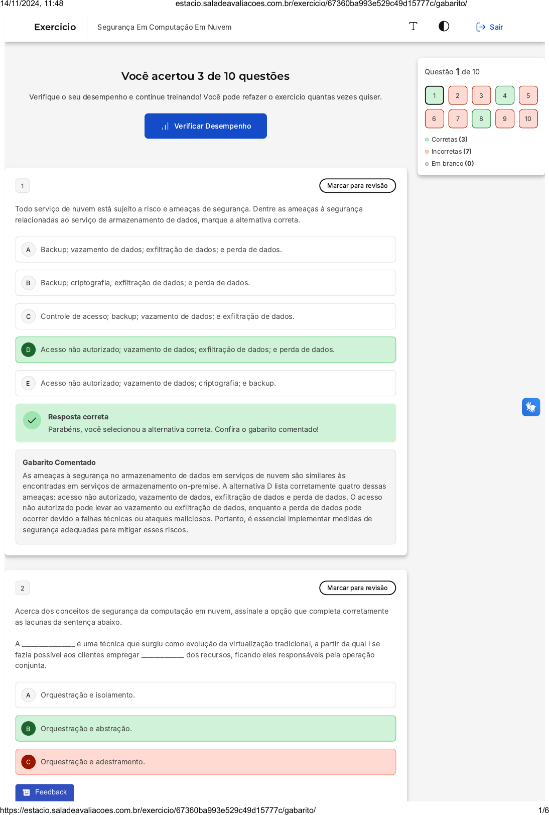 Você acertou 3 de 10 questões Verifique o seu desempenho e continue treinando! Você pode refazer o exercício quantas vezes quiser. Verificar Desempenho A B C D E A B C 1 Marcar para revisão Todo serviço de nuvem está sujeito a risco e ameaças de segurança. Dentre as ameaças à segurança relacionadas ao serviço de armazenamento de dados, marque a alternativa correta. Backup; vazamento de dados; exfiltração de dados; e perda de dados. Backup; criptografia; exfiltração de dados; e perda de dados. Controle de acesso; backup; vazamento de dados; e exfiltração de dados. Acesso não autorizado; vazamento de dados; exfiltração de dados; e perda de dados. Acesso não autorizado; vazamento de dados; criptografia; e backup. Resposta correta Parabéns, você selecionou a alternativa correta. Confira o gabarito comentado! Gabarito Comentado As ameaças à segurança no armazenamento de dados em serviços de nuvem são similares às encontradas em serviços de armazenamento on-premise. A alternativa D lista corretamente quatro dessas ameaças: acesso não autorizado, vazamento de dados, exfiltração de dados e perda de dados. O acesso não autorizado pode levar ao vazamento ou exfiltração de dados, enquanto a perda de dados pode ocorrer devido a falhas técnicas ou ataques maliciosos. Portanto, é essencial implementar medidas de segurança adequadas para mitigar esses riscos. 2 Marcar para revisão Acerca dos conceitos de segurança da computação em nuvem, assinale a opção que completa corretamente as lacunas da sentença abaixo. A ________________ é uma técnica que surgiu como evolução da virtualização tradicional, a partir da qual l se fazia possível aos clientes empregar _____________ dos recursos, ficando eles responsáveis pela operação conjunta. Orquestração e isolamento. Orquestração e abstração. Orquestração e adestramento. Questão 1 de 10 Corretas �3� Incorretas �7� Em branco �0� 1 2 3 4 5 6 7 8 9 10 Exercicio Segurança Em Computação Em Nuvem Sair Feedback 14/11/2024, 11:48 estacio.saladeavaliacoes.com.br/exercicio/67360ba993e529c49d15777c/gabarito/ https://estacio.saladeavaliacoes.com.br/exercicio/67360ba993e529c49d15777c/gabarito/ 1/6 D E A B C D E Segregação e isolamento. Segregação e abstração. Resposta incorreta Opa! A alternativa correta é a letra B. Confira o gabarito comentado! Gabarito Comentado A abstração é a técnica que faz com que o provedor abstraia os recursos de infraestrutura física para criar o pool de recursos. Diferente da antiga visão da virtualização pura, os serviços de nuvem utilizam a orquestração para coordenar a montagem e entrega do pool de recursos para os clientes. 3 Marcar para revisão Leia as afirmativas a seguir: I � O serviço de contêiner é mais rápido, mais enxuto e mais portável que o serviço de máquina virtual. II � Tanto o serviço de contêiner quanto o de máquina virtual são exemplos do emprego de virtualização. III � O Docker é um exemplo de serviço de conteinerização. Marque a alternativa correta. Apenas a I está correta. Apenas a II está correta. Apenas a I e III estão corretas. Apenas a II e III estão corretas. I, II e III estão corretas. Resposta incorreta Opa! A alternativa correta é a letra E. Confira o gabarito comentado! Gabarito Comentado As três afirmativas estão corretas. A primeira afirmação destaca as vantagens do serviço de contêiner em relação ao de máquina virtual, sendo este mais rápido, enxuto e portável. A segunda afirmação ressalta que ambos, o serviço de contêiner e o de máquina virtual, são exemplos de tecnologias que empregam a virtualização. Por fim, a terceira afirmação menciona o Docker como um exemplo de serviço de conteinerização, que é uma tecnologia amplamente utilizada no mercado de TI. 4 Marcar para revisão Das cinco características essenciais dos serviços em nuvem, qual delas refere-se à capacidade do cliente poder, por conta própria, provisionar o hardware, selecionar um sistema operacional e outros sistemas a ser instalado no ambiente, tudo com pouco esforço de recurso humano e tempo? 14/11/2024, 11:48 estacio.saladeavaliacoes.com.br/exercicio/67360ba993e529c49d15777c/gabarito/ https://estacio.saladeavaliacoes.com.br/exercicio/67360ba993e529c49d15777c/gabarito/ 2/6 A B C D E A B C D E Resource Pooling. Broad Network Access. Rapid Elastic. On-Demand Self-Service. Measured Service. Resposta correta Parabéns, você selecionou a alternativa correta. Confira o gabarito comentado! Gabarito Comentado A alternativa correta é "On-Demand Self-Service". Esta característica dos serviços em nuvem permite que o cliente possa, de maneira autônoma, provisionar o hardware, escolher um sistema operacional e outros sistemas para serem instalados no ambiente. Isso tudo é feito com mínimo esforço de recursos humanos e tempo, graças às facilidades oferecidas pelos provedores de serviços em nuvem. Portanto, o "On-Demand Self-Service" é a característica que melhor descreve a capacidade do cliente de gerenciar seus próprios recursos de maneira eficiente e autônoma. 5 Marcar para revisão Com relação aos serviços comerciais nos três principais provedores de serviços em nuvem, AWS, Azure e GCP, marque a alternativa correta. AWS Elastic Beanstalk, Azure Web Apps e Google App Engine são exemplos de SaaS. AWS Elastic Beanstalk, Azure Web Apps e Google App Engine são exemplos de IaaS. AWS Elastic Beanstalk, Azure Web Apps e Google App Engine são exemplos de PaaS. Microsoft Office 365 e Google Workspace são um exemplo de IaaS. Google Kubernetes Engine é a implementação do GCP para funções como serviço (serverless). Resposta incorreta Opa! A alternativa correta é a letra C. Confira o gabarito comentado! Gabarito Comentado Na categoria PaaS �Platform as a Service), o cliente tem a possibilidade de importar código e executá-lo dentro de um ambiente gerenciado. Os principais exemplos