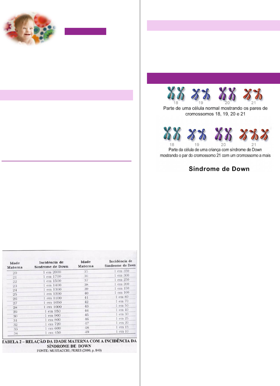 Monitora: Ana Tereza Neurofuncional Saúde da Criança INTRODUÇÃO:Síndrome genética mais comum nos RN, Trissomia do 21 (47 cromossomos). As crianças com síndrome de Down apresentam retardo do desenvolvimento físico e mental, cabeça e face com traços específicos e, frequentemente, baixa estatura. INCIDÊNCIA: • Ocorre em todas as raças/sexos; • 65% a 85% das concepções resultam em aborto espontâneo • Risco aumentado com o avanço da idade materna(>35 anos ) CARACTERÍSTICAS DA SÍNDROME • Antes do nascimento, a síndrome de Down pode ser suspeitada com base no ultrassom ou em testes no sangue da mãe e confirmada usando amostras de vilosidades coriônicas e/ou amniocentese. • Após o nascimento, o diagnóstico é sugerido pela aparência física da criança e é confirmado ao encontrar uma cópia extra do cromossomo 21, geralmente ao examinar uma amostra de sangue. • Não existe cura para a síndrome de Down, mas alguns sintomas e problemas específicos causados pela síndrome podem ser tratados. • A maioria das crianças com síndrome de Down sobrevive até a idade adulta. ASPECTOSCITOGENÉTICOS • Acidente Genético 47 cromossomos • Trissomia do 21 • Translocação:13, 14, 15 ou 21 • Mosaicismo SÍNDROME DE DOWN: TRISSOMIA 21 • Cromossomos são estruturas dentro das células que contêm DNA e muitos genes. Os genes são segmentos de ácido desoxirribonucleico (DNA) que contêm o código para uma proteína específica que funciona em um ou mais tipos de células no organismo. Os genes contêm instruções que definem como deve ser a aparência e o funcionamento do corpo. (Consulte Genes e cromossomos para uma discussão sobre genética.) • Um cromossomo extra, somando três o mesmo cromossomo (em vez dos dois normais), é chamado trissomia. • A trissomia mais comum em um recém-nascido é a trissomia 21 (um cromossomo 21 extra, que é o menor cromossomo humano). Um embrião pode ter trissomia de qualquer cromossomo; contudo, uma cópia extra de um dos cromossomos maiores tende a terminar em aborto espontâneo ou natimorto • Presente em 95% das pessoas com síndrome; • Fator de risco: Idade materna avançada(>35anos); Monitora: Ana Tereza Neurofuncional Saúde da Criança TRANSLOCAÇÃO ➢ A translocação é outro tipo de alteração estrutural cromossômica. Ela ocorre por meio da incorporação de uma porção cromossômica a um cromossomo não homólogo. ➢ Excesso de Material genético é translocado para outro cromossomo(13,14,15 ou 21) ➢ Numero normal de cromossomos(46) ➢ Não há relação entre translocação e idade materna ➢ Risco de recorrência : Genitor M- 3%F- 12% ➢ Não existe diferença fenotípica entre a trissomia livre e a translocação MOSAICISMO O mosaicismo acontece quando o erro ocorre em uma divisão celular posteriormente à formação do zigoto (não disjunção mitótica nas primeiras divisões), ou seja, o indivíduo recebeu 23 cromossomos do pai e 23 da mãe, porém, em algum momento, ocorre a não- disjunção do par de cromossomos 21 em uma de suas células – ela e o produto de suas divisões – passam a ter 47 cromossomos. Assim, apenas uma parte das células do corpo do indivíduo serão normais e outras apresentarão um cromossomo 21 a mais. Corresponde a 1,5% dos portadores. SINAIS CLÁSSICOS: 1. Hipotonia/Frouxidão ligamentar/flexibilidade 2. Baixo peso ao nascer 3. Crânio Pequeno e occipital achatado 4. Face redonda com perfil plano 5. Fissura palpebrais obliquas dirigidas para cima 6. Pescoço curto e com excesso de pele 7. Membro curtos ANORMALIDADES DO SISTEMA NERVOSO • Diminuição do peso e do tamanho total do encéfalo • Redução do numero de sulcos • Falta de Mielinização ou atraso da mielinização ( entre os 2 meses e os 6 anos de idade) • Atraso Global – Plasticidade neural Monitora: Ana Tereza Neurofuncional Saúde da Criança DESENVOLVIMENTO COGNITIVO (INTELECTUAL) Crianças com síndrome de Down costumam apresentar atrasos no desenvolvimento de habilidades motoras e linguísticas, mas isto varia. Um comportamento sugestivo de transtorno do déficit de atenção/hiperatividade costuma ser visto na infância. As crianças com síndrome de Down correm maior risco de comportamento autista, especialmente aquelas com deficiência intelectual grave. Existe um risco aumentado de depressão em adultos e de depressão em crianças. DIAGNÓSTICO DA SÍNDROME DE DOWN • Antes do nascimento, ultrassonografia do feto ou exames de sangue na mãe • Antes do nascimento, amostragem das vilosidades coriônicas, amniocentese ou ambas • Após o nascimento, a aparência do bebê e exames de sangue no bebê OBJETIVODAINTERVENÇÃOFISIOTERAPÊUTICA 1. Diminuir os atrasos da motricidade ampla e fina 2. Promover o controle corporal antigravitacional sustentação de peso 3. Facilitar e estimular as reações corporais e posturais necessárias para o desempenho das etapas de desenvolvimento normal 4. Manter o alinhamento biomecânico prevenindo as instabilidades e o mal alinhamento dos segmentos corporais AVALIAÇÃO FISIOTERAPÊUTICA A avaliação fisioterapêutica tem como objetivo básico a avaliação do desenvolvimento neuropsicomotor e como objetivos específicos os aspectos inerentes do desenvolvimento motor, tais como: • tônus; • reflexo • postura • torça muscular. • arco de movimento • qualidade de execução das atividades funcionais TRATAMENTO (VER ARTIGO DO SECAD) Monitora: Ana Tereza Neurofuncional Saúde da Criança