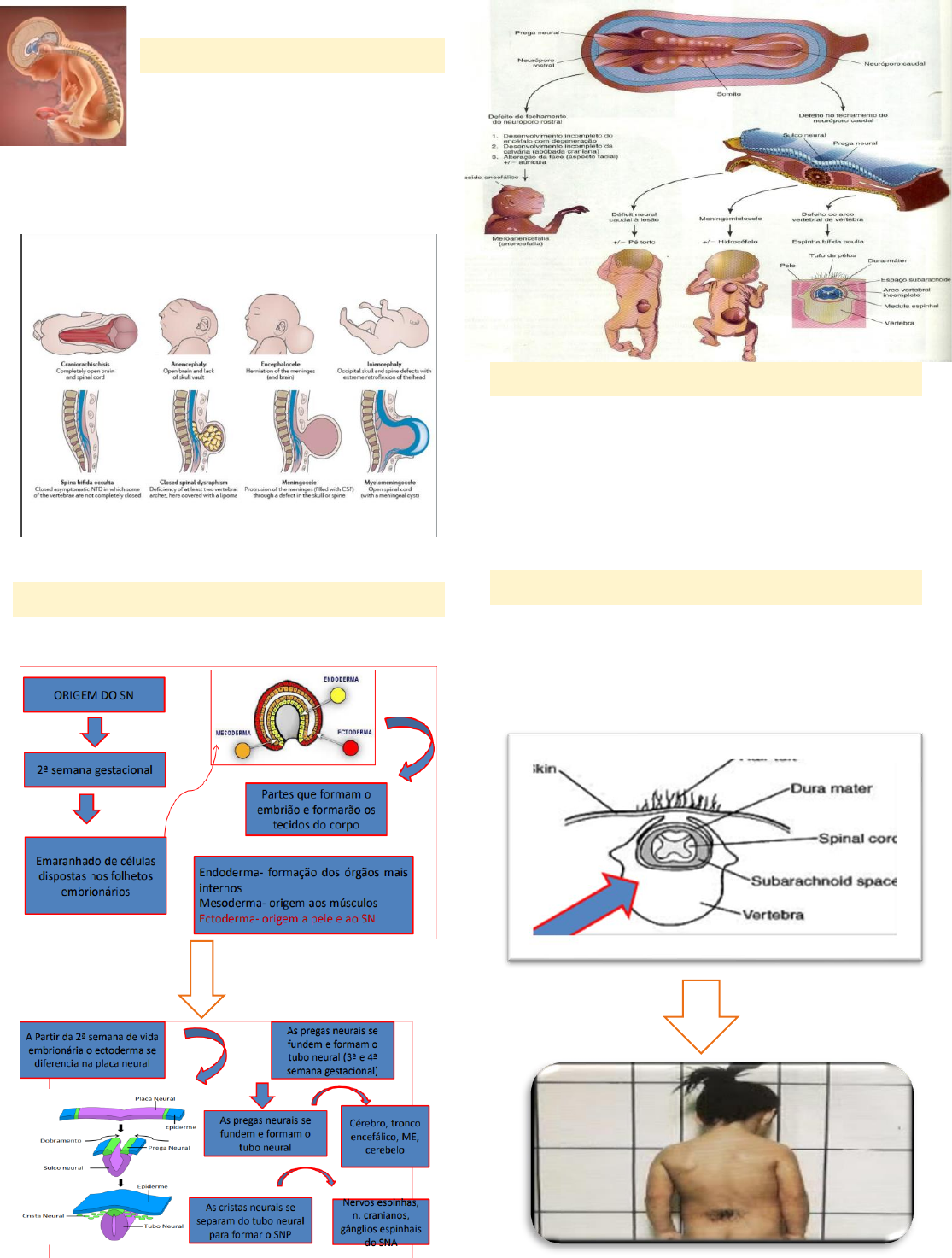 ESPINHA BÍFIDA INTRODUÇÃO Os defeitos de fechamento do tubo neural (DFTN) são malformações congênitas devido a uma falha no fechamento do TN, durante a quarta semana de embriogênese. EMBRIOLOGIA DO SN CLASSIFICAÇÃO DO DFTN • Anencefalia • Encefalocele • Espinha Bífida( Oculta • Espinha Bífida Aberta ( Meningocele- Mielomeningocele) ESPINHA BÍFIDA OCULTA Falha na fusão óssea dos arcos vertebrai posteriores. Os elementos nervosos permanecem dentro do canal vertebral. Pode ter um sinal indireto que é uma coleção de pelos ou uma pequena cicatriz cutânea. ESPINHA BÍFIDA CÍSTICA Se o saco contém meninges junto com o líquido cérebro-espinhal, a anomalia é chamada MENINGOCELE ESPINHA BÍFIDA ABERTA Se o saco contém medula espinhal e/ou raízes nervosas, a anomalia é chamada de espinha bífida com MIELOMENINGOCELE MIELOMENINGOCELE A mielomeningocele é um tipo grave de espinha bífida,resultante do fechamento inadequado do tubo neural A medula espinal e as meninges ficam contidas na bolsa cística; ETIOLOGIA: ETIOLOGIA MULTIFATORIAL FATORES GENÉTICOS (MTHFR), FATORES AMBIENTAIS, • Baixo nível socioeconômico • Hipertermia • Medicação anticonvulsivante • Fatores nutricionais ACIDO FÓLICO • Gravidez prévia com DFTN • Diabetes mellitus INCIDÊNCIA • Mundial 1:1000 • América do Sul – Brasil 1,5:1000 nascidos vivos • Mais frequente no sexo feminino e raça branca • Quanto incidência PREVENÇÃO DOS DFTN • Adição do Ácido Fólico às farinhas de trigo e de milho(4mg/dia); • Dose maior para as que tiveram gestação anterior com • defeito do tubo neural, diabetes e epilépticas em uso de medicação; • A ingesta deve ser no período pré e periconcepcional; • Afastamento de substâncias tóxicas e cautela no uso • drogas anticonvulsivantes. DIAGNÓSTICO PRÉ-NATAL: Ultrassonografia Fetal , Amniocentese: Dosagem e alfa- fetoproteina (14º-16º IG) PÓS-NATAL: Achados Clínicos QUADRO CLINICO: DÉFICIT MOTOR E SENSORIAL • Paralisia flácida- hipotonia • Fraqueza muscular • Diminuição ou abolição dos reflexos • Deformidades ortopédicas • Bexiga /intestino Neurogênicos • Hidrocefalia (80 a 90% casos) • Problemas de mobilidade e autocuidado • Atraso nas aquisições motoras • Distúrbio cognitivo (atenção, memória, comportamento) • Osteoporose • Úlceras de pressão • Obesidade • Baixa estatura • Alteração da função sexual PROBLEMAS ORTOPÉDICOS As deformidades podem ser congênitas ou adquiridas: • Escoliose /Cifose/ Hiperlordose • Luxação de quadril • Deformidade em flexão,abdução e RE do quadril • Deformidade em flexão de joelho •Pé equino, equino-varo, equino-valgo, calcâneo… DEFORMIDADES DO TRONCO: CIFOSE CONGÊNITA; ESCOLIOSE; HIPERLORDOSE LOMBAR DEFORMIDADES DOS MMII • QUADRIL : FLEXÃO, ABDUÇÃO E ROTAÇÃO EXTERNA;LUXAÇÃO OU SUBLUXAÇÃO • PÉS: EQUINO VARO; EQUINO; CALCÂNEO PLANO; CALCÂNEO VALGO PROBLEMAS NEUROLÓGICOS HIDROCEFALIA ➢ Presente em 85% a 90% das crianças ➢ É o acumulo excessivo de LCR nos ventrículos cerebrais, resultando em dilatação ventricular progressiva. ➢ Pode ocorrer no período pré-natal ou pós natal MANIFESTAÇÕES CLÍNICAS DA HIDROCEFALIA • Rápido aumento do Perímetro cefálico; • Fontanela abaulada/separação de suturas; • Hipertensão intracranial; • Irritabilidade; • Sonolência excessiva; • Perda de apetite e vômito frequente; • Diminuição do rendimento escolar. • Choro constante e agudo • Crises convulsivas • Cefaleia • Opistótono • Olhar em sol poente PROBLEMAS NEUROLÓGICOS 2. MALFORMAÇÃO DE ARNOLD CHIARI Está presente em quase todas as crianças com mielomeningocele Principal causa de Hidrocefalia Deslocamento do vérmis e hemisférios cerebelares, juntamente com ponte, bulbo e 4º ventrículo em direção ao canal espinhal superior. MEDULA PRESA (ANCORADA) A medula espinal normal encontra-se solta dentro do canal vertebral, envolvida pelo LCR.Quando a medula apresenta uma aderência, ela fica presa, susceptível a lesões por micro impactos. MEDULA PRESA (ANCORADA) Caracteriza-se pela fixação do filo terminal da medula na dura-máter, causando um estiramento mecânico da medula que gera déficit neurológico progressivo conforme a criança cresce .Apresentação clinica ocorre entre 2 -8 anos Segundo pico entre 10-12 anos. BEXIGA NEUROGÊNICA 90% dos casos • Lesão tóraco lombar- bexiga reflexa (arcos reflexos mantidos) • Lesão sacral – flácida- leva a incontinência urinária, infecções de repetição, refluxo vesicouretral, pielonefrite. NÍVEL NEUROLÓGICO DA LESÃO O déficit motor e sensitivo variam de acordo com o nível e a extensão da lesão • Nas crianças acima de 5 anos os níveis tanto motor quanto sensitivo podem ser determinados com mais precisão. O déficit motor e sensitivo variam de acordo com o nível e a extensão da lesão PROGNÓSTICO DE MARCHA • A função motora presente é o fator mais importante para predizer um prognóstico de marcha. • Fatores que influenciam no prognóstico de marcha: • Idade • Peso corporal • Nível sensitivo • Deformidades • Função dos MMSS • Cognição • Equilíbrio na posição sentada NÍVEL MOTOR TEM ÍNTIMA RELAÇÃO COM O PROGNÓSTICO DE MARCHA ✓ Deambulação dependerá: ✓ Níveis medulares preservados ✓ Nível Intelectual ✓ Deformidades ✓ Peso ✓ Motivação ✓ Condições socioeconômicas ✓ Suporte Terapêutico e familiar PROGNÓSTICO DE MARCHA A função motora presente é o fator mais importante para predizer um prognóstico de marcha. Fatores que influenciam no prognóstico de marcha: ➢ Idade ➢ Peso corporal ➢ Nível sensitivo ➢ Deformidades ➢ Função dos MMSS ➢ Cognição ➢ Equilíbrio na posição sentada Bom prognóstico de marcha: • Bom equilíbrio de gato na posição gato e joelho; • Força de glúteo médio e máximo maior ou igual a 3 N
