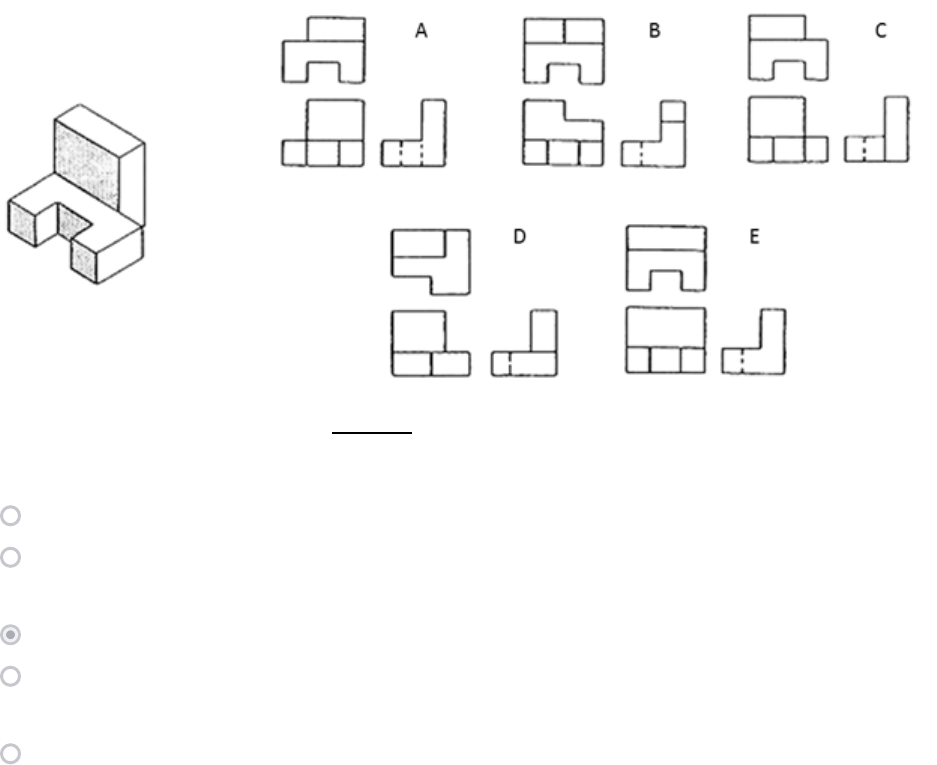 …Pontuação desta tentativa: 21 de 30 Enviado 13 de jun de 2021 em 19:57 Esta tentativa levou 16 minutos. Pergunta 1 0 / 3 pts B; E. Você respondeu A; D; Resposta correta C; Pergunta 2 3 / 3 pts Seja a peça mostrada abaixo, junto com uma série de conjuntos de três vistas ortográficas. Considerando as projeções no terceiro diedro, marque a opção que representa corretamente o conjunto de três vistas ortográficas (vistas frontal, lateral direita e superior) da peça mostrada. Seja a peça mostrada abaixo, junto com uma série de conjuntos de três vistas ortográficas. Firefox https://dombosco.instructure.com/courses/4129/quizzes/18118/history?... 1 of 8 18/11/2024, 14:48 Correto! E D A B C Pergunta 3 3 / 3 pts A-II; B-IV; C-I: D-III; E-V A-III; B-V; C-I: D-IV; E-II. Considerando as projeções no primeiro diedro, marque a opção que representa corretamente o conjunto de três vistas ortográficas (vistas frontal, lateral esquerda e superior) da peça mostrada. Seja a tabela abaixo. Marque a opção com as associações corretas. Firefox https://dombosco.instructure.com/courses/4129/quizzes/18118/history?... 2 of 8 18/11/2024, 14:48 A-V; B-III; C-I: D-II; E-IV A-III; B-V; C-II: D-I; E-IV Correto! A-III; B-V; C-I: D-II; E-IV Pergunta 4 0 / 3 pts (A)-V; (B)-IV; (C)-I; (D)-II; (A)-II; (B)-VI; (C)-I; (D)-III; (A)-I; (B)-IV; (C)-III; (D)-II. Resposta correta (A)-V; (B)-VI; (C)-I; (D)-II; Você respondeu Seja a figura abaixo e a lista de construções geométricas na sequência. I.Construção de perpendicular. II.Construção de paralela. III.Divisão de segmento. IV.Obtenção de bissetriz não tendo o vértice. V.Construção de mediatriz. VI.Obtenção de bissetriz tendo o vértice. Firefox https://dombosco.instructure.com/courses/4129/quizzes/18118/history?... 3 of 8 18/11/2024, 14:48 (A)-I; (B)-VI; (C)-I; (D)-II; Pergunta 5 3 / 3 pts A: Vista Frontal; B: Vista Lateral Direita; E: Vista Superior; F: Vista Inferior; C: Vista Lateral Direita; D: Vista Posterior; E: Vista Inferior; F: Vista Superior. A: Vista Frontal; B: Vista Lateral Esquerda; C: Vista Lateral Direita; D: Vista Posterior; B: Vista Frontal; C: Vista Lateral Esquerda; D: Vista Lateral Direita; F: Vista Posterior; Correto! A: Vista Lateral Direita; B: Vista Frontal; C: Vista Lateral Esquerda; E: Vista Inferior; Pergunta 6 3 / 3 pts Vistas ortográficas são obtidas a partir de projeções planas nas faces internas de um cubo imaginário no primeiro ou no terceiro diedro, o qual é planificado através do processo de rebatimento. Considerando o resultado desse rebatimento no primeiro diedro (objeto entre o observador e o plano de projeção), a figura abaixo é obtida. Marque a opção que define corretamente as vistas ortográficas no primeiro diedro. Sejam as três vistas ortográficas e as peças mostradas abaixo. Firefox https://dombosco.instructure.com/courses/4129/quizzes/18118/history?... 4 of 8 18/11/2024, 14:48 C; E. B; D; Correto! A; Pergunta 7 3 / 3 pts 1:50; 1:2; 1:5; Correto! 1:100. 1:10; Pergunta 8 3 / 3 pts Considerando as projeções no primeiro diedro, marque a opção que representa corretamente a peça representadas pelas três vistas ortográficas (vistas frontal, lateral esquerda e superior) apresentadas. A Planta baixa (vista superior) de uma edificação de formato circular, com raio externo medindo 8 metros, foi desenhada numa folha A4 que já continha margem conforme as normas da ABNT. A escala utilizada para esse desenho foi: Sejam as vistas ortográficas de uma peça abaixo. Firefox https://dombosco.instructure.com/courses/4129/quizzes/18118/history?... 5 of 8 18/11/2024, 14:48 Correto! Marque a opção que representa corretamente a peça que geras as vistas acima. Firefox https://dombosco.instructure.com/courses/4129/quizzes/18118/history?... 6 of 8 18/11/2024, 14:48 Pergunta 9 0 / 3 pts Vista frontal: A; Vista lateral esquerda: H; Vista superior: E; Você respondeu Vista frontal: D; Vista lateral esquerda: G; Vista superior: E; Vista frontal: A; Vista lateral esquerda: G; Vista superior: H; Vista frontal: D; Vista lateral esquerda: G; Vista superior: F; Resposta correta Vista frontal: A; Vista lateral esquerda: H; Vista superior: F; Pergunta 10 3 / 3 pts Seja a peça mostrada abaixo, junto com uma série de vistas ortográficas. Considerando as projeções no primeiro diedro, marque a opção que apresenta corretamente o conjunto de vistas ortográficas da peça mostrada. Sejam as três vistas ortográficas e a peça mostradas abaixo. Firefox https://dombosco.instructure.com/courses/4129/quizzes/18118/history?... 7 of 8 18/11/2024, 14:48 1-A; 2-I; 3-D; 4-C; 5-J; 1-A; 2-H; 3-B; 4-G; 5-B; 1-E; 2-H; 3-B; 4-G; 5-J; Correto! 1-A; 2-H; 3-B; 4-C; 5-J. 1-H; 2-I; 3-B; 4-C; 5-J; Considerando as projeções no primeiro diedro, marque a opção que representa corretamente a associação entre os vértices nas vistas. Firefox https://dombosco.instructure.com/courses/4129/quizzes/18118/history?... 8 of 8 18/11/2024, 14:48