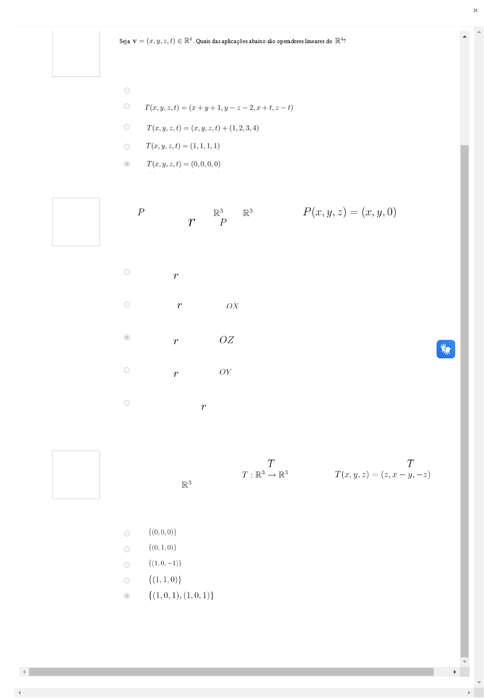 Últimas Notícias A importância da Psicologia nos Centros de Referência de Assistência Social (CRAS) 08/10/2024 LANÇAMENTO DE CARTILHA VISA CONSCIENTIZAR A POPULAÇÃO SOBRE A IMPORTÂNCIA DOS CUIDADOS COM A SAÚDE MENTAL 04/10/2024 Edital publicado para docentes atribuído a projetos de iniciação científica em 2025 Ambiente Virtual × Questão 1 Correto Atingiu 2,67 de 2,67 Questão 2 Correto Atingiu 2,66 de 2,66 Questão 3 Incorreto Atingiu 0,00 de 2,67 Escolha uma opção: a. N.D.A b. c. d. e. ✓ Seja a transformação de em , definida por . Se a imagem de uma reta , por , é um ponto, então: Escolha uma opção: a. esta reta necessariamente contém a origem b. esta reta é paralela a c. esta reta é paralela a ✓ d. esta reta é paralela a e. não existe tal reta Chama-se núcleo de uma transformação linear o conjunto dos pontos cuja imagem por é nula. O núcleo da transformação linear definida por , é o subespaço do gerado por: Escolha uma opção: a. b. c. d. e. × 26/10/24, 10:16 Aluno https://ecossistema.doctum.edu.br/aluno/mural 1/2 https://www.doctum.edu.br/?p=24811 https://www.doctum.edu.br/?p=24811 https://www.doctum.edu.br/?p=24811 https://www.doctum.edu.br/?p=24811 https://www.doctum.edu.br/?p=24811 https://www.doctum.edu.br/?p=24811 https://www.doctum.edu.br/?p=24805 https://www.doctum.edu.br/?p=24805 https://www.doctum.edu.br/?p=24805 https://www.doctum.edu.br/?p=24805 https://www.doctum.edu.br/?p=24805 https://www.doctum.edu.br/?p=24805 https://www.doctum.edu.br/?p=24800 https://www.doctum.edu.br/?p=24800 https://www.doctum.edu.br/?p=24800 https://crm.doctum.edu.br/whatsappapi/ https://crm.doctum.edu.br/whatsappapi/ https://www.instagram.com/doctumoficial/ https://www.instagram.com/doctumoficial/ https://www.facebook.com/RedeDoctum https://www.facebook.com/RedeDoctum https://www.linkedin.com/school/rededoctum/mycompany/ https://www.linkedin.com/school/rededoctum/mycompany/ https://x.com/rededoctum https://x.com/rededoctum https://www.doctum.edu.br/telegram/ https://www.doctum.edu.br/telegram/ Ambiente Virtual 26/10/24, 10:16 Aluno https://ecossistema.doctum.edu.br/aluno/mural 2/2