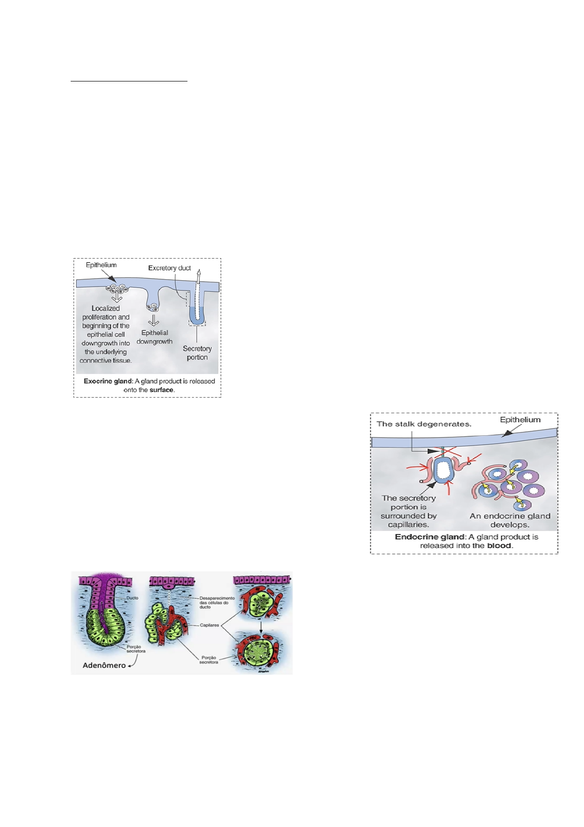 Tecido epitelial glandular O tecido epitelial glandular é constituído por células especializadas na atividade de secreção. As moléculas a serem secretadas são armazenadas geralmente em grânulos de secreção de células. São capazes de armazenar proteínas (pâncreas), lipídeos (adrenal e glândulas sebáceas), complexos de carboidratos e proteínas (glândulas salivares). Glândulas são estruturas unicelulares ou pluricelulares organizadas em lobos. Glândulas são sempre formadas a partir de epitélios de revestimento, cujas células proliferam, invadem o tecido subjacente e sofrem diferenciação (epitélio secretor). O termo glândula designa agregados grandes e complexos de um conjunto de células epiteliais secretoras. Células caliciformes do revestimento do intestino e trato respiratório são glândulas unicelulares. Na formação de glândulas exócrinas, as células do tecido epitelial de revestimento se proliferam e invadem o tecido conjuntivo subjacente e assumem função secretora. Essas células assumem essa forma de ducto; a parte inferior (azul mais escuro) é a porção secretora da glândula (adenômero) e a parte superior é o ducto secretor (azul claro). Glândulas exócrinas mantém sua conexão com o epitélio do qual se originaram, formando ductos tubulares através dos quais as secreções são transportadas. As glândulas endócrinas, têm formação similar à das glândulas exócrinas, no entanto, por sua vez, elas secretam substâncias para vasos sanguíneos. A conexão com o tecido epitelial é obliterada durante o desenvolvimento, portanto esse tipo de glândula não apresenta ducto excretor. As glândulas anfícrinas (como o pâncreas) são tanto exócrinas como endócrinas. Essas glândulas podem excretar substâncias no meio externo (ou cavidades do corpo), bem como em vasos sanguíneos. Durante a formação de glândulas endócrinas, vasos sanguíneos entram em contato com a porção secretora. Ao lado, além de uma glândula exócrina, estão representadas uma glândula endócrina cordonal e uma glândula endócrina folicular. Critérios de classificação de glândulas exócrinas: 1. Quanto ao número de ductos Glândulas exócrinas com apenas um ducto, mesmo que esse ducto apresente ramificações, são classificadas como simples e glândulas com dois ou mais ductos de diferentes calibres são classificadas como compostas. 2. Quanto à forma dos adenômeros Os adenômeros das glândulas exócrinas podem ser classificados como acinosos, tubulares ou tubulo-acinosos. 3. Quanto ao produto de secreção Glândulas exócrinas caracterizadas como serosas (secreção protéica) apresentam células poliédricas ou piramidais, com núcleos arredondados (vesiculosos) e lúmen pouco evidente. Sua coloração histológica é marcante; intensa basofilia (acúmulo de retículo endoplasmático rugoso em sua região basal). Glândulas classificadas como mucosas (secreção de glicoproteínas e polissacarídeos) apresentam células com núcleo achatado e basal e lúmen evidente. Ao contrário das células de glândulas serosas, sua coloração histológica é fraca. 4. Quanto ao modo de liberação dos produtos de secreção Na secreção classificada como merócrina o produto é liberado por exocitose, sem perda de outro material celular. Em glândulas cuja secreção é caracterizada como apócrina , o produto de secreção é descarregado junto com as porções do citoplasma apical da célula. Já na secreção holócrina , o produto de secreção é juntamente eliminado com toda a célula (o processo envolve destruição das células repletas de secreção.