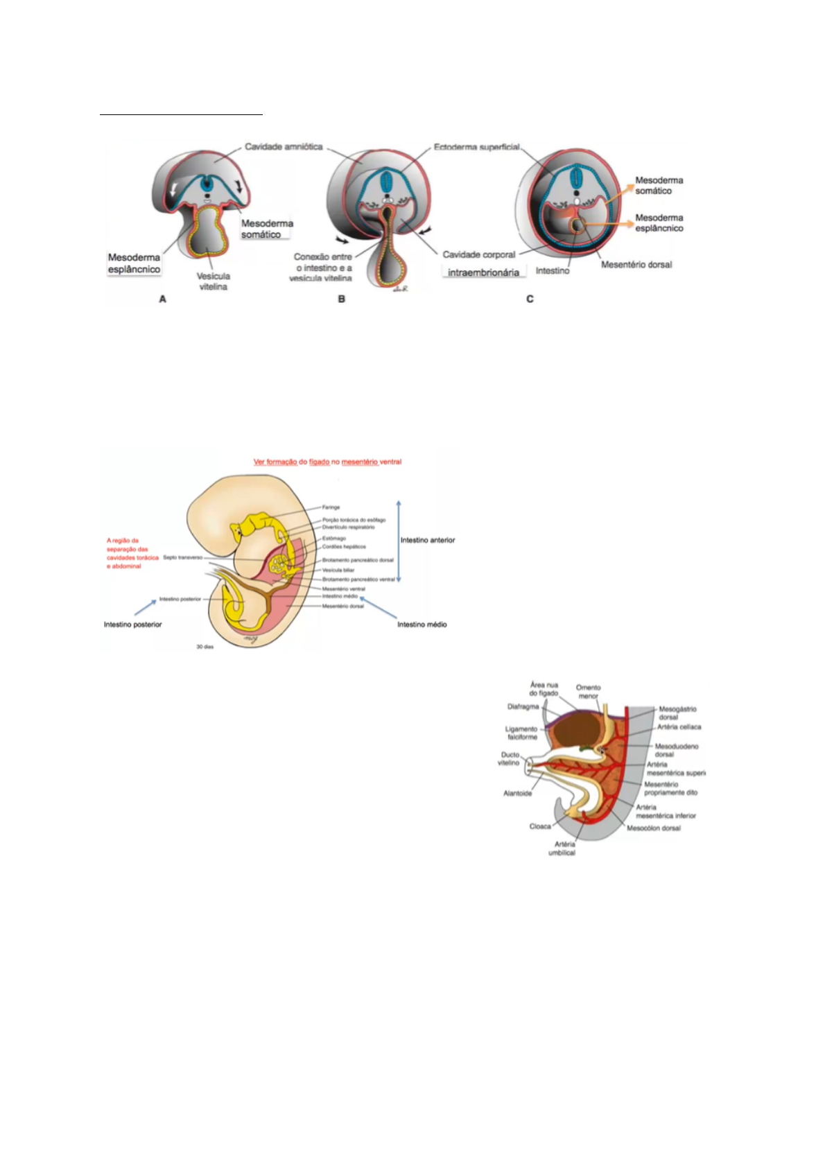 Derivados do endoderma O dobramento crânio caudal leva a expansão da cavidade amniótica, reposicionamento do mesoderma cardíaco, do septo transverso (localizado entre as regiões em que se formam o coração e o fígado; formação do mesentério ventral na região do fígado) e do alantóide, formação do ducto vitelino e delimitação do intestino primitivo. O ducto vitelino conecta o saco vitelino ao intestino médio e o mesentério dorsal conecta o intestino primitivo à parede corporal dorsal. Posteriormente às bolsas faríngeas, é possível identificar um divertículo do endoderma (divertículo respiratório), próximo à porção torácica do esôfago. Na região ventral, onde estão localizados a região cardíaca e o septo transverso, junto a outro derivado mesentério dorsal, surge uma membrana de separação entre as cavidades torácica e abdominal. Na imagem à direita, está ilustrada parte do tubo digestório com localização abdominal; três artérias nutrem as três regiões intestinais localizadas na cavidade abdominal. Parte do diafragma é formado a partir do septo transverso e do mesentério dorsal do esôfago (membrana que separa as cavidades torácica e abdominal). O que define a posição de cada um dos órgãos? Desde antes do fechamento do embrião, existe uma especificação definida por expressão diferencial de proteínas, que podem ser secretadas e criam gradiente de concentração importante para a definição do posicionamento dos órgãos ao longo do eixo corporal crânio caudal. Além desse evento inicial, na sequência do desenvolvimento (com a curvatura cefálico cranial e com a curvatura caudal) essas regiões se tornam cada vez mais especificadas e nítidas, devido à expressão de diferentes fatores de transcrição. Durante a gastrulação é estabelecida a assimetria direita-esquerda; ao longo do desenvolvimento, os lados esquerdo e direito se diferenciam, embora morfologicamente semelhantes, através da expressão diferencial de proteínas. Como consequência dessa assimetria e do padrão de diferenciação ao longo do eixo crânio caudal, os órgãos adquirem suas formas características no decorrer do tempo. O estômago, por exemplo, a princípio (A) é visto como um tubo relativamente simples. Sua porção dorsal cresce mais rapidamente que a parte ventral e, como consequência da maior proliferação das células dessa região, ocorre a formação de uma curvatura maior. Nesse mesmo momento, ocorre uma rotação do órgão (que depende da relação do órgão com as membranas que o prendem à parede corporal — mesoderma lateral esplâncnico); a parte esquerda do estômago se volta, então, para a região ventral e o estômago adquire sua anatomia característica. A conformação das estruturas ao redor do estômago também muda. Os ramos do nervo vago (parte em azul, inicialmente na região esquerda, passam para a porção ventral; o mesentério ventral (parte em vermelho) assume posição anatômica à direita. Próximo à saída do estômago (região posterior), localiza-se o duodeno; no esquema ao lado é possível notar que, da região do duodeno, surgem brotamentos, ou seja, regiões de proliferação do endoderma em direção ao mesoderma, importantes para a formação de glândulas. Ao longo do desenvolvimento, o mesentério ventral em torno do fígado recebe nomes diferentes. A parte que liga o fígado à parede ventral do corpo forma o ligamento falciforme e a parte que o liga ao estômago e à região do duodeno é chamado de omento menor. O fígado tem crescimento muito acelerado e ocupa grande região da cavidade abdominal; atinge a parte onde está se formando o diafragma (área nua do fígado). Na parte do duodeno onde se formam os brotamentos hepáticos, surgem também brotamentos que dão origem ao pâncreas. Forma-se um brotamento dorsal e um brotamento ventral e, com o giro do estômago e do duodeno, o broto pancreático ventral gira em torno do eixo do duodeno e assume posição próxima ao brotamento dorsal. Com o deslocamento da região ventral do pâncreas, o ducto biliar que passa na região dorsal se insere junto ao canal que sai do pâncreas e persiste como ducto pancreático principal, que normalmente degenera. A rotação assimétrica é dependente da expressão inicial do lado esquerdo de nodal, lefty e Pitx2. As células da região esquerda (tanto do mesoderma quanto do endoderma) se proliferam mais, formando uma alça e consequentemente levando ao giro (rotação). Inicialmente, o pâncreas e o duodeno ocupam plano médio e intraperitoneal (na cavidade intraperitoneal, revestidos pelo mesoderma esplâncnico). Com a rotação dos órgãos, o pâncreas, junto ao duodeno, passa a ocupar posição retroperitoneal, à esquerda; ou seja, apenas um lado é revestido pelo mesoderma lateral esplâncnico. A alça intestinal representada na ilustração à direita está presa à região ventral pelo pedículo vitelino e à parede corporal melo mesentério dorsal, rico em vasos sanguíneos. O mesentério é fundamental para a passagem de vasos sanguíneos e linfáticos e para a inervação dos órgãos em formação. Durante o momento em que o desenvolvimento das alças intestinais ocorre de forma acelerada, a parte em que ela se localiza, no intestino médio, é ocupada, em grande parte, pelo crescimento do fígado; consequentemente, seu crescimento ocorre rumo à cavidade do cordão umbilical (herniação do intestino médio). Enquanto se desenvolve, o intestino médio gira em torno da artéria mesentérica superior e volta para a cavidade abdominal. Durante o desenvolvimentos desses órgãos, as membranas que os ligam uns aos outros e à parede corporal também se desenvolvem; a imagem ao lado ilustra o crescimento dessas estruturas e alteração da forma do mesentério dorsal. Na representação ao lado é possível identificar a cloaca e o intestino posterior, em comunicação com o alantóide; nessa região se