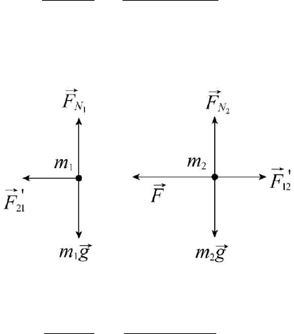 SOLUÇÕES DOS PROBLEMAS 147 Aplicando a Segunda Lei de Newton ao bloco 1, temos F F m a− =21 1 , em que a é a aceleração. Aplicando a Segunda Lei de Newton ao bloco 2, temos F m a12 = 2 . Como os blocos se movem juntos, eles têm a mesma aceleração. (a) A partir da segunda equação, obtemos a relação a F m= 12 / 2, que substituímos na primeira equação para obter F F m F m− =21 121 2/ . Como F F21 12= , temos F F m m m F21 12 kg kg kg N= = + = + ( ) =2 1 2 1 2 2 3 1 2 3 2 1 1 , , , , , NN. (b) Os diagramas de corpo livre dos dois blocos na situação do item (b) são mostrados a se- guir. As forças de contato entre os blocos são: ′ = ′ = + = + ( ) =F F m m m F21 12 kg kg kg N1 1 2 2 3 2 3 1 2 3 2 2 , , , , ,, .1 N (c) Note que a aceleração dos blocos é a mesma nos dois casos. No item (a), a força F12 é a única força horizontal que age sobre o bloco de massa m2; no item (b), ′F21 é a única força horizontal que age sobre o bloco de massa m1 > m2. Como F m a12 = 2 no item (a) e ′ =F m a21 1 no item (b), para que as acelerações sejam iguais, devemos ter ′ >F F21 12, ou seja, as forças entre os blocos devem ser maiores na situação do item (b). Nota: Como mostra este problema, se dois blocos são acelerados por uma força externa, a for- ça entre os blocos é maior se o bloco de menor massa é usado para empurrar o bloco de maior massa. 56. Como as duas situações envolvem a mesma força aplicada e a mesma massa total, a acele- ração deve ser a mesma nos dois casos. (a) Na situação da figura (b), de acordo com a Terceira Lei de Newton, se o bloco A empurra o bloco B com uma força de 10 N, o bloco B também empurra o bloco A com uma força de 10 N. Assim, a força (externa) que produz a aceleração do bloco B na situação da figura (a) (20 N) é duas vezes maior que a força (interna) que produz a mesma aceleração do bloco A na situação da figura (b) (10 N). De acordo com a Segunda Lei de Newton, a massa do bloco B é duas vezes maior que a massa do bloco A. Como a massa total é 12,0 kg, isso significa que a massa do bloco B é mB = 8,00 kg e a massa do bloco A é mA = 4,00 kg. Aplicando a Segunda Lei de Newton ao bloco B na situação da figura (a), a = (20,0 N)/(8,00 kg) = 2,50 m/s2. Naturalmente, aplicando a Segunda Lei de Newton ao bloco A na situação da figura (b), obtemos o mesmo resultado para a aceleração: a = (10,0 N)/(4,00 kg) = 2,50 m/s2. (b) Fa = (12,0 kg)(2,50 m/s2) î = (30,0 N) ̂i . 148 SOLUÇÕES DOS PROBLEMAS 57. Os diagramas de corpo livre dos dois blocos são mostrados na figura a seguir. T é a tensão da corda e θ = 30° é o ângulo do plano inclinado. No caso do bloco 1, tomamos o eixo x paralelo à superfície do plano inclinado, apontando para cima, e o eixo y perpendicular ao plano inclinado, também apontando para cima. No caso do bloco 2, tomamos o eixo y apontando verticalmente para baixo. Desta forma, as acelerações dos dois blocos podem ser representadas pelo mesmo símbolo a, sem contradições. Aplicando a Segunda Lei de Newton aos eixos x e y do bloco 1 e ao eixo y do bloco 2, temos: T mg ma F m g m g T m a N − = − = − = 1 1 1 2 2 0 sen cos u u A primeira e a terceira dessas equações formam um sistema que podemos usar para calcular os valores de a e T. A segunda equação não é necessária para resolver o problema, já que a força normal não é pedida nem faz parte da solução (como aconteceria se houvesse atrito). (a) Somando membro a membro a terceira equação à primeira, temos: m2g – m1g sen θ = m1a + m2a. Explicitando a aceleração a, obtemos: a m m g m m = − + = −( sen ) [ , ( , )sen ,2 1 1 2 2 30 3 70 30 0u kg kg oo 2 2 m/s kg kg m/s ]( , ) , , , 9 80 3 70 2 30 0 735 + = (b) Como o valor de a é positivo, a aceleração do bloco que está pendurado é para baixo. (c) A tensão da corda é T ma mg= + = +1 1 3 70 0 735 3 70sen ( , )( , ) ( , )(u kg m/s kg2 99 80 30 0 20 8, )sen , , .m/s N2 o = 58. Vamos considerar positivo o movimento para cima do sistema homem-cadeira. (a) Quando o homem está puxando a corda com uma força igual à tensão T da corda, a força to- tal para cima a que está sujeito o sistema homem-cadeira é 2T, já que as duas extremidades da corda exercem uma força T sobre o sistema. Assim, de acordo com a Segunda Lei de Newton, temos: 2T mg ma− = e, portanto, para a = 0, T = 466 N. (b) Para a = +1,30 m/s2, a equação do item (a) nos dá T = 527 N. (c) Se o homem não está segurando a corda (e, em vez disso, a corda é puxada por outra pessoa com uma força igual à tensão T), apenas uma extremidade da corda exerce uma força T sobre o sistema e, assim, de acordo com a Segunda Lei de Newton, T mg ma− = e, portanto, para a = 0, T = 931 N.