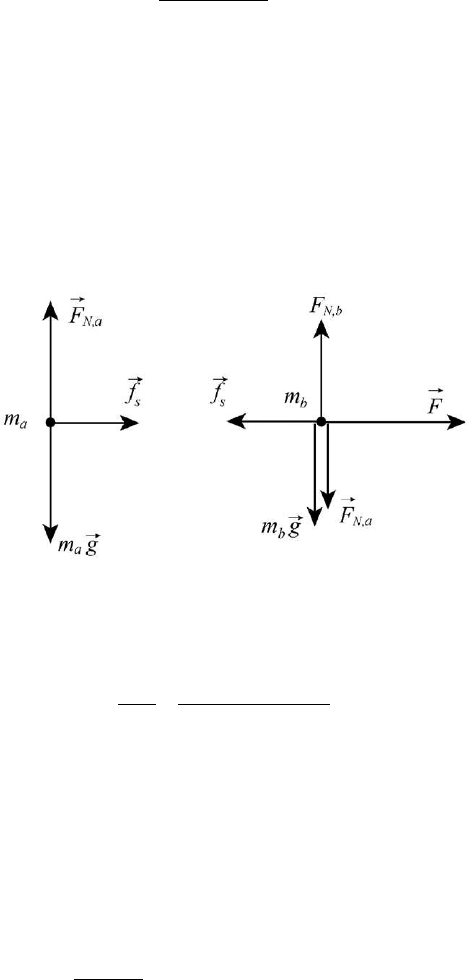 SOLUÇÕES DOS PROBLEMAS 187 (b) A solução para a aceleração é a g m m m m = − + + =sen cos ,u m m u2 2 1 1 2 1 3 62 m/s2. (c) Inverter a posição das caixas equivale a trocar os índices. A equação obtida no item (a) mostra que essa troca leva a um valor negativo para T, com o mesmo módulo de antes. Assim, a situação permanece a mesma, exceto pelo fato de que a haste passa a estar sob compressão e não sob tração, como na situação anterior. 61. O sistema é formado por duas caixas, uma em cima da outra. Se puxarmos o bloco de baixo com muita força, o bloco de cima deslizará sobre o de baixo. Estamos interessados em calcular a força máxima que pode ser aplicada sem que os blocos deixem de se mover juntos, A figura mostra os diagramas de corpo livre dos dois blocos. Em primeiro lugar, calculamos o coeficiente de atrito estático da superfície entre os dois blocos. Como uma força de no mínimo Fmín = 12 N deve ser aplicada ao bloco de cima para que deslize, F f F m gs s N a s amín mán= = =, ,m m e, portanto, ms a F m g = = =mín 12 0 31 N (4,0 kg)(9,8m/s )2 , . Usando o mesmo raciocínio, para que os dois blocos se movam juntos, a força aplicada ao bloco de baixo não deve ser maior que F F m m gs s a b= = +m mN,b ( ) . (a) A última equação nos dá: F m m gs t b= + = + =m ( ) ( , )( , , )( , )0 31 4 0 5 0 9 8 2kg kg m/s2 77 N. (b) A aceleração máxima com a qual os blocos se movem juntos é a F m m g t b smáx = + = = =m ( , )( , ) , .0 31 9 8 3 0m/s m/s2 2 62. O diagrama de corpo livre da pedra é mostrado na figura. 188 SOLUÇÕES DOS PROBLEMAS F é a força aplicada à pedra, FN é a força normal para baixo que o teto exerce sobre a pedra, mg é a força de gravidade e f é a força de atrito. Escolhemos um eixo x para a direita e um eixo y para cima. Aplicando a Segunda Lei de Newton aos eixos x e y, temos: F F f ma F F F mg x y N = − = = − − = cos sen u u 0 Como f Fk N= m , e a segunda equação nos dá F F mgN = −senu , f F mgk= −m u( sen ). Substituindo essa expressão na primeira equação, obtemos F cos θ – µk (F sen θ−mg ) = ma. Para a = 0 , a força é F mgk k = − − m u m ucos sen Para µk = 0,65, m = 5,0 kg e θ= 70º, obtemos F = 118 N. 63. (a) A figura mostra o diagrama de corpo livre da alpinista (representada por um bloco em forma de L). A força que a alpinista exerce sobre a pedra não é mostrada (já que o diagrama mostra apenas as forças que são exercidas sobre ela), mas está relacionada às forças normais FN1 e FN2 exercidas horizontalmente sobre os sapatos e sobre as costas da alpinista, respectivamente. Como vamos mostrar no item (b) que FN1 = FN2, não está errado dizer que o módulo da força que a alpinista exerce sobre a pedra é FN2. A força total para cima exercida pela força (máxima) de atrito está- tico é f f f= +1 2 , em que f Fs N1 1 1= m e f Fs N2 2 2= m . (b) Aplicando a Segunda Lei de Newton aos eixos x e y (x para a direita e y para cima), e como não há aceleração em nenhuma direção, F F f f mg N N1 1 2 0 0 2 5 1 2 5 2