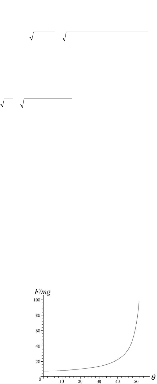 SOLUÇÕES DOS PROBLEMAS 195 Aplicando a Segunda Lei de Newton à componente horizontal do movimento, obtemos fs = mv2/R, na qual fs é a força de atrito estático exercido pela pista sobre os pneus. Aplicando a Segunda Lei de Newton à componente vertical do movimento, obtemos FN = mg, na qual FN é a força normal exercida pela pista sobre os pneus e m é a massa do conjunto ciclista-bicicleta. (a) A força de atrito é f mv R s = = ( )( ) = 2 2 85 0 9 00 25 0 275 , , , . kg m/s m N (b) Como a força de atrito fs e a força normal FN são mutuamente perpendiculares, o módulo da força resultante que a pista exerce sobre a bicicleta é F f Fs N= + = + =2 2 2 2275 250 9 8 877( ) ( , )( , ) .N m m/s N2 82. No alto do morro, as forças verticais que agem sobre o carro são a força normal exercida pela estrada e a força da gravidade. Escolhendo um eixo y orientado para baixo, a Segunda Lei de Newton nos dá mg F mv R N− = 2 . Fazendo FN = 0 e explicitando v, temos: v gR= = =( , )( ) ,9 8 250 49 5m/s m m/s2 = 49,5(3600/1000) km/h = 178 km/h. 83. (a) A força mínima para que o caixote comece a se mover é fs,máx = µs FN (Eq. 6-1, com FN = mg neste caso), o que nos dá (0,51)(165 N) = 84,2 N. (b) Depois que o caixote começa a se mover, a força necessária para mantê-lo em movimento com velocidade constante é uma força igual à força de atrito cinético fk =µk FN =µk mg = 52,8 N. (c) Como a massa do caixote é 165/9,8 = 16,8 kg, a aceleração, usando a Segunda Lei de Newton e os resultados dos itens (a) e (b), é a = (84,2 N – 52,8 N)/(16,8 kg) ≈ 1,87 m/s2. 84. (a) A componente horizontal de F empurra o caixote, enquanto a componente vertical au- menta a força de atrito, ao aumentar a força normal. Aplicando a Segunda Lei de Newton nas direções, temos: direção horizontal: Fcosθ – fs = 0 direção vertical: FN – Fsenθ – mg = 0. Dizer que o caixote está “na iminência de se mover” equivale a dizer que fs = fs,máx = µsFN (Eq. 6-1). Combinando as três equações, obtemos F mg s s = − m u m ucos . sen A figura abaixo mostra um gráfico da razão F/mg em função de θ (com θ em graus). 196 SOLUÇÕES DOS PROBLEMAS (b) O denominador da expressão de F/mg em função de θ se anula para cos sen taninfu m u u m − = ⇒ = − s s 0 11 Para ms = 0 70, , θinf = 55o. (c) Se o piso for lubrificado, o coeficiente de atrito estático será menor e, portanto, o ângulo θinf será maior que o valor calculado no item (b). (d) Para ms = 0 60, , uinf tan , .= =−1 1 0 60 59o 85. O carro começará a escorregar se m us = = ° =tan tan , , .35 0 0 700 Este valor representa uma redução de 3,4% em relação ao valor inicial, 0,725. 86. (a) O problema é conceitualmente igual ao da roda-gigante (Problema 45), com a tensão T da corda assumindo o papel da força normal FN. Assim, a tensão é dada por T = m(g − v2/r) no ponto mais alto do percurso e por T = m(g + v2/r) (o valor máximo) no ponto mais baixo do per- curso. Isso significa que a corda vai arrebentar no ponto mais baixo do percurso. (b) Quando a corda arrebenta, T = 33 N = m(g + v2/r), em que m = 0,26 kg e r = 0,65 m. Explicitando a velocidade, obtemos v = 8,73 m/s. 87. A figura mostra o diagrama de corpo livre do carro. (O desenho não está em escala.) A massa do carro é m = (10.700/9,80) kg = 1,09 × 103 kg. a) De acordo com a Eq. 6-18, temos: f mv R s = = 2 3,21 10 N.33 (b) De acordo com a Eq. 6-1, temos: f F mgs s N s, , . ,máx = = = ( )( ) = ×m m 0 35 10 700 3 75 103N N. Como a força de atrito estático calculada no item (a) é menor que esse valor, o carro consegue fazer a curva sem derrapar. 88. Aplicando a Segunda Lei de Newton ao bloco 2, temos: F T f m a x F F m g k N cos sen u u − − = − − = 2 2 0 eixo eixoy. Combinando essas equações com a relação fk = µk FN, temos: F T m g m ak k(cos ) .u m u m− − − =sen 2 2