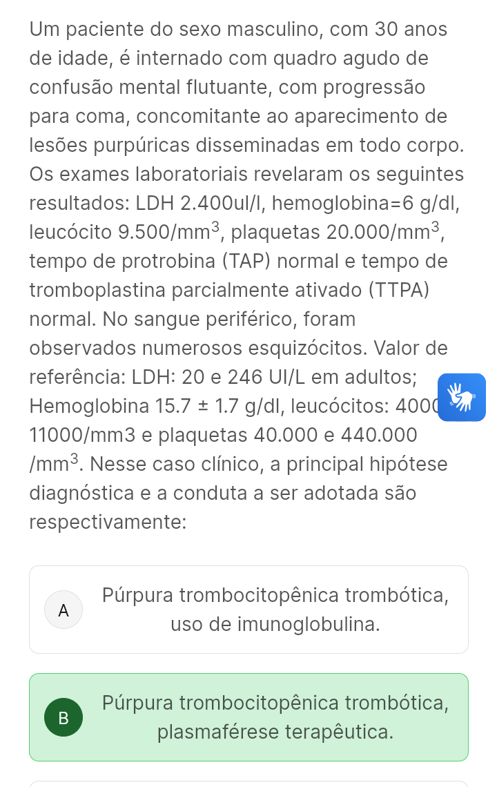 ma paciente com vinte anos de idade relatou metrorragia de grande intensidade, acompanhada do surgimento de petéquias e equimoses generalizadas por...