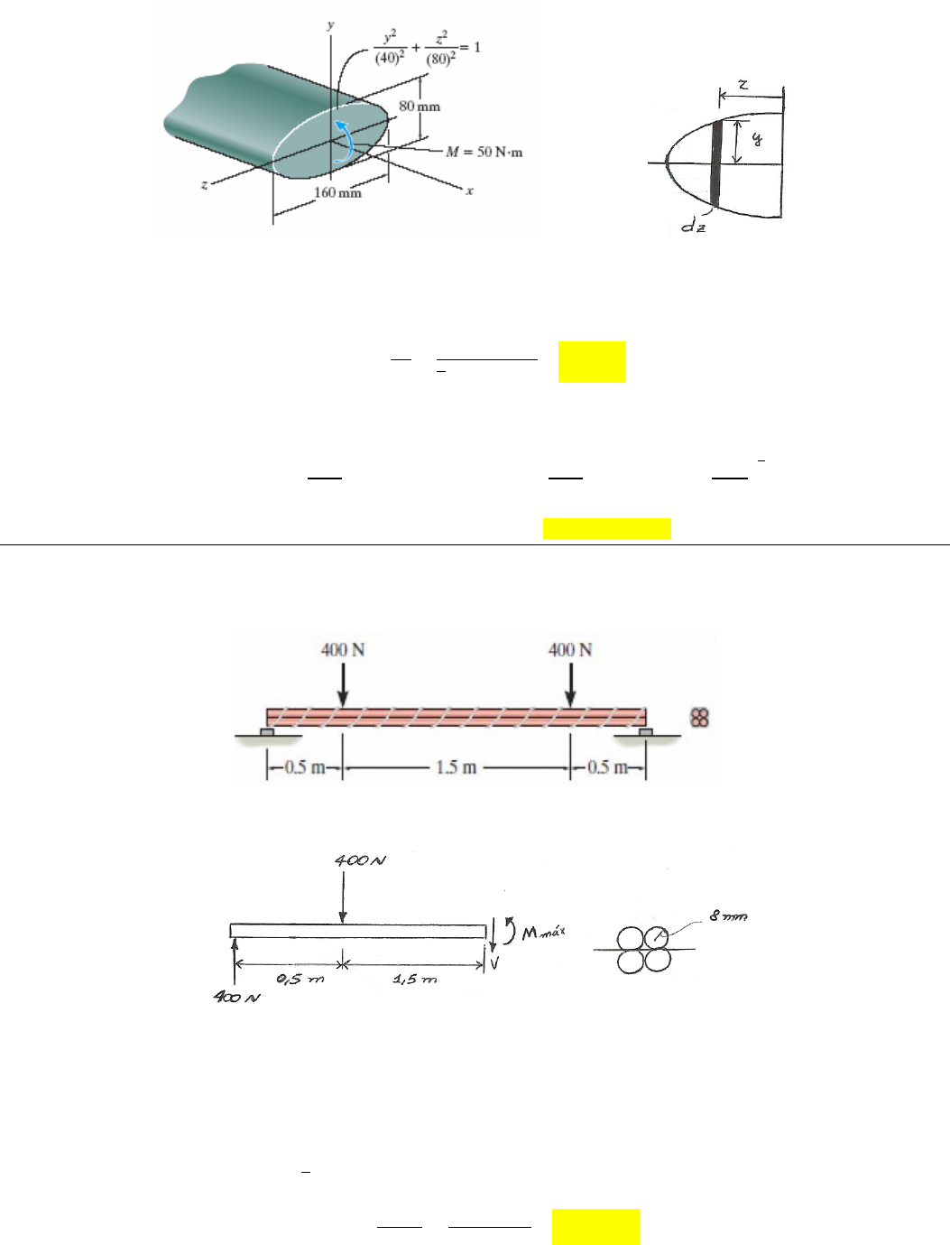 Flexão 326 Resolução: Steven Róger Duarte 6.85. Resolva o Problema 6.84 se o momento M = 50 N.m for aplicado em torno do eixo y em vez de em torno do eixo x. Aqui, Iy = 1/4 π(0,04 m)(0,08 m)³. Figura 6.85 (a) Pela fórmula da Flexão = 249 kPa (b) Por integração M = ∫ ( ) ∫ . / ( ) . / ∫ . / ( ) Resolvendo a integral, obtemos: 6.86. A viga simplesmente apoiada é composta por quatro hastes de 16 mm de diâmetro, agrupadas como mostra a figura. Determine a tensão de flexão máxima na viga devido à carga mostrada. Figura 6.86 ∑ ; ∑ F1 + F2 – 400 – 400 = 0 Mmáx – 400 x 0,5 = 0 F1 = F2 = 400 N Mmáx = 200 N.m . / = 6,434 x 10 -8 m 4 = 49,74 MPa Flexão 327 Resolução: Steven Róger Duarte 6.87. Resolva o Problema 6.86 se o conjunto girar 45° e for assentado nos apoios. Figura 6.87 Mmáx = 400 x 0,5 = 200 N.m 0 ( ) 1 0 ( ) ( ) ( ) 1 = 6,434 x 10 -8 m 4 ( )( ) = 60,04 MPa 6.88. A viga de aço tem a área de seção transversal mostrada na figura. Determine a maior intensidade da carga distribuída w0 que ela pode suportar de modo que a tensão de flexão máxima na viga não ultrapasse ζmáx = 150 MPa. Figura 6.88 ∑ ; ∑ ; ∑ 8F2 – (4w0) x 4= 0 F1 + 2w0 – 4w0 = 0 F2 = 2w0 F1 = 2w0 . / = 6,3685 x 10 -5 m 4 = 13,47 kN/m Flexão 328 Resolução: Steven Róger Duarte 6.89. A viga de aço tem a área da seção transversal mostrada na figura. Se w0 = 10 kN/m, determine a tensão de flexão máxima na viga. Figura 6.89 ∑ ; ∑ 8F2 – (40) x 4= 0 F1 + 20 – 40 = 0 F2 = 20 kN F1 = 20 kN ∑ . / = 6,3685 x 10 -5 m 4 = 111,38 MPa Flexão 329 Resolução: Steven Róger Duarte 6.90. A viga tem a seção transversal retangular mostrada na figura. Determine a maior carga P que pode ser suportada em suas extremidades em balanço de modo que a tensão de flexão na viga não ultrapasse ζmáx = 10 MPa. Figura 6.90 = 1,67 kN 6.91. A viga tem a seção transversal retangular mostrada na figura. Se P = 1,5 kN, determine a tensão de flexão máxima na viga. Faça um rascunho da distribuição de tensão que age na seção transversal. Figura 6.91 |Mmáx| = 750 N.m = 9 MPa