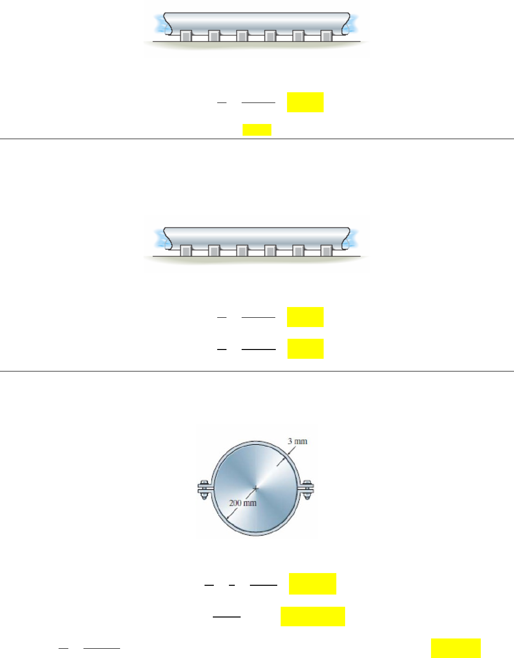 Cargas Combinadas 454 Resolução: Steven Róger Duarte 8.6. O tubo de extremidade aberta feito de cloreto de polivinil tem diâmetro interno de 100 mm e espessura de 5 mm. Se transportar água corrente à pressão de 0,42 MPa, determine o estado de tensão nas paredes do tubo. Figura 8.6 = 4,2 MPa 8.7. Se o fluxo de água no interior do tubo do Problema 8.6 for interrompido devido ao fechamento de uma válvula, determine o estado de tensão nas paredes do tubo. Despreze o peso da água. Considere que os apoios exercem somente forças verticais sobre o tubo. Figura 8.7 = 4,2 MPa = 2,1 MPa *8.8. A cinta de aço A-36 tem 50 mm de largura e está presa ao redor do cilindro rígido. Se os parafusos forem apertados de modo que a tração neles seja 2 kN, determine a tensão normal na cinta, a pressão exercida sobre o cilindro e a distância até onde metade da cinta estica. Figura 8.8 = 13,33 MPa p = 0,199 MPa = 6,665 x 10 -5 mm/mm ( ) ( ) = 0,0422 mm Cargas Combinadas 455 Resolução: Steven Róger Duarte 8.9. Inicialmente, a cinta de aço inoxidável 304 está perfeitamente ajustada em torno do cilindro rígido liso. Se ela for submetida a uma queda de temperatura não linear ΔT = 12sen²θ ºC, onde θ é dado em radianos, determine a tensão circunferencial na cinta. Figura 8.9 ∫ . / ( * ∫ ∫ ( )( ) ∫ = 19,69 MPa 8.10. O barril está cheio de água até em cima. Determine a distância s entre o aro superior e o aro inferior de modo que a força de tração em cada aro seja a mesma. Determine também a força em cada aro. O barril tem diâmetro interno de 1,2 m. Despreze a espessura da parede. Considere que somente os aros resistam à pressão da água. Observação: A água desenvolve pressão no barril de acordo com a lei de Pascal, p = (900z) Pa, onde z é a profundidade da água em relação à superfície, medida em metros. Figura 8.10 p = 900z ∫ ( ) ∫ ( )( ) = 3.110,4 N ∑ ; 4F – P = 0 = 777,6 N ∑ ; 2 x 777,6 x 0,6 + 2 x 777,6 x (0,6 + s) – 3110,4 x 0,8 = 0 s = 0,4 m = 400 mm Cargas Combinadas 456 Resolução: Steven Róger Duarte 8.11. Um tubo de madeira com diâmetro interno de 0,9 m é atado com aros de aço cuja área de seção transversal é 125 mm². Se a tensão admissível para os aros for ζadm = 84 MPa, determine o espaçamento máximo s dos aros ao longo da seção do tubo de modo que este possa resistir a uma pressão manométrica interna de 28 kPa. Considere que cada aro suporta a pressão do carregamento que age ao longo do comprimento s do tubo. Figura 8.11 P = 28 x 10³ x 0,9 x s = 25.200s ∑ ; 2F – P = 0 = 12.600s s = 0,83333 m = 833,33 mm *8.12. Uma caldeira é feita de chapas de aço de 8 mm de espessura ligadas nas extremidadades por uma junta de topo que consiste em duas chapas de cobertura de 8 mm e rebites com diâmetro de 10 mm e espaçados de 50 mm, como mostra a figura. Se a pressão do vapor no interior da caldeira for 1,35 MPa, determine: (a) a tensão circunferencial na chapa da caldeira separada da costura, (b) a tensão circunferencial na chapa de cobertura externa ao longo da linha de rebites a-a e (c) a tensão de cisalhamento nos rebites. Figura 8.12 (a) A tensão circunferencial na chapa da caldeira separada da costura = 126,56 x 10 6 = 127 MPa (b) a tensão circunferencial na chapa de cobertura externa ao longo da linha de rebites a-a 126,56 x 10 6 x 0,05 x 0,008 = x 2 x 0,04 x 0,008 = 79,1 MPa (c) a tensão de cisalhamento nos rebites ∑ ; F – 79,1 x 10 6 x 0,008 x 0,04 = 0 F = 25,3 kN = 322 MPa Cargas Combinadas 457 Resolução: Steven Róger Duarte 8.13. O anel cujas dimensões são mostradas na figura é colocado sobre uma membrana flexível bombeada com uma pressão p. Determine a mudança no raio interno do anel após a aplicação dessa pressão. O módulo de elasticidade para o anel é E. Figura 8.13 ; . / , ( )- = ( ) ( ) 8.14. Um vaso de pressão com extremidades fechadas é fabricado com filamentos de vidro trançados sobre um mandril de modo que, no final, a espessura da parede t dovaso é composta inteiramente de filamento e adesivo epóxi, como mostra a figura. Considere um segmento do vaso de largura w trançado a um ângulo . Se o vaso for submetido a uma pressão interna p, mostre que a força no segmento é , onde é a tensão nos filamentos. Além disso, mostre que as tesões nas direções circunferencial e longitudinal são e , respectivamente. A que ângulo (ângulo de trançamento ótimo) os filamentos teriam de ser trançados para obterem-se tensões circunferencial e longitudinal equivalentes? Figura 8.14