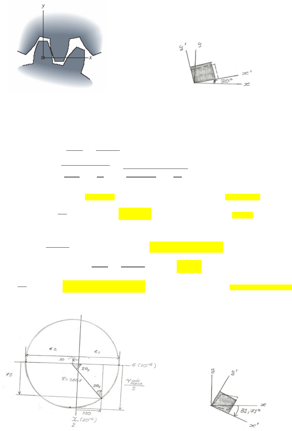 Transformação da Deformação 622 Resolução: Steven Róger Duarte 10.19. Resolva o Problema 10.6 usando o círculo de Mohr. Figura 10.19 (a) As deformações principais no plano: ( ) ( ) ( ) . / ( ) = - 30(10 -6 ) (centro do círculo) √. / . / √. , - / . / = 167,7(10 -6 ) ( )( ) ( ) ; ( )( ) ( ) ( ) = 0,5 ; (b) A deformação por cisalhamento máxima no plano e a deformação normal média: ( ) ( ) . / ( ) = - 30(10 -6 ) ( ) = 2 ( ) ; ( ) Transformação da Deformação 623 Resolução: Steven Róger Duarte *10.20. Resolva o Problema 10.8 usando o círculo de Mohr. Figura 10.20 (a) As deformações principais no plano: ( ) ( ) ( ) . / ( ) = - 120(10 -6 ) (centro do círculo) √. / . / √. , - / . / = 741,77(10 -6 ) ( ) ; ( ) ( ) = 0,5859 ; (b) A deformação por cisalhamento máxima no plano e a deformação normal média: ( ) ( ) . / ( ) = - 120(10 -6 ) ( ) = 2 ( ) ; ( ) Transformação da Deformação 624 Resolução: Steven Róger Duarte 10.21. Resolva o Problema 10.7 usando o círculo de Mohr. Figura 10.21 (a) As deformações principais no plano: ( ) ( ) ( ) . / ( ) = 665(10 -6 ) (centro do círculo) √. / . / √. / . / = 373,96(10 -6 ) ( )( ) ( ) ; ( )( ) ( ) ( ) 1,7568 ( ) (b) A deformação por cisalhamento máxima no plano e a deformação normal média: ( ) ( ) . / ( ) = 665(10 -6 ) ( ) = 0,5692 ( ) Transformação da Deformação 625 Resolução: Steven Róger Duarte 10.22. Resolva o Problema 10.9 usando o círculo de Mohr. Figura 10.22 (a) As deformações principais no plano: ( ) ( ) ( ) . / ( ) = 290(10 -6 ) (centro do círculo) √. / . / √. / . / = 94,868(10 -6 ) ( )( ) ( ) ; ( )( ) ( ) ( ) = 3 ( ) (b) A deformação por cisalhamento máxima no plano e a deformação normal média: ( ) ( ) . / ( ) = 290(10 -6 ) ( ) = 0,333 ( )