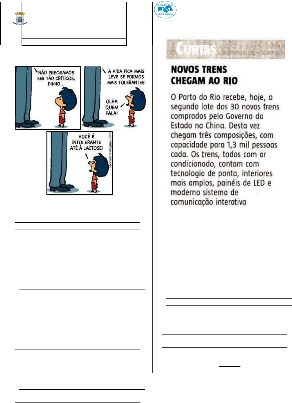 Secretaria Municipal De Educação Campo Grande Escola Municipal José Mauro Messias Da Silva “Poeta das Moreninhas” Professora: Benita Melo Aluno/a: Ano/Turma: 6º______ Data: /11/2024 Leia a tirinha abaixo e resolva às questões 1 - 3: 1. Em que número e pessoa está a forma verbal da oração da primeira fala? 2. Releia a primeira fala do segundo quadrinho: “A vida fica mais leve se formos mais tolerantes!” Depois, responda as perguntas abaixo: a) Qual o sujeito do verbo ficar? Por que esse verbo está no singular? Leia o texto abaixo e resolva às questões 4 - 6: 4. Com qual sujeito o verbo recebe está concordando? Esse verbo está no singular ou plural? Como esse verbo seria escrito caso o sujeito fosse “As cidades”? b) O sujeito desinencial é aquele que não vem expresso na oração, mas pode ser identificado pela desinência do verbo. Desse modo, com qual pronome implícito está concordando o verbo “formos”? 3. Reescreva a frase do último balão substituindo o sujeito “Você” pelo seu plural. Faça as adaptações necessárias na frase. 5. Por que o verbo “chegam” está escrito no plural? 6. No trecho: “... contam com tecnologia de ponta...” o verbo destacado está no plural para concordar com: a) “Os trens” b) “1,3 mil pessoas” c) “ar condicionado” d) “três composições” 7. Leia uma manchete de uma determinada notícia e depois responda às questões: “MANADA DE BÚFALOS SELVAGENS APARECE DURANTE PROTESTO DE NATIVOS AMERICANOS” a) Qual o verbo da oração acima? Ele está no singular ou plural? 10. Considere as frases abaixo para responder à próxima questão: I. Fui eu quem ganhei o presente! II. Fui eu quem ganhou o presente! As duas frases acima estão escritas de forma correta, conforme a norma-padrão. Baseando-se nisso, responda: como se faz a concordância do verbo com o pronome “quem” quando ele for o sujeito da oração? b) A forma verbal da manchete está concordando com qual palavra do título da notícia? c) A palavra manada indica uma grande quantidade de búfalos. Todavia, o verbo está no singular. Por que isso ocorre? Leia a tirinha e resolva às questões 8 e 9: 8. Qual o sujeito da locução verbal “vai ficar”? A locução verbal está no singular ou plural? Por quê? 9. Em: “Baratas não resistem à radiação?”, qual o sujeito do verbo resistir? Por que esse verbo está no plural? 11. Identifique a opção cuja concordância verbal está INCORRETA: a) Durante um incêndio, ficaram destruídas uma casa e uma loja. b) A maior parte dos escritores compareceu ao cinema. c) Foi o prefeito quem nos deu essa informação atual. d) Maria, seu pai e sua mãe caminhávamos silenciosamente. 12. leia o trecho abaixo com atenção e depois responda à questão: Comoveram-se muitos brasileiros com a morte de Marília Mendonça. a) Como seria reescrita a frase acima caso fosse substituída a expressão “muitos brasileiros” por “muita gente”? 13. Observando as regras gramaticais da concordância verbal com o número percentual ou a concordância com o substantivo que segue o percentual, escreva o verbo ou os verbos corretamente nas lacunas. a) 10% ajuda do governo estadual. (recebe / recebem) b) 20% dos brasileiros se com o vírus da Covid 19. (contaminou / contaminaram) c) 60% da imigração no mundo irregular (es). (é / são) d) Somente 1% dos candidatos passar nos exames. (consegue / conseguem) e) Apenas 1% a favor do casamento homossexual. (votou / votaram) f) 25% do orçamento do país destinar-se à Educação. (deve / devem) g) 60% dos imigrantes suas casas pela primeira vez. (deixou / deixaram) 14. Assinale a alternativa cuja forma verbal grifada foi empregada CORRETAMENTE. a) Fazem quatro anos que a guerra acabou. b) Haviam muitas pessoas na escola sem máscaras. c) Deve haver umas dez mesas na varanda da casa. d) Houveram manifestações pacíficas em todo o Brasil. Leia uma parte de uma notícia e depois responda às questões 15 e 16: BOLSONARO, LULA, DORIA E CIRO LAMENTAM MORTE DE MARÍLIA MENDONÇA Figuras políticas também lamentaram nesta sexta- feira (5) a morte da cantora Marília Mendonça, após um acidente aéreo em Minas Gerais, que também deixou outros quatro mortos. [...] (Fonte: Isto é) 15. Por que o verbo do título da notícia está no plural? a) Para concordar com o sujeito simples da oração. b) Porque o sujeito da oração é um sujeito composto. c) Porque o núcleo do sujeito está no Plural. d) Porque o verbo pode também ficar no singular. 16. Identifique com quais expressões os verbos abaixo estão concordando: a) lamentaram. b) deixou. image1.png image2.png image3.jpeg image4.jpeg image5.jpeg