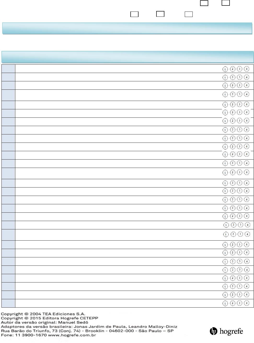 Formulário Idade Escolar SRS-2 Nome da criança:______________________________________________________________________________________________________ Data de nascimento: ___________|______|__________ Data da Avaliação:___________|_______|_______Sexo: M F Nome do respondente:_________________________________________ Mãe/Pai Professor Outro:______________________ 1. Parece muito mais inquieta em situações sociais do que quando está sozinha. 2. As expressões em seu rosto não combinam com o que está dizendo. 3. Parece confiante (ou segura) quando está interagindo com outras pessoas. 4. Quando há sobrecarga de estímulos, apresenta padrões rígidos ou inflexíveis de comportamento que parecem estranhos. 5. Não percebe quando os outros estão tentando tirar vantagem dela. 6. Prefere estar sozinha do que com os outros. 7. Demonstra perceber o que os outros estão pensando ou sentindo. 8. Se comporta de maneira estranha ou bizarra. 9. Fica próxima a adultos, parece ser muito dependente deles. 10. Leva as coisas muito “ao pé da letra” e não compreende o real significado de um conversa. 11. É autoconfiante. 12. É capaz de comunicar seus sentimentos para as outras pessoas. 13. É estranha na “tomada de vez” das interações com seus colegas (por exemplo, não parece entender a reciprocidade de uma conversa). 14. Não tem boa coordenação. 15. É capaz de entender o tom de voz e as expressões faciais das outras pessoas. 16. Evita o contato visual ou tem contato visual diferente. 17. Reconhece quando algo é injusto. 18. Tem dificuldade em fazer amigos, mesmo tentando dar o melhor de si. 19. Fica frustrada quando não consegue expressar suas idéias em uma conversa. 20. Mostra interesses sensoriais incomuns (por exemplo, coloca na boca ou gira objetos) ou formas estranhas de brincar com brinquedos. 21. É capaz de imitar as ações de outras pessoas. 22. Brinca adequadamente com crianças da sua idade. 23. Não participa de atividades em grupo a menos que seja convidada a fazê-lo. 24. Tem mais dificuldade do que outras crianças com mudanças na sua rotina. 25. Não parece se importar em estar fora de sintonia ou em um “mundo” diferente dos outros. 26. Oferece conforto para os outros quando estão tristes. 27. Evita iniciar interações sociais com seus colegas ou adultos. 28. Pensa ou fala sobre a mesma coisa repetidamente. INSTRUÇÕES 1= Não é verdade | 2= Algumas vezes é verdade | 3= Muitas vezes é verdade | 4= Quase sempre é verdade Em cada questão, por favor preencha o círculo que melhor Descreva o comportamento da criança nos últimos 6 meses.