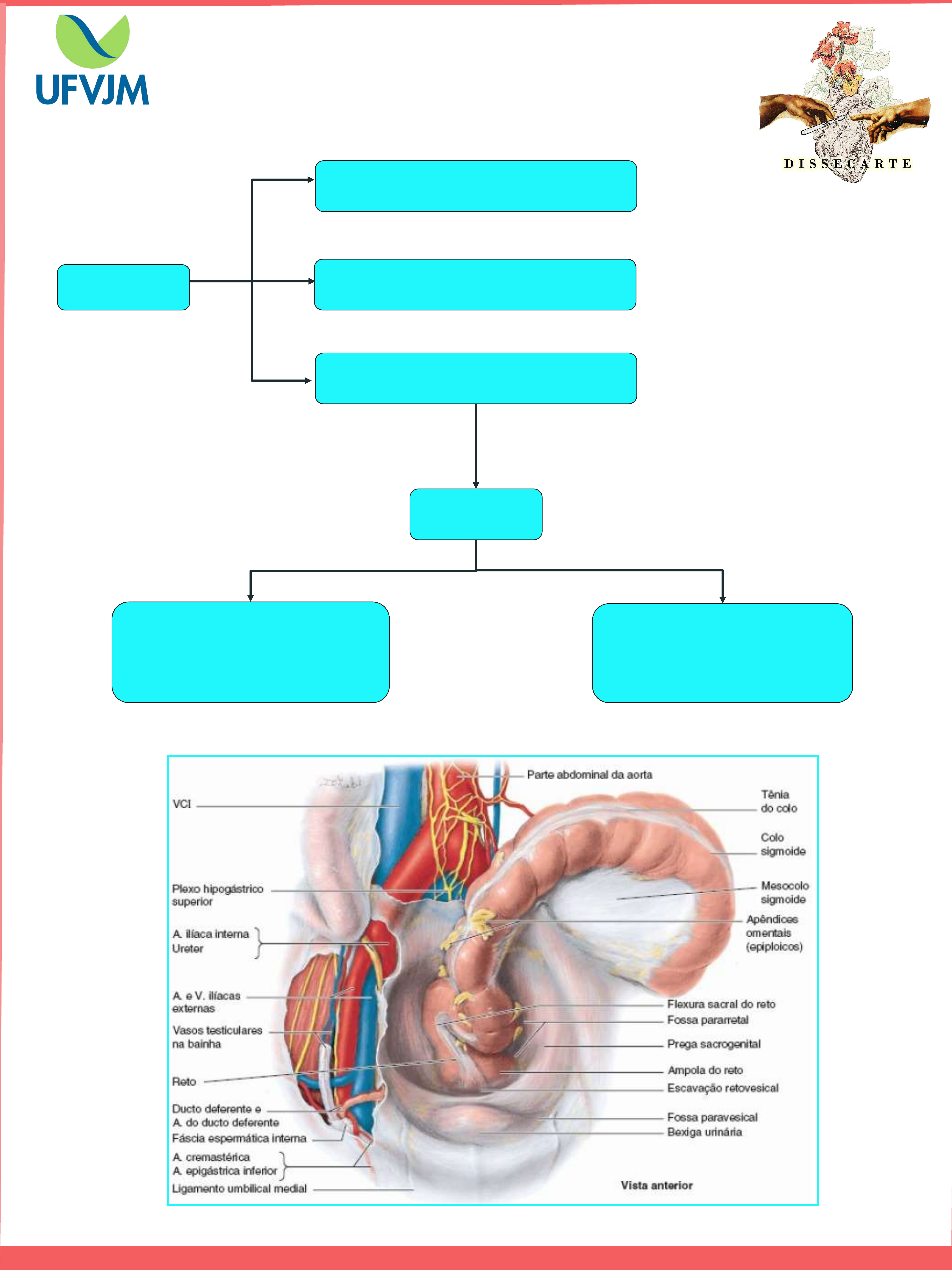 RETO Reto É a parte pélvica do sistema digestório É contínuo acima com o colo sigmoide no nível de S3 É contínuo abaixo com o canal anal Nesse ponto: As tênias do colo sigmoide afastam-se, formando uma lâmina longitudinal externa contínua de músculo liso Os apêndices omentais adiposos são interrompidos Fonte: Anatomia Orientada para a Clínica- Moore RETO Fonte: Anatomia Orientada para a Clínica- Moore Anteriormente, apresenta três flexuras laterais Superior e inferior no lado esquerdo, intermediária á esquerda Ampola do retoParte terminal dilatada do reto Recebe e retém uma massa fecal que se acumula até que seja expelida durante a defecação Fonte: Anatomia Orientada para a Clínica- Moore O musculo levantador do ânus ajuda a sustentar-la RETO Peritônio Cobre as faces anterior e lateral do terço superior do reto Cobre a face anterior do terço médio do reto Não cobre o terço inferior, que é subperitoneal Homem Mulher O peritônio reflete a partir do reto para a parede posterior da bexiga urinária Onde forma o assoalho da escavação retovesical O peritônio é refletido do reto para a parte posterior do fórnice da vagina Onde forma o assoalho da escavação retouterina Em ambos os sexos As reflexões laterais do peritônio do terço superior do reto formam as fossas pararretais Elas permitem que o reto se distenda enquanto se enche de fezes RETO Relações anatômicas Homens Ambos os sexos Mulheres Anteriormente: o reto relaciona-se com o fundo da bexiga, as partes terminais do ureteres, os ductos deferentes, as glândulas seminais e a próstata O reto situa-se posteriormente , adjacente às 3 vértebras sacrais inferiores Anteriormente: o reto relaciona-se com a vagina e é separado da parte posterior do fórnice e do colo pela escavação retouterina E ao cóccix, ao corpo anoccocígeo, aos vasos sacrais medianos e às extremidades inferiores dos troncos simpáticos e plexos sacrais O septo retovesical situa-se entre o fundo da bexiga e a ampola do reto e está associado às glândulas seminais e à próstata Inferiormente à escavação retouterina, o septo retovaginal separa a metade superior da parte posterior da vagina do reto Fonte: Atlas de Anatomia- Netter Fonte: Atlas de Anatomia- Netter RETO Irrigação Artéria mesentérica inferior Artéria retal superior Parte proximal do reto Divisões anteriores das artérias ilíacas internas Artérias retais médias direita e esquerda Parte média e inferior do reto Artérias pudendas internas Artérias retais inferiores Junção anorretal e canal anal Drenagem venosa Veia retal superior Sistema venoso porta Veias retais médias e inferior Sistema sistêmico Há anastomoses entre as veias portas e sistêmicas na parede do canal anal Plexo venoso retal Submucoso, circunda o reto e comunica-se com o plexo venoso vesical nos homens e com o plexo uterovaginal nas mulheres Interno Externo Localizada imediatamente profundo à túnica mucosa da junção anorretal Localizada externamente à parede muscular do reto RETO Fonte: Atlas de Anatomia- Netter RETO Inervação Simpática Provém da medula espinal lombar Parassimpática Provém do nervo S2-S4 da medula espinal Conduzida pelos nervos esplâncnicos lombares Provém dos plexos hipogástrico e pélvico Conduzida pelo plexo periarterial das artérias mesentéricas inferior e retal superior Segue pelos nervos esplâncnicos pélvicos e dos plexos hipogástricos inferiores esquerdo e direito até o plexo retal (pélvico)