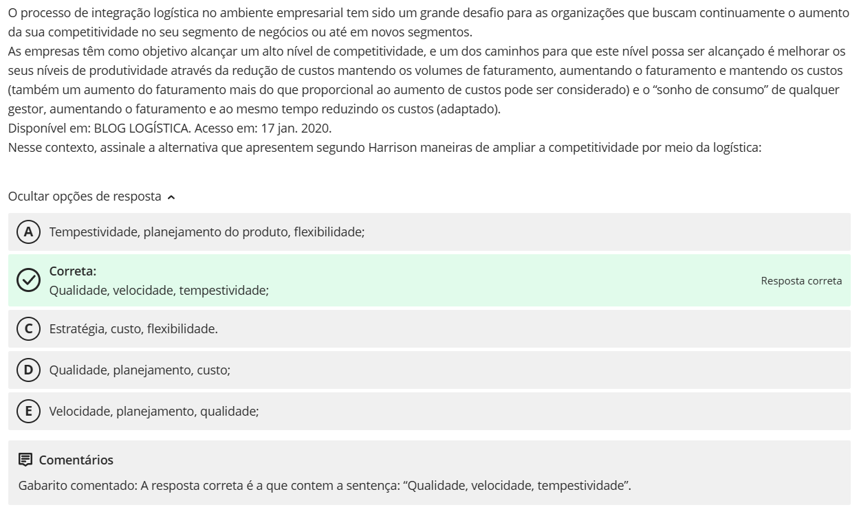 0:08:49 Questão 8/10 - Legislação Aplicada a Logística Ler em voz alta A Agência Nacional de Transportes Terrestres (ANTT) desempenha um papel cr...