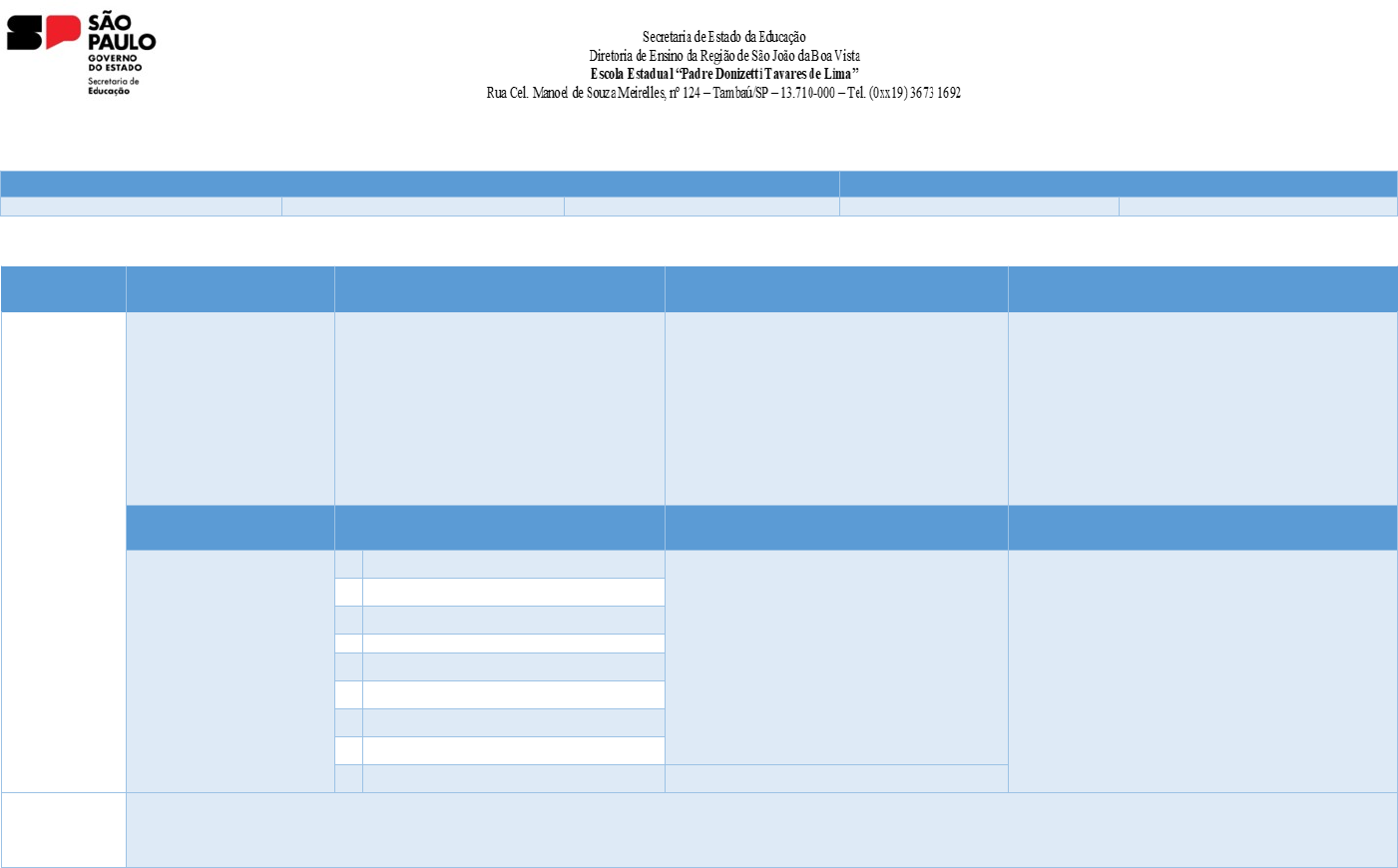 PLANO DE AULA AGOSTO/2024 PROFESSOR COMPONENTE CURRICULAR TURMA BIMESTRE PERÍODO Luci Natalina dos Santos Matemática 7ºA e 7ª B 3º 01 à 16/08 SEMANA NÚMERO DE AULAS PREVISTAS CONTEÚDO/ OBJETOS DE CONHECIMENTO OBJETIVOS METODOLOGIA 01/08 A 09/08 6 (EF06MA03) Solucionar e propor problemas que envolvam cálculos (mentais ou escritos, exatos ou aproximados) com números naturais, por meio de estratégias pessoais, com compreensão dos processos neles envolvidos com e sem uso de calculadora. (EF07MA04) Resolver e elaborar situações-problema que envolvam operações com números inteiros. • Solucionar problemas que envolvam cálculos escritos com números naturais; • Solucionar problemas que envolvam cálculos mentais com números naturais. · Correção das tarefas enviadas na aula anterior; · Desenvolvimento do conteúdo, utilizando estratégias das metodologias ativas, relacionando ao material digital. · Realização de atividades em duplas produtivas; · Correção das atividades realizadas; Envio de Tarefa ACOMP. E AVALIAÇÃO DA APRENDIZAGEM PLATAFORMAS ATIVIDADE REALIZADA - PLATAFORMA ACESSIBILIDADE CURRICULAR ALURA - Resolva situação-problema de três etapa (adição e subtração). - Resolva situação-problema de três etapas (adição e multiplicação). - Crie números inteiros com duas operações. REDAÇÃO PAULISTA KHAN ACADEMY x MATIFIC LEIA-SP ME SALVA EDUCATION FIRST TAREFA-SP HABILIDADES (EF06MA03) solucionar e resolver problemas que envolvam cálculos mentais ou escritos, exatos ou aproximados, com números naturais por meio de estratégias pessoais, com compreensão do processos neles envolvidos, com ou sem uso de calculadoras. image1.png image2.png