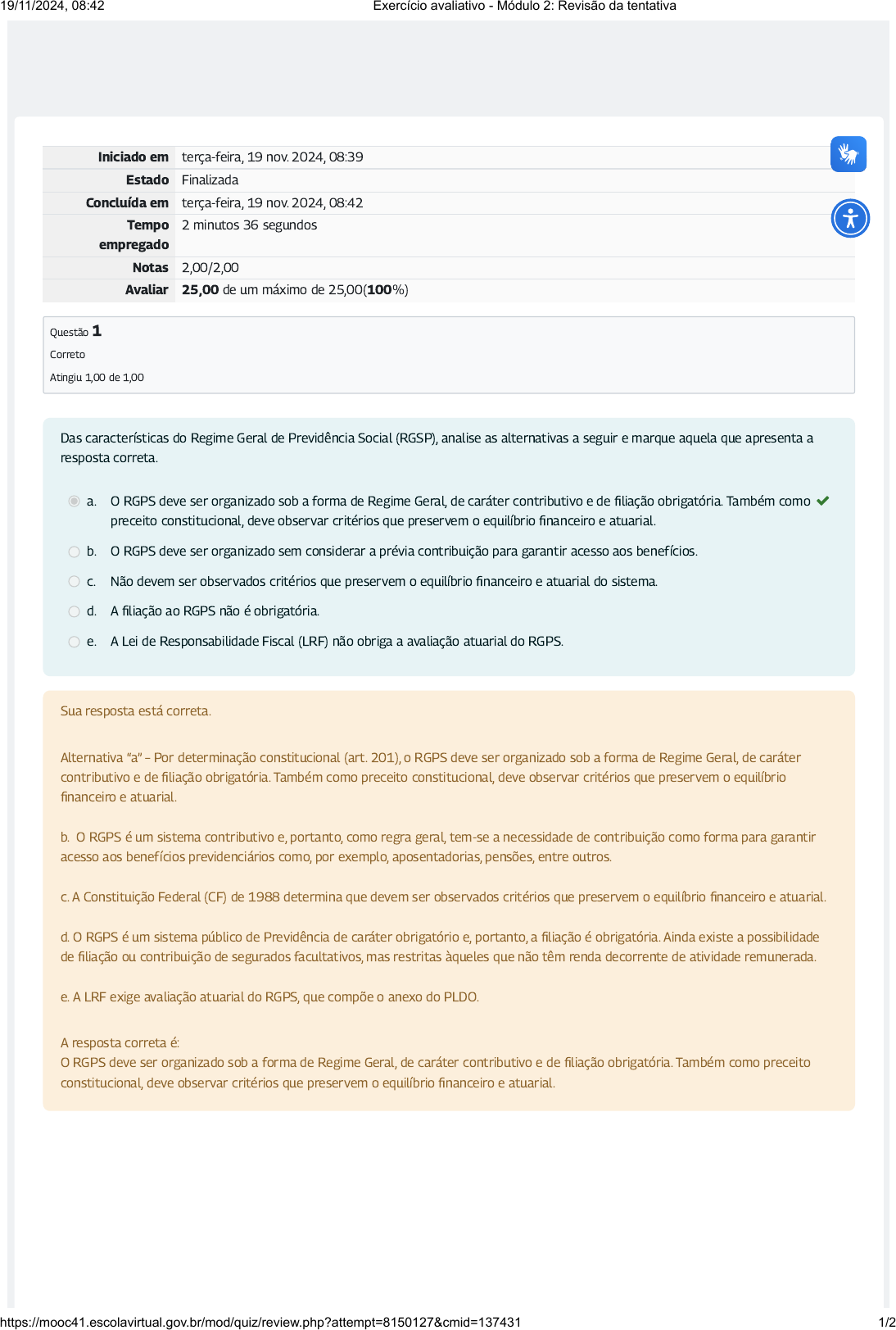 Iniciado em terça-feira, 19 nov. 2024, 08:39 Estado Finalizada Concluída em terça-feira, 19 nov. 2024, 08:42 Tempo empregado 2 minutos 36 segundos Notas 2,00/2,00 Avaliar 25,00 de um máximo de 25,00(100%) Questão 1 Correto Atingiu 1,00 de 1,00 Das características do Regime Geral de Previdência Social (RGSP), analise as alternativas a seguir e marque aquela que apresenta a resposta correta. a. O RGPS deve ser organizado sob a forma de Regime Geral, de caráter contributivo e de �liação obrigatória. Também como preceito constitucional, deve observar critérios que preservem o equilíbrio �nanceiro e atuarial. b. O RGPS deve ser organizado sem considerar a prévia contribuição para garantir acesso aos benefícios. c. Não devem ser observados critérios que preservem o equilíbrio �nanceiro e atuarial do sistema. d. A �liação ao RGPS não é obrigatória. e. A Lei de Responsabilidade Fiscal (LRF) não obriga a avaliação atuarial do RGPS. Sua resposta está correta. Alternativa “a” – Por determinação constitucional (art. 201), o RGPS deve ser organizado sob a forma de Regime Geral, de caráter contributivo e de �liação obrigatória. Também como preceito constitucional, deve observar critérios que preservem o equilíbrio �nanceiro e atuarial. b. O RGPS é um sistema contributivo e, portanto, como regra geral, tem-se a necessidade de contribuição como forma para garantir acesso aos benefícios previdenciários como, por exemplo, aposentadorias, pensões, entre outros. c. A Constituição Federal (CF) de 1988 determina que devem ser observados critérios que preservem o equilíbrio �nanceiro e atuarial. d. O RGPS é um sistema público de Previdência de caráter obrigatório e, portanto, a �liação é obrigatória. Ainda existe a possibilidade de �liação ou contribuição de segurados facultativos, mas restritas àqueles que não têm renda decorrente de atividade remunerada. e. A LRF exige avaliação atuarial do RGPS, que compõe o anexo do PLDO. A resposta correta é: O RGPS deve ser organizado sob a forma de Regime Geral, de caráter contributivo e de �liação obrigatória. Também como preceito constitucional, deve observar critérios que preservem o equilíbrio �nanceiro e atuarial. 19/11/2024, 08:42 Exercício avaliativo - Módulo 2: Revisão da tentativa https://mooc41.escolavirtual.gov.br/mod/quiz/review.php?attempt=8150127&cmid=137431 1/2 Questão 2 Correto Atingiu 1,00 de 1,00 Sobre o Regime Geral de Previdência Social (RGPS), é possível a�rmar que: a. O RGPS garante a cobertura contra eventos de incapacidade temporária ou permanente para o trabalho e idade avançada, proteção à maternidade e ao trabalhador em situação de desemprego involuntário, salário-família e auxílio-reclusão para os dependentes dos segurados de baixa renda e pensão por morte ao cônjuge ou companheiro e dependentes. b. Há diferentes tipos de segurados com distintos planos de benefícios, como, por exemplo, empregados, contribuintes individuais e segurados especiais. c. Antes da Emenda Constitucional nº 103/2019, o RGPS oferecia dez tipos ou espécies de benefícios. d. O salário-mínimo é o piso legal de remuneração no mercado de trabalho e na Seguridade e Previdência Social, aplicado tanto para benefícios contributivos quanto não contributivos. e. Todas as alternativas estão corretas. Sua resposta está correta. Alternativa “e” – todas as alternativas estão corretas. a. O RGPS oferece uma ampla gama de benefícios, como cobertura contra eventos de incapacidade temporária ou permanente para o trabalho, idade avançada, proteção à maternidade e ao trabalhador em situação de desemprego involuntário, salário-família, auxílio- reclusão para os dependentes dos segurados de baixa renda e pensão por morte ao cônjuge ou companheiro e dependentes. b. Existem diferentes tipos de segurados que possuem distintos planos de custeio e de benefícios. A de�nição legal desses segurados e, os respectivos, planos de custeio e benefícios podem ser encontrados nas Leis 8.212/1991 e 8.213/1991, bem como na EC 103/2019. c. Como foi mostrado, o salário-mínimo é o menor valor de remuneração permitido legalmente para ser aplicado tanto no mercado de trabalho como nos benefícios da Seguridade e Previdência Social. d. O RGPS é a maior política de transferência de renda do país e respondeu, em 2022, por 44% da despesa primária do governo central. A resposta correta é: Todas as alternativas estão corretas. 19/11/2024, 08:42 Exercício avaliativo - Módulo 2: Revisão da tentativa https://mooc41.escolavirtual.gov.br/mod/quiz/review.php?attempt=8150127&cmid=137431 2/2