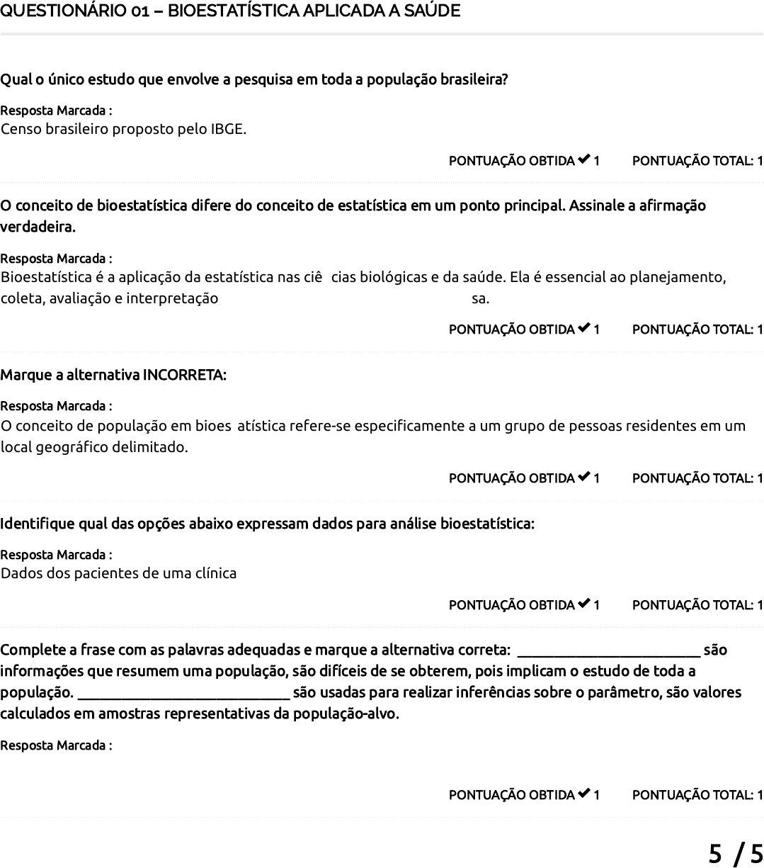 5 / 5 QUESTIONÁRIO 01 – BIOESTATÍSTICA APLICADA A SAÚDE PONTUAÇÃO TOTAL: 1PONTUAÇÃO OBTIDA 1 Qual o único estudo que envolve a pesquisa em toda a população brasileira? Resposta Marcada : Censo brasileiro proposto pelo IBGE. PONTUAÇÃO TOTAL: 1PONTUAÇÃO OBTIDA 1 O conceito de bioestatística difere do conceito de estatística em um ponto principal. Assinale a a�rmação verdadeira. Resposta Marcada : Bioestatística é a aplicação da estatística nas ciências biológicas e da saúde. Ela é essencial ao planejamento, coleta, avaliação e interpretação de todos os dados obtidos em pesquisa. PONTUAÇÃO TOTAL: 1PONTUAÇÃO OBTIDA 1 Marque a alternativa INCORRETA: Resposta Marcada : O conceito de população em bioestatística refere-se especi�camente a um grupo de pessoas residentes em um local geográ�co delimitado. PONTUAÇÃO TOTAL: 1PONTUAÇÃO OBTIDA 1 Identi�que qual das opções abaixo expressam dados para análise bioestatística: Resposta Marcada : Dados dos pacientes de uma clínica de vacinas. PONTUAÇÃO TOTAL: 1PONTUAÇÃO OBTIDA 1 Complete a frase com as palavras adequadas e marque a alternativa correta: _________________________ são informações que resumem uma população, são difíceis de se obterem, pois implicam o estudo de toda a população. _____________________________ são usadas para realizar inferências sobre o parâmetro, são valores calculados em amostras representativas da população-alvo. Resposta Marcada : Parâmetros, Estimativas. Total de Pontos 19/11/2024, 08:55 Course Status – AVA Saúde Unifaveni https://ava.saude.unifaveni.com.br/course-status/ 1/1