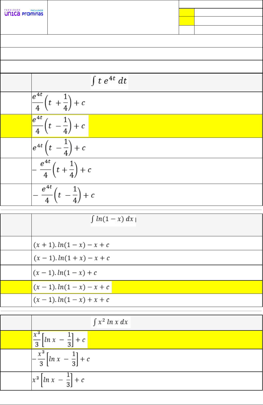 Pincel Atômico - 11/07/2024 14:55:41 1/3 NILSON AJERONIMO DA SILVA Exercício Caminho do Conhecimento - Etapa 20 (17298) Atividade finalizada em 08/07/2024 16:41:39 (2336645 / 1) LEGENDA Resposta correta na questão # Resposta correta - Questão Anulada X Resposta selecionada pelo Aluno Disciplina: TEORIA DOS NÚMEROS [1160670] - Avaliação com 8 questões, com o peso total de 1,67 pontos [capítulos - 4] Turma: Segunda Graduação: Segunda Graduação 6 meses - Licenciatura em Matemática - Grupo: FPD-JUN/2024 - SGegu0A220624 [130032] Aluno(a): 91562660 - NILSON AJERONIMO DA SILVA - Respondeu 7 questões corretas, obtendo um total de 1,46 pontos como nota [356432_70349] Questão 001 Calculando a integral pelo método da integração por partes, teremos : X [356433_70352] Questão 002 Calculando a integral pelo método da integração por partes, teremos : X [356432_70350] Questão 003 Calculando a integral pelo método da integração por partes, teremos : X Pincel Atômico - 11/07/2024 14:55:41 2/3 [356432_175459] Questão 004 Calculando a integral ∫ xln(x) dx pelo método da integração por partes, teremos: X [356432_175490] Questão 005 Calculando a integral ∫π x sen 2x dx pelo método da integração por partes, teremos: –π/4 π/3 –π/2 π/4 X π/2 [356434_70355] Questão 006 Calculando a integral pelo método da integração por partes, teremos : 2 -1 X 1 0 - 2 [356432_175461] Questão 007 Calculando a integral ∫ex sen(x) dx pelo método da integração por partes, teremos: X Pincel Atômico - 11/07/2024 14:55:41 3/3 [356433_70354] Questão 008 Calculado a integral pelo método da integração por partes, teremos : X
