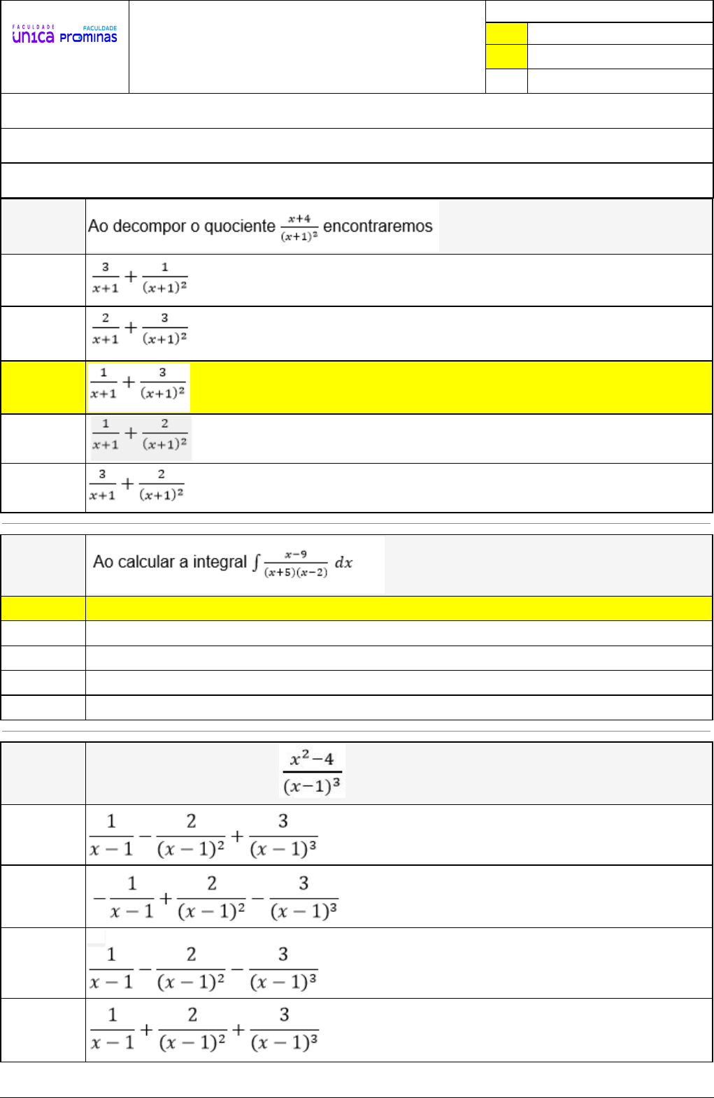 Pincel Atômico - 11/07/2024 14:57:19 1/3 NILSON AJERONIMO DA SILVA Exercício Caminho do Conhecimento - Etapa 22 (17299) Atividade finalizada em 08/07/2024 17:09:36 (2336646 / 1) LEGENDA Resposta correta na questão # Resposta correta - Questão Anulada X Resposta selecionada pelo Aluno Disciplina: TEORIA DOS NÚMEROS [1160670] - Avaliação com 8 questões, com o peso total de 1,67 pontos [capítulos - 5] Turma: Segunda Graduação: Segunda Graduação 6 meses - Licenciatura em Matemática - Grupo: FPD-JUN/2024 - SGegu0A220624 [130032] Aluno(a): 91562660 - NILSON AJERONIMO DA SILVA - Respondeu 8 questões corretas, obtendo um total de 1,67 pontos como nota [356432_175498] Questão 001 X [356432_175502] Questão 002 X 2 ln | x + 5 | – ln | x – 2 | + c – 2 ln | x + 5 | + ln | x – 2 | + c 2 ln | x + 5 | + ln | x – 2 | + c – 2 ln | x + 5 | – ln | x – 2 | + c ln | x + 5 | – ln | x - 2 | + c [356432_70359] Questão 003 Ao decompor o quociente encontraremos : Pincel Atômico - 11/07/2024 14:57:19 2/3 X [356432_70358] Questão 004 Ao decompor o quociente encontraremos : X [356432_175504] Questão 005 X [356432_175500] Questão 006 X Pincel Atômico - 11/07/2024 14:57:19 3/3 [356432_175497] Questão 007 X [356432_70357] Questão 008 Ao decompor o quociente encontraremos : X