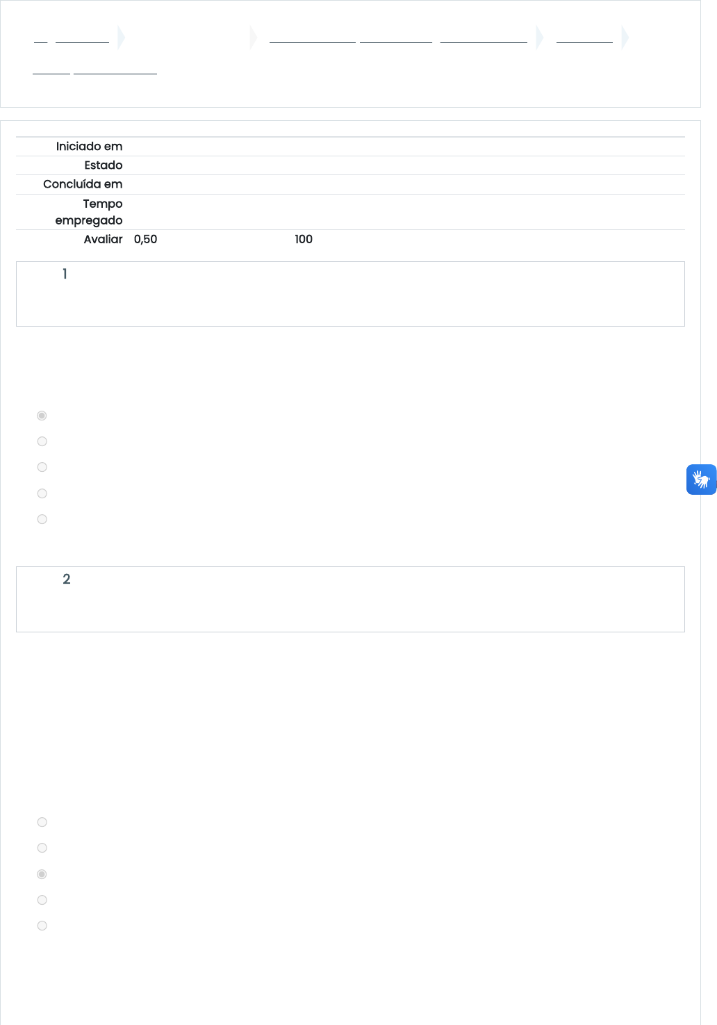 Página inicial Minhas disciplinas 2023/4 - Produção e Tecnologia de Sementes UNIDADE II Avaliação - Unidade II Iniciado em quinta, 16 nov 2023, 13:12 Estado Finalizada Concluída em quinta, 16 nov 2023, 13:16 Tempo empregado 3 minutos 59 segundos Avaliar 0,50 de um máximo de 0,50(100%) Questão 1 Correto Atingiu 0,05 de 0,05 Questão 2 Correto Atingiu 0,05 de 0,05 A dormência é um mecanismo fisiológico que permite que as sementes distribuam sua germinação ao longo do tempo. Sobre a dormência, assinale a alternativa correta. a. As sementes dormentes deixam de germinar mesmo se houver as condições ideais. b. As sementes dormentes germinam se lhes forem fornecidas temperatura e umidade adequadas. c. As sementes dormentes germinam se lhes for fornecida temperatura adequada. d. As sementes dormentes germinam se lhes for fornecida umidade adequada. e. As sementes dormentes não podem germinar apenas se não houver todas as condições essenciais. A dormência secundária é desencadeada por fatores genotípicos em conjunto com fatores ambientais. Sobre a dormência secundária, responda com verdadeiro (V) ou falso (F). ( ) Embrião imaturo é uma causa de dormência. ( ) Impermeabilidade à água é uma causa de dormência. ( ) Tecido de reserva deteriorado é uma causa de dormência. ( ) Restrições mecânicas são causa de dormência. ( ) Inibidores internos são causa de dormência. a. F, F, V, V, F. b. F, V, V, V, F. c. V, V, F, V, V. d. V, V, V, F, F. e. V, V, V, F, V. https://ambienteonline.uninga.br/ https://ambienteonline.uninga.br/course/view.php?id=22234 https://ambienteonline.uninga.br/course/view.php?id=22234§ion=3 https://ambienteonline.uninga.br/mod/quiz/view.php?id=620783 Questão 3 Correto Atingiu 0,05 de 0,05 Questão 4 Correto Atingiu 0,05 de 0,05 Questão 5 Correto Atingiu 0,05 de 0,05 A germinação da semente é afetada por diversos fatores, que podem ser internos ou externos. Assinale a alternativa que corresponde aos principais fatores externos que afetam a germinação. a. Água, viabilidade, oxigênio e luz. b. Água, longevidade, oxigênio e luz. c. Água, temperatura, oxigênio e luz. d. Água, temperatura, dormência e luz. e. Água, temperatura, dormência e viabilidade. Algumas plantas apresentam um mecanismo de germinação pelo qual a parte aérea da plântula é protegida por uma estrutura denominada coleóptilo. Assinale a alternativa que corresponde ao grupo de plantas que apresentam essa estrutura. a. Gramíneas b. Traqueófitas c. Criptógamas d. Leguminosas e. Pteridófitas As plântulas enquadram-se em duas classes em relação ao destino de seus cotilédones durante a germinação. Marque a alternativa correta em relação às plantas epígeas. a. São as plântulas em que o coleóptilo que cresce é lançado acima do nível do solo. b. São as plântulas em que os cotilédones não se formam na semente. c. São as plântulas cujos cotilédones permanecem no solo durante a germinação. d. São as plântulas em que os cotilédones são totalmente exauridos antes da germinação. e. São as plântulas que erguem seus cotilédones acima da superfície do solo durante a germinação. Questão 6 Correto Atingiu 0,05 de 0,05 Questão 7 Correto Atingiu 0,05 de 0,05 Questão 8 Correto Atingiu 0,05 de 0,05 Como vantagem para as plantas, a dormência permite que a semente sobreviva a condições adversas, como inverno rigoroso ou um período de seca, por exemplo. I - É conhecida como dormência pós-colheita. II - É uma maneira de evitar a viviparidade. III - É uma característica própria da semente, superada com um período de armazenamento relativamente curto para a maioria das espécies. IV - Pode ser induzida por condições desfavoráveis. Em relação à dormência primária ou natural, assinale a alternativa correta a. Somente as afirmativas I, II e III estão corretas. b. Somente as afirmativas II, III e IV estão corretas. c. Somente as afirmativas I e II estão corretas. d. Somente as afirmativas II e III estão corretas. e. Somente a afirmativa IV está correta. Na germinação, as plântulas enquadram-se em duas classes em relação ao destino de seus cotilédones durante o crescimento do caule. Marque a alternativa correta em relação às plantas hipógeas. a. São as plântulas que erguem seus cotilédones acima da superfície do solo durante a germinação. b. São as plântulas cujos cotilédones permanecem no solo durante a germinação. c. São as plântulas em que a coleorriza que cresce é lançada acima do nível do solo. d. São as plântulas em que os cotilédones são totalmente exauridos antes da germinação. e. São as plântulas em que os cotilédones não se formam na semente. O ponto de maturidade fisiológica é variável de uma espécie para outra e entre variedades da mesma espécie. Assinale a alternativa que corresponde ao principal objetivo de determinar o ponto de maturidade fisiológica na produção de sementes. a. Determinar a qualidade fitossanitária das sementes. b. Determinar quais máquinas serão usadas no beneficiamento. c. Determinar o ponto ideal de colheita, visando à qualidade das sementes. d. Determinar o percentual de germinação. e. Determinar a forma de armazenamento. Questão 9 Correto Atingiu 0,05 de 0,05 Questão 10 Correto Atingiu 0,05 de 0,05 Para que a semente germine, é necessário que ela satisfaça algumas condições. Sobre as condições para que a semente possa desencadear a germinação, responda com verdadeiro (V) ou falso (F). ( ) A semente precisa estar viável. ( ) A semente precisa estar livre de dormência. ( ) As condições de água e temperatura precisam ser favoráveis. ( ) O processo de deterioração não afeta a germinação. ( ) A semente não pode estar quiescente. a. F, F, V, V, F. b. V, V, V, F, V. c. V, V, V, F, F. d. V, V, F, V, V. e. F, V, V, V, F. Um conjunto de eventos bioquímicos e fisiológicos ocorre durante a germinação. Dentro deste contexto, 
