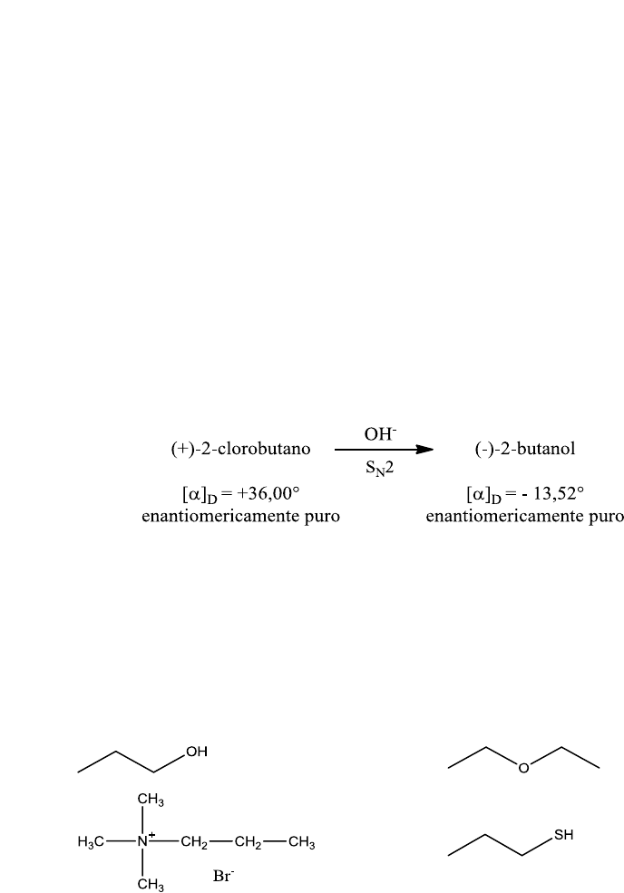 LISTA DE QUÍMICA ORGÂNICA – REAÇÕES IÔNICAS 1) Utilizando estruturas conformacionais de cadeira, mostre a reação de substituição nucleofílica que ocorre quando o trans-1-bromo-4-tert-butilcicloexano reage com o íon iodeto. (Mostre a conformação mais estável do reagente e do produto.) 2) As reações SN2 que envolvem quebra de uma ligação de um centro de quiralidade podem ser utilizadas para relacionar as configurações de moléculas porque a estereoquímica da reação é conhecida. (a) Ilustre como isso é verdadeiro determinando as configurações para os enantiômeros do 2- clorobutano com base nos seguintes dados. [A configuração do (–)-2-butanol é (R)] (b) Quando o (+)-2-clorobutano oticamente puro é deixado reagir com o iodeto de potássio em acetona em uma reação SN2, o 2-iodobutano que é produzido tem uma rotação negativa. Qual é a configuração do (-)-2-iodobutano? E do (+)-2-iodobutano? 3) Mostre como você poderia utilizar uma reação de substituição nucleofílica do 1-bromopropano para sintetizar cada um dos seguintes compostos. Mostre o mecanismo. (Você pode utilizar qualquer outro composto que seja necessário.) (a) (b) (c) (d) 4) Que reação SN2 de cada par você espera que ocorra mais rapidamente em um solvente prótico? (a) (1) CH3CH2CH2Cl + CH3CH2O – CH3CH2CH2OCH2CH3 + Cl – (2) CH3CH2CH2Cl + CH3CH2OH CH3CH2CH2OCH2CH3 + HCl (b) (1) CH3CH2CH2Cl + CH3CH2O – CH3CH2CH2OCH2CH3 + Cl – (2) CH3CH2CH2Cl + CH3CH2S – CH3CH2CH2SCH2CH3 + Cl– 5) Qual reação SN1 de cada par para você espera que ocorra mais rapidamente? Justifique sua resposta. (a) (1) (CH3)3CCl + H2O (CH3)3COH + HCl (2) (CH3)3CBr + H2O (CH3)3COH + HBr (b) (1) (CH3)3CCl + H2O (CH3)3COH + HCl (2) (CH3)3CCl + CH3OH (CH3)3COCH3 + HCl 6) Com haletos de metila, etila ou ciclopentila como seus materiais orgânicos de partida e utilizando quaisquer solventes ou reagentes inorgânicos necessários, esboce as sínteses de cada um dos seguintes compostos. Mais de uma etapa pode ser necessária e você não precisa repetir as etapas realizadas nos itens anteriores deste problema. (a) CH3I (b) CH3CN (c) CH3OCH3 (d) CH3CH2SH (e) CH3OCH2CH3 (f) Ciclopenteno 7) Qual produto (ou produtos) você esperaria obter a partir de cada uma das seguintes reações? Em cada item dê o mecanimos (SN1, SN2, E1 ou E2) pelo qual cada produto é formado e preveja a quantidade relativa da cada produto (i.e., o produto seria o único produto, o produto principal ou o produto minoritário, etc?). (a) CH3CH2CH2CH2CH2Br + CH3CH2O - 50°C CH3CH2OH (b) CH3CH2CH2CH2CH2Br + (CH3)3CO- 50°C (CH3)3COH (c) (CH3)CBr + CH3CH2O - 50°C CH3CH2OH (d) + (CH3)3CO- 50°C (CH3)3COH (CH3)CBr (e) + Cl (CH3)3C I- 50°C acetona (f) Cl (CH3)3C CH3 25°C CH3OH (g) 25°C CH3OH (S)-3-bromo-3-metilexano (h) + I- 50°C CH3OH (S)-2-bromooctano 8) Qual reagente em cada par relacionado seria o nucleófilo mais reativo em um solvente polar aprótico? (a) CH3NH – ou CH3NH2 (b) H2O ou H3O + (c) NH3 ou NH4 + (d) CH3SH ou CH3OH (e) H2S ou HS – (f) (C6H5)3N ou (C6H5)3P 9) Escreva os mecanismos que explicam os produtos das seguintes reações: (a) HOCH2CH2Br OH- H2O O (b) H2NCH2CH2CH2CH2Br OH- H2O N 10) Forneça as estruturas para os produtos de cada uma das seguintes reações: (a) acetona H Br F H + NaI (1 mol) C5H8FI + NaBr (b) 1,2-dibromoetano (1 mol) + NaSCH2CH2SNa C4H8S2 + 2 NaBr (c) Propino + NaNH2 (-NH3) NH3 liq C3H3Na C4H6 + NaI CH3I 11) A S-adenosina (SAM) metila o átomo de hidrogênio da noradrenalina para formar a adrenalina, um hormônio mais potente. Se em vez disso o SAM metilar um grupo OH no anel de benzeno, ele destrói completamente a atividade da noradrenalina. Dê um mecanismo para a metilação do grupo OH pela SAM. 12) Coloque as seguintes substâncias em ordem decrescente de reatividade em reações E2. Explique sua resposta. 13) Para cada uma das seguintes substâncias, dê os produtos que seriam formados em uma reação E2 e indique a configuração do produto: (a) (1S, 2S)-1-bromo-1,2-difenilpropano (b) (1S, 2R)-1-bromo-1,2-difenilpropano