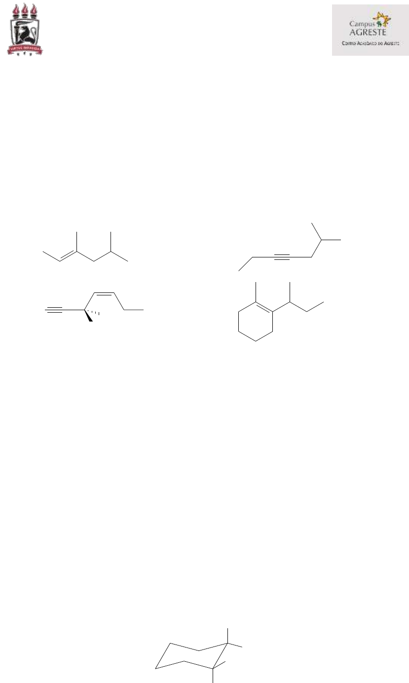 UNIVERSIDADE FEDERAL DE PERNAMBUCO CENTRO ACADÊMICO DO AGRESTE NÚCLEO DE FORMAÇÃO DOCENTE LISTA DE QUÍMICA ORGÂNICA – ALCENOS E ALCINOS I 1) Escreva uma fórmula estrutural para cada um dos seguintes compostos: (a) 3-metilciclobuteno (b) 2,3-dimetil-2-penteno (c) (E)-2-Penteno (d) 3,3,3-tribromopropeno (e) (Z, 4R)-4-metil-2-hexeno (f) (E, 4S)-4-cloro-2-penteno (g) (R)-4-cloro-2-pentino (h) (E)-4-metilex-4-eno-1-ino 2) Dê os nomes IUPAC para cada um dos seguintes compostos: (a) (b) (c) Cl H (d) 3) Esboce uma síntese do propeno a partir de cada um dos seguintes compostos: (a) Cloreto de propila (b) Cloreto de isopropila (c) Álcool isopropílico (d) Propino 4) Esboce uma síntese do ciclopenteno a partir de cada um dos seguintes compostos: (a) Bromociclopentano (b) Ciclopentanol 5) Começando com o etino, esboce as sínteses de cada um dos seguintes compostos. Você pode utilizar quaisquer outros reagentes necessários. (a) Propino (b) 1-Butino (c) 2-Butino (d) cis-2-Buteno (e) trans-2-Buteno (e) Z-2-Hexeno 6) Começando com o 1-metilcicloexeno e utilizando quais quer outros reagentes, esboce uma síntese para o seguinte compostos marcado com deutério: D H D CH3 7) Esboce uma síntese do feniletino a partir de cada um dos seguintes compostos: (a) 1,1-dibromo-2-feniletano (b) Feniletileno 8) Dê os produtos que serão formados quando cada um dos seguintes álcoois for submetido à desidratação catalisada por ácido. Se mais de um produto for formado, designe o alceno que seria o produto principal. (Despreze o isomerismo cis-trans) (a) 3-metil-2-butanol (b) 2,2-dimetil-1-propanol 9) Forneça explicações através de mecanismos para cada uma das seguintes ocorrências: (a) A desidratação catalisada por ácido do 1-butanol produz o trans-2-buteno como produto principal. (b) A desidratação catalisada por ácido do 2,2-dimetilcicloexanol produz o 1,2-dimetilcicloexeno como produto principal. 10) Escreva a estrutura do(s) produto(s) principal(is) obtido(s) quando o 2-cloro-2,3-dimetilbutano (qualquer enantiômero) reage com (a) etóxido de sódio (EtONa) em etanol (EtOH) a 80°C ou com (b) terc-butóxido de potássio (t-BuOK) em álcool terc-butílico (t-BuOH) a 80°C. Se mais de um produto é formado, indique qual se espera que seja o produto principal. (c) Proponha um mecanismo detalhado para a formação do produto principal de cada reação. 11) Explique, utilizando argumentos mecanísticos envolvendo projeções de Newman ou outras fórmulas tridimensionais, por que a reação do 2-bromo-1,2-difenilpropano (qualquer enantiômero) com etóxido de sódio (EtONa) em etanol (EtOH) a 80°C produz principalmente (E)-1,2-difenilpropeno. 12) (a) Escreva a(s) estrutura(s) do(s) produto(s) formado(s) quando o 1-metilciclo-hexanol reage com H3PO4 concentrado (85%) a 150°C. (b) Escreva o mecanismo detalhado para a reação. 13) Considere a reação do 1-ciclobutiletanol com H2SO4 concentrado a 120°C. Escreva as estruturas de todos os possíveis produtos orgânicos. Supondo que o metilciclopenteno seja um dos produtos, escreva um mecanismo que explique a sua formação. Escreva os mecanismos que expliquem a formação de todos os demais produtos.