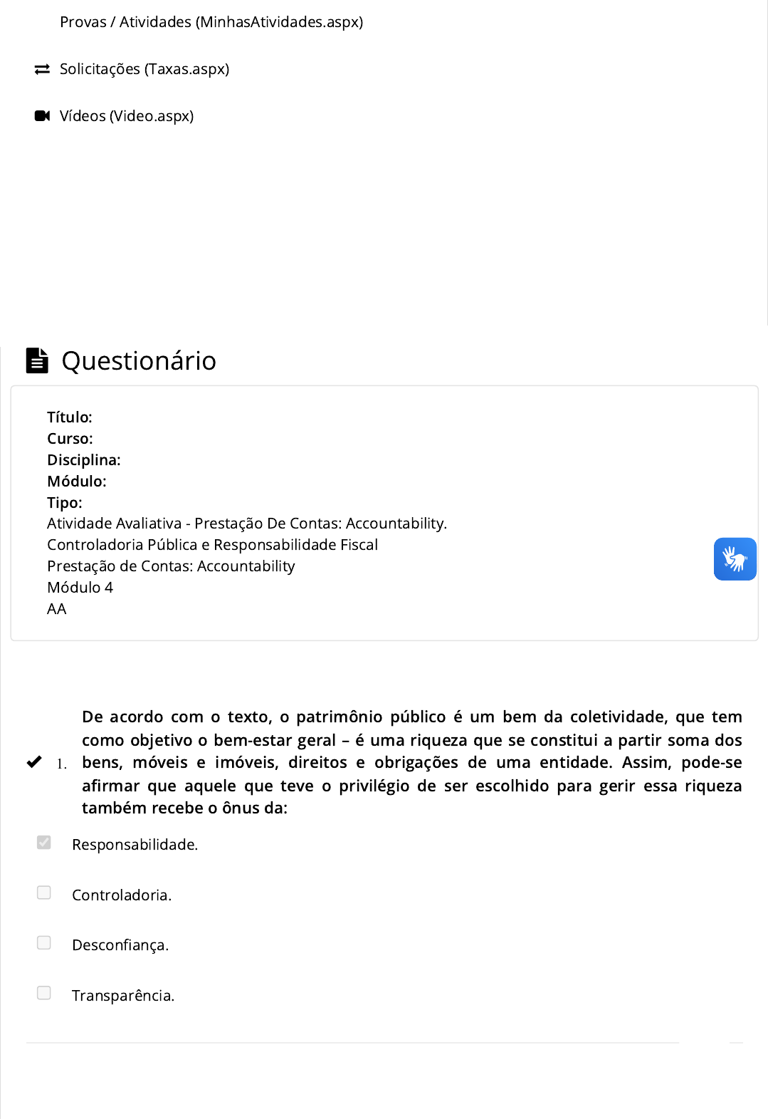 7,2 mil pessoas curtiram isso. Seja a primeira pessoa entre seus amigos. Curtir Provas / Atividades (MinhasAtividades.aspx) Solicitações (Taxas.aspx) Vídeos (Video.aspx) Questionário De acordo com o texto, o patrimônio público é um bem da coletividade, que tem como objetivo o bem-estar geral – é uma riqueza que se constitui a partir soma dos bens, móveis e imóveis, direitos e obrigações de uma entidade. Assim, pode-se a�rmar que aquele que teve o privilégio de ser escolhido para gerir essa riqueza também recebe o ônus da: Responsabilidade. Controladoria. Descon�ança. Transparência. Título: Curso: Disciplina: Módulo: Tipo: Atividade Avaliativa - Prestação De Contas: Accountability. Controladoria Pública e Responsabilidade Fiscal Prestação de Contas: Accountability Módulo 4 AA 1. https://cursor.unina.edu.br/Account/MinhasAtividades.aspx https://cursor.unina.edu.br/Account/Taxas.aspx https://cursor.unina.edu.br/Account/Video.aspx “Cada poder tem suas ferramentas para a�rmar suas convicções e fazer valer a sua autoridade, de forma legítima e e�caz, sem que haja questionamento, muito embora tais práticas provoquem atritos e dissabores na harmonia entre a estrutura de poderes”. Nesse sentido, o executivo lança mão de: Inconstitucionalidade. Emendas constitucionais. Medidas Provisórias. Recursos legais. Conforme o texto, o exercício de accountability envolve muitas dimensões e muitas discussões a respeito de sua prática: Gerencial. Empírica. Pedagógica. Legal. De acordo com o material didático, o conceito de compliance remete a um sistema de regras que visa o cumprimento das normas estabelecidas por uma entidade, relacionado ao comportamento: Ético. Espontâneo. Político. Gerencial. Somos clientes do setor público em relação aos serviços e produtos que ele oferece. Como clientes adimplentes e onerados, temos direito aos serviços e produtos a preços justos e de qualidade. A ferramenta que temos para saber se isso está de fato ocorrendo é o: Acompanhamento orçamentário. 2. 3. 4. 5. Código de defesa do consumidor. Código civil. Acompanhamento de cnpj. Responsividade é um termo ligado à accountability e seu sentido quer dizer: Ser responsabilizado. Responder de forma rápida, tempestiva e adequada ao que lhe é perguntado. Ser responsável. Responder de acordo com as normas. De acordo com o material didático, um governo populista é aquele em que: Governa para todas as classes sociais. Governa apenas para as elites. O governante utiliza vários recursos para obter apoio das classes menos favorecidas economicamente. Governa de maneira anárquica. “Sendo assim, a CPI tem poderes para investigar e �scalizar qualquer desvio da máquina pública, podendo convocar pessoas, requisitar documentos, provas e diligências”. Conforme apontado no texto, neste momento, o seu poder passa a ser: De apelação. Judiciário. Executivo. Legislativo puro. O termo accountability é de difícil tradução em apenas uma palavra em português e os estudiosos resolveram mantê-lo em seu estado original. Nesse sentido, o termo pode ser explicado como: 6. 7. 8. 9. UNINA Copyright © 2011 - 2024. Todos direitos reservados. Contabilidade do setor público. Prestação de contas. Orçamento. Contabilidade. Quando se fala em exercício de cidadania, o que se quer dizer é a busca pelo conhecimento de bases legais que regulamentam o exercício dos poderes. Um exemplo disso é o orçamento público; essa ferramenta orçamentária tem normas, poder de lei, e devem ser seguidas, desse modo, nenhum gestor público pode: Escutar as opiniões da população. Prometer o que não pode cumprir. Deixar promessas fora do orçamento. Incentivar em excesso a área da cultura. 10.