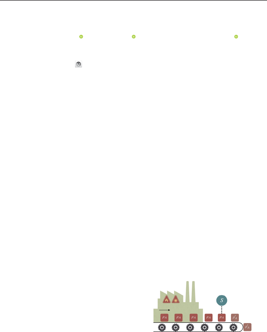 Thermodynamics of Weakly Coherent Collisional Models Franklin L. S. Rodrigues ,1 Gabriele De Chiara ,2 Mauro Paternostro,2 and Gabriel T. Landi 1,* 1Instituto de Física da Universidade de São Paulo, 05314-970 São Paulo, Brazil 2Centre for Theoretical Atomic, Molecular and Optical Physics, School of Mathematics and Physics, Queen’s University Belfast, Belfast BT7 1NN, United Kingdom (Received 24 June 2019; published 3 October 2019) We introduce the idea of weakly coherent collisional models, where the elements of an environment interacting with a system of interest are prepared in states that are approximately thermal but have an amount of coherence proportional to a short system-environment interaction time in a scenario akin to well- known collisional models. We show that, in the continuous-time limit, the model allows for a clear formulation of the first and second laws of thermodynamics, which are modified to include a nontrivial contribution related to quantum coherence. Remarkably, we derive a bound showing that the degree of such coherence in the state of the elements of the environment represents a resource, which can be consumed to convert heat into an ordered (unitarylike) energy term in the system, even though no work is performed in the global dynamics. Our results therefore represent an instance where thermodynamics can be extended beyond thermal systems, opening the way for combining classical and quantum resources. DOI: 10.1103/PhysRevLett.123.140601 Introduction.—The laws of thermodynamics provide operationally meaningful prescriptions on the tasks one may perform, given a set of available resources. The second law, in particular, sets strict bounds on the amount of work that can be extracted in a certain protocol. Most processes in nature, however, are not thermodynamic and therefore do not enjoy such a simple and far-reaching set of rules. One is then led to ask whether there exists scenarios “beyond thermal” for which a clear set of thermodynamic rules can nonetheless be constructed. This issue has recently been addressed, e.g., in the context of nonthermal heat engines [1–3], squeezed thermal baths [4–6], coherence amplifica- tion [7], information flows [8], and quantum resource theories [9–11]. The question also acquires additional meaning in light of recent experimental demonstrations that quantum effects can indeed be used as thermodynamic resources [12,13]. A framework that is particularly suited for addressing the thermodynamics of engineered reservoirs is that of colli- sional models (also called repeated interactions) [14–27]. They draw inspiration from Boltzmann’s original Stosszahlansatz: At any given interval of time, the system S will only interact with a tiny fraction of the environment. For instance, in Brownian motion, a particle interacts with only a few water molecules at a time. Moreover, this interaction lasts for an extremely short time, after which the molecule moves on, never to return [28]. Since the environment is large, the next molecule to arrive will be completely uncorrelated from the previous one, so the process repeats anew. In the context of quantum systems, this process is depicted in Fig. 1, where the system S interacts sequentially with a multiparty environment whose elements, henceforth dubbed ancillae An, are assumed to be mutually indepen- dent and prepared, in general, in arbitrary states. This process generates a stroboscopic evolution for the reduced density matrix of the system, akin to a discrete-time Markov chain. A continuous-time description in terms of a Lindblad master equation can be derived in the short-time limit, provided some assumptions are made about the system-ancilla interaction [16,18,27]. When the ancillae are prepared in thermal states, it is possible to quantitatively address quantities of key thermo- dynamic relevance, from work to heat currents and entropy [22–26]. This process includes both the stroboscopic case, where formal relations can be drawn with the resource theory of athermality [29,30], and the continuous-time limit [19,31]. The framework is also readily extended to systems coupled to multiple baths in an entirely consistent way [20,21,32]. Conversely, when the state of the ancillae is not FIG. 1. Basic setup of weakly coherent collisional models. The system is allowed to interact sequentially with a series of independent ancillae prepared in states ρA, which are close to being thermal but have a small amount of coherence [cf. Eq. (5)]. PHYSICAL REVIEW LETTERS 123, 140601 (2019) 0031-9007=19=123(14)=140601(6) 140601-1 © 2019 American Physical Society https://orcid.org/0000-0003-0073-4066 https://orcid.org/0000-0003-3265-9021 https://orcid.org/0000-0001-8451-9712 https://crossmark.crossref.org/dialog/?doi=10.1103/PhysRevLett.123.140601&domain=pdf&date_stamp=2019-10-03 https://doi.org/10.1103/PhysRevLett.123.140601 https://doi.org/10.1103/PhysRevLett.123.140601 https://doi.org/10.1103/PhysRevLett.123.140601 https://doi.org/10.1103/PhysRevLett.123.140601 thermal, much less can be said about its thermodynamic properties. An important contribution in this direction was given in Refs. [19,33], which put forth a general framework for describing the thermodynamics of collisional models. However, for general ancillary states, the second law of thermodynamics is expressed in terms of system-ancilla correlations and the changes in the state of the ancillae [cf. Eq. (3) below]. These quantities are rarely accessible in practice, which greatly limits the operational use of such formulations. Motivated by this search for “thermodynamics beyond thermal states,” in this Letter we draw a theoretical formulation of the laws of thermodynamics for the class of weakly coherent collisional models (Fig. 1), i.e., situations where the ancillae are prepared in states that, albeit close to thermal ones, retain a small amount of coherence. This case is realistic, as perfect thermal equi- librium 