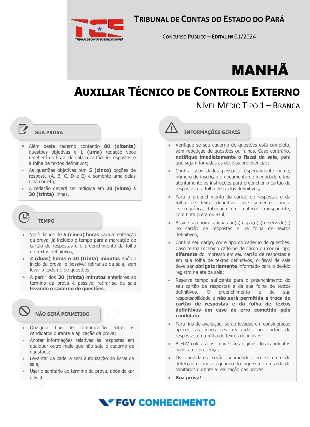 pcimarkpci MjgwNDowMjE0Ojg1Y2Q6YTQ0MDowMDAxOjAwMDA6NDQyMjo5NDZj:V2VkLCAwOSBPY3QgMjAyNCAxOTo1Njo0MCAtMDMwMA== www.pciconcursos.com.br TRIBUNAL DE CONTAS DO ESTADO DO PARÁ CONCURSO PÚBLICO – EDITAL Nº 01/2024 MANHÃ AUXILIAR TÉCNICO DE CONTROLE EXTERNO NÍVEL MÉDIO TIPO 1 – BRANCA • Além deste caderno contendo 80 (oitenta) questões objetivas e 1 (uma) redação você receberá do fiscal de sala o cartão de respostas e a folha de textos definitivos; • As questões objetivas têm 5 (cinco) opções de resposta (A, B, C, D e E) e somente uma delas está correta; • A redação deverá ser redigida em 20 (vinte) a 30 (trinta) linhas. • Você dispõe de 5 (cinco) horas para a realização da prova, já incluído o tempo para a marcação do cartão de respostas e o preenchimento da folha de textos definitivos; • 2 (duas) horas e 30 (trinta) minutos após o início da prova, é possível retirar-se da sala, sem levar o caderno de questões; • A partir dos 30 (trinta) minutos anteriores ao término da prova é possível retirar-se da sala levando o caderno de questões. • Qualquer tipo de comunicação entre os candidatos durante a aplicação da prova; • Anotar informações relativas às respostas em qualquer outro meio que não seja o caderno de questões; • Levantar da cadeira sem autorização do fiscal de sala; • Usar o sanitário ao término da prova, após deixar a sala. • Verifique se seu caderno de questões está completo, sem repetição de questões ou falhas. Caso contrário, notifique imediatamente o fiscal da sala, para que sejam tomadas as devidas providências; • Confira seus dados pessoais, especialmente nome, número de inscrição e documento de identidade e leia atentamente as instruções para preencher o cartão de respostas e a folha de textos definitivos; • Para o preenchimento do cartão de respostas e da folha de texto definitivo, use somente caneta esferográfica, fabricada em material transparente, com tinta preta ou azul; • Assine seu nome apenas no(s) espaço(s) reservado(s) no cartão de respostas e na folha de textos definitivos; • Confira seu cargo, cor e tipo do caderno de questões. Caso tenha recebido caderno de cargo ou cor ou tipo diferente do impresso em seu cartão de respostas e em sua folha de textos definitivos, o fiscal de sala deve ser obrigatoriamente informado para o devido registro na ata da sala; • Reserve tempo suficiente para o preenchimento do seu cartão de respostas e da sua folha de textos definitivos. O preenchimento é de sua responsabilidade e não será permitida a troca do cartão de respostas e da folha de textos definitivos em caso de erro cometido pelo candidato; • Para fins de avaliação, serão levadas em consideração apenas as marcações realizadas no cartão de respostas e na folha de textos definitivos; • A FGV coletará as impressões digitais dos candidatos na lista de presença; • Os candidatos serão submetidos ao sistema de detecção de metais quando do ingresso e da saída de sanitários durante a realização das provas. • Boa prova! SUA PROVA TEMPO NÃO SERÁ PERMITIDO INFORMAÇÕES GERAIS pcimarkpci MjgwNDowMjE0Ojg1Y2Q6YTQ0MDowMDAxOjAwMDA6NDQyMjo5NDZj:V2VkLCAwOSBPY3QgMjAyNCAxOTo1Njo0MCAtMDMwMA== www.pciconcursos.com.br TRIBUNAL DE CONTAS DO ESTADO DO PARÁ – TCE-PA FGV CONHECIMENTO AUXILIAR DE CONTROLE EXTERNO – MANHÃ TIPO 1 BRANCA – PÁGINA 2 Módulo I - Conhecimentos Gerais Língua Portuguesa 1 Os segmentos listados a seguir são descritivos e têm por objeto uma pequena casa. Assinale o segmento que apresenta caráter subjetivo na descrição, ou seja, aquele em que o observador participa com opiniões. (A) A casa tinha na frente um jardim, com margaridas numerosas, que cercavam alguns vasos de cerâmica rústica. (B) A casa mostrava janelas azuis e uma porta larga, que dava acesso a uma pequena sala com muitos objetos decorativos na parede. (C) O corredor lateral da casa era simpático e tinha algumas árvores frutíferas, que projetavam uma agradável sombra sobre o terreno. (D) O terreno traseiro da casa era dividido em degraus, cada um deles com um tipo predominante de frutas. (E) A casa tinha uma pequena varanda na parte de trás, com cadeiras e um tapete de palha em que alguns gatos dormiam. 2 A abreviação é um processo de formação de palavras em que o vocábulo criado é proveniente de uma redução da extensão gráfica do vocábulo original, mantendo-se o significado. Nas frases listadas a seguir, o vocábulo sublinhado foi abreviado na continuidade da frase. Assinale a frase em que a abreviação não corresponde ao vocábulo original. (A) Os carros, após a corrida, traziam os pneumáticos esvaziados, o que fez com que os mecânicos trocassem esses pneus. (B) Os jogadores do time vencedor organizaram uma batucada para a comemoração da vitória e o batuque durou até a madrugada. (C) As fotografias do passeio escolar ficaram expostas nas salas e muitos alunos pediram cópias das fotos. (D) Os funcionários da empresa tiveram que fazer um esforço extraordinário para limparem o espaço, e esse esforço extra fez com que pudessem voltar ao trabalho mais cedo. (E) O cinema sempre foi um tipo de lazer popular, mas o cine também pode ser uma manifestação de cultura. 3 As frases listadas a seguir pertencem ao livro A Cidade e as Serras, de Eça de Queiroz. Assinale aquela em que a forma “baixo” está mal-empregada. (A) “Na sala nobre da sua casa (à Pampulha) pendurou sobre os damascos o retrato do “seu Salvador”, enfeitado de palmitos como um retábulo e, por baixo, a bengala que as magnânimas mãos reais tinham erguido do lixo”. (B) “... e de fundas milhas de ruas, cortadas, por baixo e por cima, de fios de telégrafos, de fios de telefones, de canos de gases...”. (C) “Pobre Diana!... dos ombros para baixo nem sei se tem a pele cor de neve ou cor de limão”. (D) “Então, ante aqueles seres de superior civilização