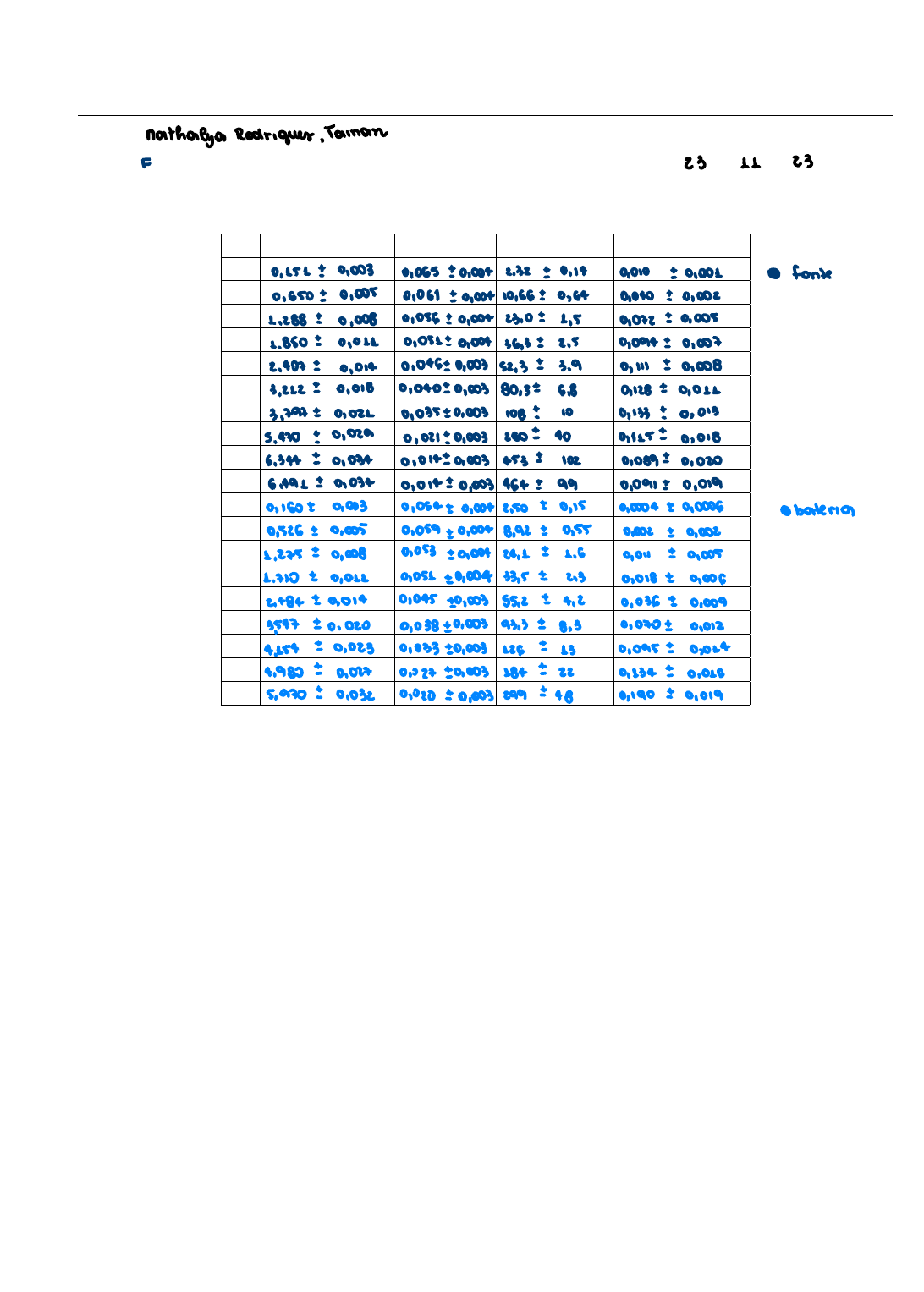 Força Eletromotriz Alunos: Turma: Data: ( / / ) Cotela de Dados: N VC ±∆VC (V) i±∆i (A) R±∆R (Ω) P ±∆P (mW) 01 02 03 04 05 06 07 08 09 10 11 12 13 14 15 16 17 18 19 Tabela 5.1 ||| Tabela de dados Atividades 1. (a) Com os valores medidos de tensão (V) e corrente (i) para cada fonte de tensão, construa um gráfico de tensão em função da corrente, encontre a equação correspondente ao comportamento de V em função de i através da regressão linear e encontre os valores dos coeficientes angulares e lineares para cada fonte. (b) Através dos coeficientes lineares, encontre a fem (ε) para cada fonte de tensão. (c) Através dos coeficientes angulares, encontre o valor da resistência interna r das fontes (Atenção: o valor de RP deve ser medido com o multímetro na função ohmímetro). (d) Escreva a equação do gerador para cada fonte (Vfonte = ε− ri). 2. Com os valores calculados de potência dissipada (P) e resistência (R) para cada fonte de tensão, construa um gráfico de P em função de R. 3. Nos gráficos do item anterior, encontre o valor de R (R = Rp + r) correspondente ao valor de máxima transferência de potência. Através do valor de R, encontre a resistência interna de cada fonte. 4. Através dos seus resultados, verifique que a bateria apresenta resistência interna superior à fonte Extech, ou seja, a bateria é uma fonte de tensão menos eficiente que a fonte Extech. Como você justifica esse fato? Monthalya Rodrigues , Tainan F 232823 0. 151 10.003 0,065 10,004 2,32 10. 14 0,018 I 0.001 ⑧ forte 0 , 650 10.005 0,061 = 0,004 10,66 0. 64 0,040 !0, 002 1,238 = 0 ,008 0 ,056 +0,000 23.0 : 1 ,5 0,072 = 0, 005 1. 850 = 0 ,011 0.05110,00436, 3. 2,5 0,ar = 0, 007 2,407= o ar 0 ,09610,003 52,3 I 3,9 O, 111 I 0,008 3 , 2121 0,018 0 ,04010,003 80. 3 = 6.8 0.128 + 0,011 3.797 = 0, 021 0,035 10,003 108 ! 10 0, 133 ! 0, 013 5 .170+ 0,029 0 , 02150,003 260! to 011510, 018 6,344 = 0, 034 0 ,01410, 003 153 I 182 0,089 0, 020 6 ,491101034 0,0141 0 ,003 964 I 99 0,0911 0 , 09 0, 160 = 0,003 0 ,054 + 0,0042,50 = 0.15 0.0004 = 0,0006 ·bateria 0.526 10,005 0,059 + 0,00+ 8.92 10.55 0,002 10.002 1 ,275 =0, 008 0,053 10,004 24.1 = 1.6 0,011 1 0,005 1..710 ! 0,012 005110,00433,5 1 213 0,018 10,006 2,48419014 0,045 10,003 55,2 1 P, 2 0 , 036 1 0,009 3547 10, 020 0,038 10,003 93.3 13, 3 0, 070 1 0,01 4154 1 0,0230, 03310,003 126 !13 0,095 10,014 & P,980 = 0,027 0.027 10, 003 184122 0. 134 = 0,016 5,970 ! 0 ,032 0.020 0 ,003 299 = 48 0.190 = 0, 019