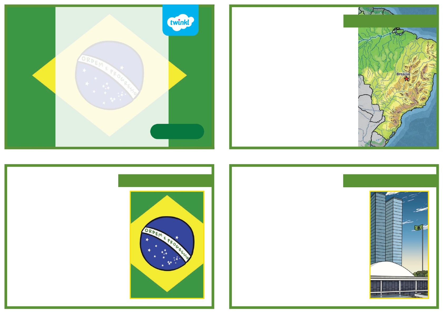Brasil Cartões de fatos Cartões de fatos Cartões de fatos • Os únicos países da América do Sul que o Brasil não faz fronteira círculo com 27 estrelas e as palavras 'Ordem e Progresso' escritas em uma faixa branca. As palavras significam 'ordem e progresso' quando traduzidas para o inglês. • A maior cidade por área e número de população é São Paulo. É o lar de mais de 12 milhões de pessoas. • Compartilha fronteiras terrestres com 10 • Dentro do losango há um azul • O Brasil é o maior país do continente da América do Sul e o quinto maior país do mundo. planalto do Brasil e foi designado Patrimônio Mundial da UNESCO em 1987. estados brasileiros e seu distrito federal. • A bandeira do Brasil é verde com um losango amarelo no centro. com o Chile e o Equador. • Latitude: 15° 49' S, 47° 55' W • Brasília está localizada no centro outros países da América do Sul e tem uma longa fronteira costeira com o Oceano Atlântico. • O Rio de Janeiro é uma grande cidade litorânea do Brasil. É famosa por suas atrações turísticas, praias e seu carnaval anual. • As 27 estrelas representam as 26 • A capital do Brasil é Brasília. Cartões de fatos twinkl.com twinkl.com twinkl.com África do Sul A bandeira do Brasil Onde é o Brasil? Principais cidades do Brasil Machine Translated by Google twinkl.com twinkl.com twinkl.com twinkl.com Cartões de fatos Cartões de fatosCartões de fatos Cartões de fatos • O Cristo Redentor é uma famosa estátua de Jesus Cristo no topo do Morro do Corcovado na cidade do Rio de Janeiro. • O Brasil produz minerais, como minério de ferro, estanho, ouro, diamantes e outras gemas. • Brigadeiros são uma trufa de chocolate popular brasileira. • O Brasil é uma grande economia global devido às suas terras férteis, recursos naturais e grandes cidades. • O português é a língua oficial e a mais falada no Brasil. • A moeda no Brasil é o • A bebida nacional do Brasil é a Caipirinha, que é um coquetel que combina suco de limão, açúcar e cachaça. • O Brasil é o maior produtor de café e laranja do mundo. • As Cataratas do Iguaza são um conjunto de 275 cachoeiras separadas compartilhadas por Brasil e Argentina. Juntos, eles são o maior sistema de cachoeiras do mundo. Real brasileiro. • O prato nacional do Brasil é a feijoada. Consiste em uma mistura de diferentes carnes cozidas em um ensopado de feijão preto e muitas vezes é servido com arroz e legumes. • O Brasil é o país com mais pessoas de língua portuguesa no mundo, com mais de 200 milhões de pessoas falando a língua. • A praia de Copacabana tem 4km de extensão e é uma das praias mais famosas do mundo. • Existem cerca de 180 línguas indígenas em todo o país. A economia brasileira Idiomas no Brasil Pontos de referência no Brasil Comida e bebida no Brasil Machine Translated by Google twinkl.com twinkl.com twinkl.com twinkl.com Cartões de fatos Cartões de fatos Cartões de fatos Cartões de fatos peixes-boi e mais de 2000 espécies de peixes. • A maior parte do Brasil tem um clima tropical ou • É um dos lugares com maior diversidade biológica da Terra, com milhões de espécies diferentes. • O tamanho da floresta amazônica está diminuindo rapidamente devido às mudanças climáticas e ao desmatamento. • A ave nacional do Brasil é o tordo-de- barriga-ruiva. • A precipitação é particularmente intensa na bacia amazônica, área drenada pelo rio Amazonas e seus afluentes. • O rio Amazonas é lar de golfinhos, • A floresta amazônica é a maior floresta tropical do mundo. No entanto, é de aproximadamente 6.400 km (4.000 milhas) de comprimento. • Sua área total é estimada em cerca de 6 milhões de quilômetros quadrados (2,3 milhões de milhas quadradas), cobrindo cerca de 40% do Brasil. • Acredita-se que seja o segundo maior rio do mundo, depois do Nilo, mas é o maior rio do mundo em termos de volume de água que flui ao longo dele. • Há algum debate sobre onde sua • Sua posição no equador significa que o país permanece quente durante todo o ano. ponto de partida deve ser medido. • Há uma área mais seca ao nordeste do país. • A floresta amazônica abriga a maior variedade de plantas da Terra e muitos animais diferentes. • Muitos animais vivem nas árvores, incluindo insetos, cobras, pássaros, sapos e macacos. • O rio Amazonas atravessa o Brasil, assim como Peru, Bolívia, Colômbia, Equador e partes da Venezuela. clima subtropical, o que significa que o clima é quente e úmido. A floresta amazônica O rio Amazonas Clima do Brasil Vida selvagem no Brasil Machine Translated by Google twinkl.com twinkl.com twinkl.com twinkl.com Cartões de fatos Cartões de fatos Cartões de fatosCartões de fatos • O samba é tocado no carnaval. Este estilo de música originou-se no Brasil. realizada no Rio de Janeiro e é visitada • Existem aproximadamente 860.000 povos indígenas no Brasil, em mais de 300 etnias diferentes. • Muitos povos indígenas no Brasil vivem na região amazônica. por milhões de pessoas. • O Rio de Janeiro foi a cidade-sede dos Jogos Olímpicos de Verão de 2016. • É um festival com música, dança, carros alegóricos decorados e fantasias coloridas. • O Carnaval do Rio é um evento anual • O carnaval acontece durante a Quaresma e pode durar quatro dias. • A população do Brasil é de aproximadamente 215 milhões (2022). Possui a sétima maior população do mundo. • Alguns falam suas próprias línguas. • Alguns povos indígenas têm estilos de vida nômades, viajando entre as áreas. • O Brasil venceu a Copa do Mundo da FIFA cinco vezes, o que é mais do que qualquer outro país do mundo. • O Brasil tem grandes desigualdades sociais. • Outros esportes populares incluem vôlei, basquete, artes marciais mistas e esportes motorizados. • A religião principal é o catolicismo. • Há muitas pessoas famosas do Brasil. Entre eles estão o jogador d