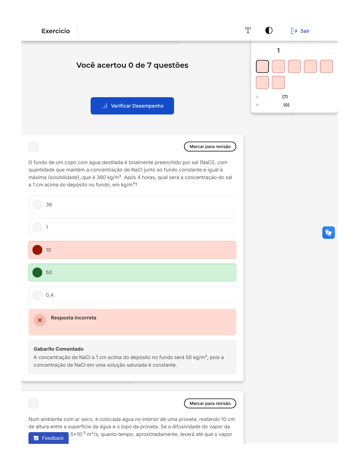 Verifique o seu desempenho e continue treinando! Você pode refazer o exercício quantas vezes quiser. A B C D E 1 O fundo de um copo com água destilada é totalmente preenchido por sal �NaCl�, com quantidade que mantém a concentração de NaCl junto ao fundo constante e igual à máxima (solubilidade), que é 360 kg/m³. Após 4 horas, qual será a concentração do sal a 1 cm acima do depósito no fundo, em kg/m³? 36 1 10 50 0,4 Opa! A alternativa correta é a letra D. Confira o gabarito comentado! A concentração de NaCl a 1 cm acima do depósito no fundo será 50 kg/m³, pois a concentração de NaCl em uma solução saturada é constante. 2 Num ambiente com ar seco, é colocada água no interior de uma proveta, restando 10 cm de altura entre a superfície da água e o topo da proveta. Se a difusividade do vapor da água no ar é de 2,5�10 m²/s, quanto tempo, aproximadamente, levará até que o vapor�5 Questão de 7 Incorretas Em branco 1 2 3 4 5 6 7 Transferência De Massa Feedback Firefox https://estacio.saladeavaliacoes.com.br/exercicio/673bcfcc93e529c49d... 1 of 6 18/11/2024, 20:38 A B C D E A B C D da água alcance o topo da proveta? Considere que uma leve corrente de ar mantém o ar seco no topo da proveta e que, junto à superfície, a concentração é constante e correspondente à pressão de vapor. 2 minutos 25 segundos 3 minutos 5 segundos 10 segundos Opa! A alternativa correta é a letra B. Confira o gabarito comentado! A alternativa correta é a que indica que o vapor da água levará aproximadamente 25 segundos para alcançar o topo da proveta. Isso se deve à difusividade do vapor da água no ar, que é de 2,5�10 m²/s, e à distância de 10 cm entre a superfície da água e o topo da proveta. Além disso, a questão também considera que uma leve corrente de ar mantém o ar seco no topo da proveta e que a concentração de vapor da água é constante e correspondente à pressão de vapor junto à superfície da água. �5 3 800 g de sulfato de alumínio, Al �SO ) , são despejados em 20.000 L de água. Dado que a massa molar de sulfato de alumínio é 342,15 kg/kmol, qual é a fração molar de Al �SO ) ? 2 4 3 2 4 3 1,0.10�6 2,1.10�6 4,0.10�5 5,3.10�2 Feedback Firefox https://estacio.saladeavaliacoes.com.br/exercicio/673bcfcc93e529c49d... 2 of 6 18/11/2024, 20:38 E A B C D E 0,021 Opa! A alternativa correta é a letra B. Confira o gabarito comentado! A fração molar é uma maneira de expressar a concentração de um soluto em uma solução. Ela é calculada dividindo a quantidade de moles do soluto pela quantidade total de moles na solução. No caso desta questão, a quantidade de moles de sulfato de alumínio é obtida dividindo a massa dada �800 g� pela massa molar �342,15 kg/ kmol). A quantidade total de moles na solução é a soma dos moles de sulfato de alumínio e os moles de água. Como a água tem uma massa molar de aproximadamente 18 g/mol e o volume de água é dado como 20.000 L, podemos calcular a quantidade de moles de água. Ao realizar esses cálculos, encontramos que a fração molar do sulfato de alumínio é aproximadamente 2,1.10 .�6 4 Em qual das situações abaixo apenas a difusão é significativa? Dispersão de CO emitido por um veículo em local com vento.2 Diluição de achocolatado em leite com ajuda de colher. Transporte de gás oriundo de vazamento em uma residência fechada. Pluma de contaminação de óleo no oceano. Mistura de substância em processo industrial com agitador. Opa! A alternativa correta é a letra C. Confira o gabarito comentado! A difusão é o movimento de partículas de uma região de maior concentração para uma região de menor concentração. No caso do transporte de gás oriundo de vazamento em uma residência fechada, o gás se difunde para as regiões de menor concentração, que são as paredes da residência. Nas outras situações, há outros mecanismos de transporte de massa, como a convecção e a mistura. Feedback Firefox https://estacio.saladeavaliacoes.com.br/exercicio/673bcfcc93e529c49d... 3 of 6 18/11/2024, 20:38 A B C D E A B C 5 Qual das misturas abaixo terá a maior difusividade? Álcool em água Água em madeira Etanol em gasolina Açúcar em água Oxigênio em gás carbônico Opa! A alternativa correta é a letra E. Confira o gabarito comentado! A difusividade é uma propriedade que indica a capacidade de uma substância se espalhar ou se misturar em outra devido ao movimento aleatório de suas moléculas. No caso das opções apresentadas, a mistura de oxigênio em gás carbônico apresenta a maior difusividade. Isso ocorre porque os gases têm uma maior tendência à difusão em comparação com líquidos e sólidos, devido ao maior espaço entre suas moléculas. Portanto, o oxigênio se difunde mais rapidamente no gás carbônico do que as outras substâncias nas respectivas misturas. 6 A difusividade do oxigênio no ar a 25°C é de 2,1�10 m²/s e a sua fração mássica típica é de 23,1%. Assumindo regime permanente, qual seria o fluxo de massa difusivo, em kg/ s.m², entre um ponto com concentração típica e outro sem oxigênio, a 0,50 m de distância? Dado: Massa específica da mistura de ar = 1,2 kg/m³. �5 par 5,0x10�6 2,4�10�5 6,0x10�4 Feedback Firefox https://estacio.saladeavaliacoes.com.br/exercicio/673bcfcc93e529c49d... 4 of 6 18/11/2024, 20:38 D E A B C D E 1,2�10�5 4,5�10�5 Opa! A alternativa correta é a letra D. Confira o gabarito comentado! A alternativa correta é a que indica o valor de 1,2�10 . Para chegar a essa resposta, é necessário aplicar a lei de Fick para a difusão, que relaciona o fluxo de massa com a difusividade, a concentração e a distância. Neste caso, a difusividade do oxigênio no ar é dada, assim como a fração mássica e a distância entre os pontos. �5 7 Para decantação de partículas, 800 g de sulfato de alumínio, Al �SO ) são despejados em uma piscina de 20.000 L. Qual é a mass