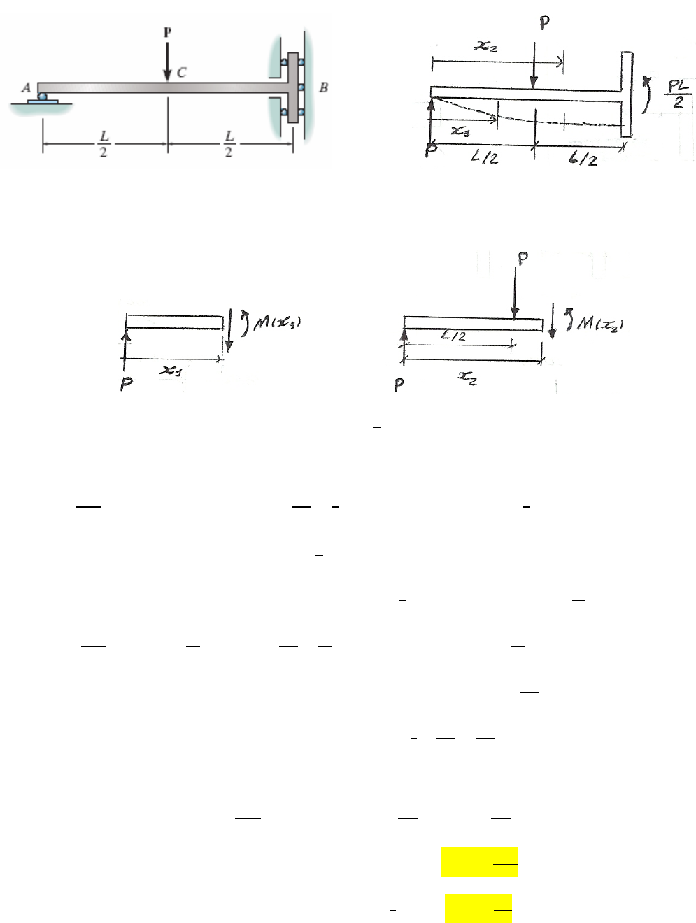 Deflexão em Vigas e Eixos Resolução: Steven Róger Duarte 738 12.11 A barra é suportada por um rolete restritivo em B, que permite deslocamento vertical, mas resiste a carga axial e a momento. Se a barra for submetida à carga mostrada, determine a inclinação em A e a deflexão em C. EI é constante. Figura 12.11 ∑ ( ) ( ) ( ) ∑ ( ) . / ( ) ( ) Condições de contorno: Condições de continuidade: Substituindo as condições de contorno e continuidade nas equações, obtemos: Inclinação em A: ocorre em x1 = 0 Deflexão em C: ocorre em Deflexão em Vigas e Eixos Resolução: Steven Róger Duarte 739 *12.12. Determine a deflexão em B na barra do Problema 12.11. Figura 12.12 ∑ ( ) ( ) ( ) ∑ ( ) . / ( ) ( ) Condições de contorno: Condições de continuidade: Substituindo as condições de contorno e continuidade nas equações, obtemos: Deflexão em B: ocorre em x2 = 0 Deflexão em Vigas e Eixos Resolução: Steven Róger Duarte 740 12.13. A tábua de cerca está entrelaçada entre os três mourões lisos fixos. Se os mourões estiverem instalados ao longo da mesma linha reta, determine a tensão de flexão máxima na tábua. A largura e a espessura da tábua são 150 mm e 12 mm, respectivamente. E = 12 GPa. Considere que o deslocamento de cada extremidade da tábua em relação a seu centro seja 75 mm. Figura 12.13 ∑ ( ) ( ) ( ) ∑ ( ) ( ) ( ) Condições de contorno: Condições de continuidade: Substituindo as condições de contorno e continuidade nas equações, obtemos: ( ) ; ; logo: P = 67,5 N ( ) = 40,5 N.m ; sendo assim: = 11,25 MPa Deflexão em Vigas e Eixos Resolução: Steven Róger Duarte 741 12.14. Determine a equação da linha elástica para a viga utilizando a coordenada x. Especifique a inclinação em A e a deflexão máxima. EI é constante. Figura 12.14 ∑ ( ) ( ) ( ) Condições de contorno: Substituindo as condições de contorno nas equações, obtemos: Equação da linha elástica: ( ) Inclinação em A:ocorre em x = 0 Para que a deflexão seja máxima, , logo: ( ) = 0 x = 0,42265L Substituindo x na equação da linha elástica, obtemos: 12.15. Determine a deflexão no centro da viga e a inclinação em B. EI é constante. Figura 12.15