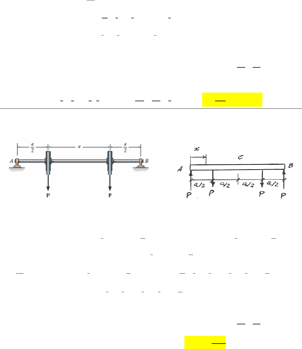 Deflexão em Vigas e Eixos Resolução: Steven Róger Duarte 786 ( ) ( ) ( ) ( ) Condições de contorno: Substituindo as condições de contorno na equação da linha elástica, obtemos: A deflexão é máxima em x = L/2, Logo: . / . / . / . / . / ( ) 12.71. Determine a deflexão máxima do eixo. EI é constante. Os mancais exercem somente reações verticais sobre o eixo. Figura 12.71 ( ) ( ) ( ) ( ) Condições de contorno: Substituindo as condições de contorno na equação da linha elástica, obtemos: Deflexão máxima: ocorre em x = a Deflexão em Vigas e Eixos Resolução: Steven Róger Duarte 787 *12.72. A viga está sujeita à carga P como mostra a figura. Determine o valor da força F que deve ser aplicada na extreimidade da extensão C de modo que a deflexão em C seja nula. EI é constante. Figura 12.72 ∑ ∑ ( ) ( ) . / ( ) ( ) . / ( ) . / ( ) . / Condições de contorno: Substituindo as condições de contorno na equação da linha elástica, obtemos: Como a deflexão em C é nula, temos: ( ) ( ) ( ) . / ( ) ( ) Resolvendo a equação, obtemos: 12.73. A que distância a os mancais de apoio A e B devem ser colocados de modo que a deflexão no centro do eixo seja igual à deflexão em suas extremidades? Os mancais exercem somente reações verticais sobre o eixo. EI é constante. Figura 12.73 ( ) ( ) ( ) Deflexão em Vigas e Eixos Resolução: Steven Róger Duarte 788 ( ) Condições de contorno: Substituindo as condições de contorno na equação da linha elástica, obtemos: ( ) ( ) Igualando a deflexão no centro do eixo com a delexão em suas extremidades: , tem-se que: , resolvendo a equação do terceiro grau, obtemos: a = 0,152L 12.74. Determine a inclinação do eixo de aço A-36 de 50 mm de diâmetro nos mancais em A e B. Os mancais exercem somente reações verticais sobre o eixo. Figura 12.74 ∑ ( ) ( ) ( ) ( ) Condições de contorno: . /( ) = 0,0105 rad . /( ) ( ) = 0,00968 rad Deflexão em Vigas e Eixos Resolução: Steven Róger Duarte 789 12.75. Determine a deflexão máxima do eixo de aço A-36 de 50 mm de diâmetro. As extremidades A e B do eixo estão apoiadas em mancais que exercem somente reações verticais sobre o eixo. Figura 12.75 ∑ ( ) ( ) ( ) ( ) Condições de contorno: Substituindo as condições de contorno na equação da linha elástica, obtemos: Para que v sejá máximo, , logo: ( ) , x