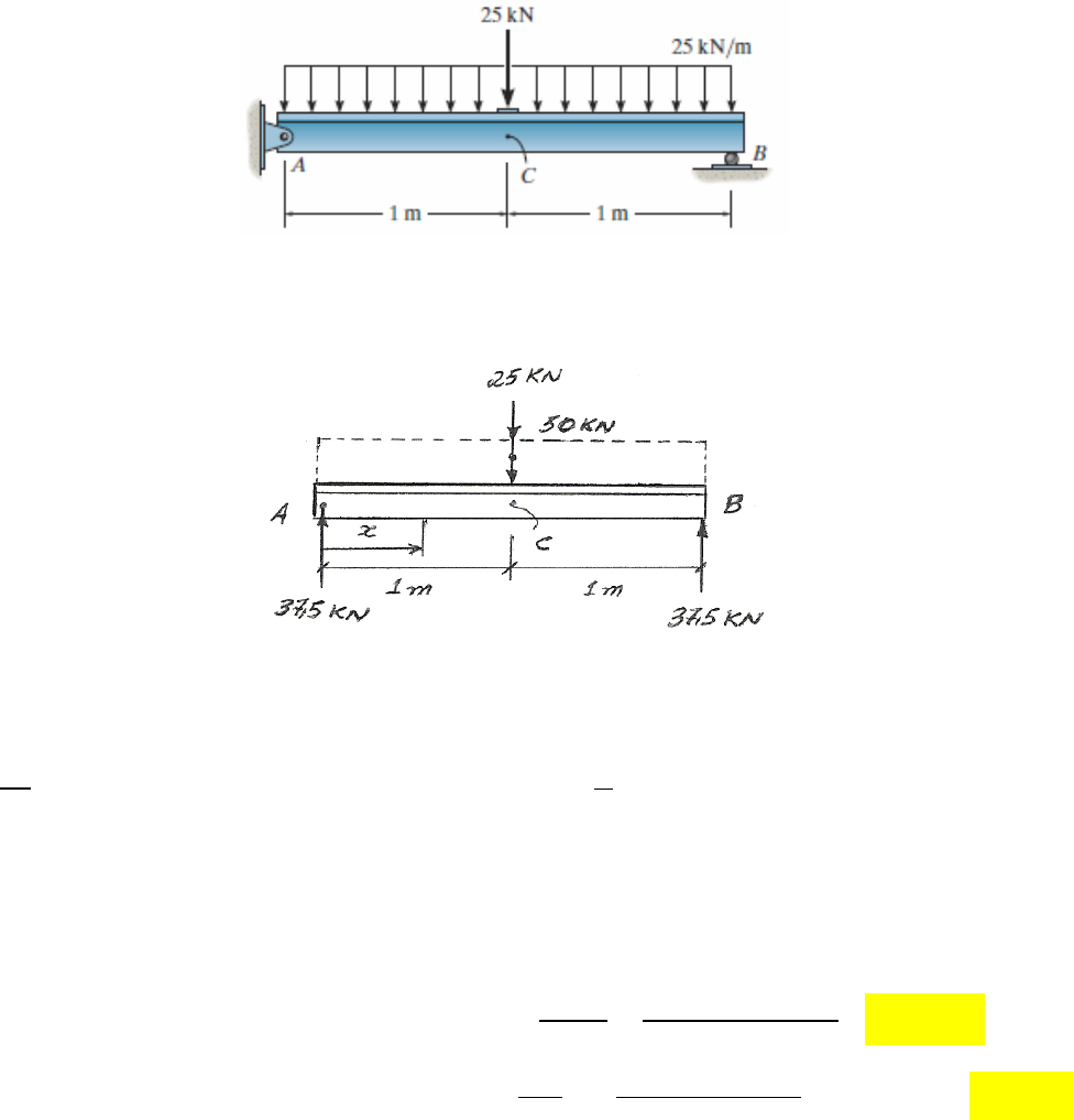 Deflexão em Vigas e Eixos Resolução: Steven Róger Duarte 798 *12.88. Determine a inclinação em B e o deslocamento em C. O elemento é um T estrutural de aço A-36 para o qual I = 30(106) mm4. Figura 12.88 ( ) ( ) Condições de contorno: Substituindo as condições de contorno na equação da linha elástica, obtemos: Inclinação em B: ocorre em x = 2 m ( )( ) = 0,00243 rad Deflexão em C: ocorre em x = 1 m ( )( ) = - 0,00156 m = 1,56 mm Deflexão em Vigas e Eixos Resolução: Steven Róger Duarte 799 12.4 - PROBLEMAS 12.89. A viga em balanço com perfil W200 x 71 feita de aço A-36 é submetida à carga mostrada na figura. Determine o deslocamento em sua extremidade A. W200 x 71 (Ix = 76,6 x 10 6 mm 4 ) Figura 12.89 W200 x 71 (Ix = 76,6 x 10 6 mm 4 ) 0 ( ) ( ) 1 0 ( ) ( ) 1 ( )( ) = 0,01613 m = 16,13 mm 12.90. A viga em balanço com perfil W200 x 71 feita de aço A-36 é submetida à carga mostrada na figura. Determine o deslocamento em C e a inclinação em A. W200 x 71 (Ix = 76,6 x 10 6 mm 4 ) Figura 12.90 ( ) ( ) ( )( ) = 0,00508 m = 5,08 mm ; ( )( ) = 0,00498 rad Deflexão em Vigas e Eixos Resolução: Steven Róger Duarte 800 12.91. A viga simplesmente apoiada com perfil W360 x 64 feita de aço A-36 é submetida à carga mostrada na figura. Determine a deflexão em seu centro C. Figura 12.91 W360 x 64 (Ix = 179 x 10 6 mm 4 ) ( ) ( ) ( )( ) = 0,01084 m = 10,84 mm *12.92. A viga simplesmente apoiada com perfil W360 x 64 feita de aço A-36 é submetida à carga mostrada na figura. Determine a inclinação em A e B. Figura 12.92 W360 x 64 (Ix = 179 x 10 6 mm 4 ) ( )( ) = 0,0049756 rad = 0,285° ( )( ) = 0,007594 rad = 0,435° Deflexão em Vigas e Eixos Resolução: Steven Róger Duarte 801 12.93. Determine o momento M0 em termos da carga P e da dimensão a de modo que a deflexão no centro da viga seja nula. EI é constante. Figura 12.93 Deflexão no centro da viga é nula, logo: ( ) ( ) . / (0 1 0 1 * . / (0 1 0 1 * 12.94. A viga suporta à carga mostrada na figura. Em razão do forro de gesso, as restrições determinam que a deflexão máxima não pode ultrapassar 1/360 do comprimento do vão. Selecione no Apêndice B a viga de abas largas de aço A-36 de menor peso que satisfará esse requisito e suportará a carga com segurança. A tensão de flexão admissível é e a tensão de cisalhamento admissível é . Considere que A é um rolete e B, um pino. Figura 12.94 ∑ ; ∑ ;