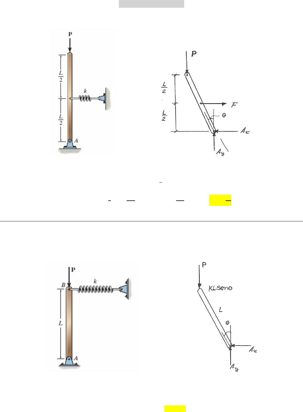 Flambagem de Colunas 842 Resolução: Steven Róger Duarte 13.1 – PROBLEMAS 13.1. Determine a carga de flambagem crítica para a coluna. Podemos considerar que o material é rígido. Figura 13.1 ∑ ; ( ) . / . / ; 13.2. A coluna é composta por um elemento estrutural rígido preso por um pino na base e acoplado a uma mola no topo. Se a mola não estiver esticada quando a coluna estiver em posição vertical, determine a carga crítica que pode ser aplicada à coluna. Figura 13.2 ∑ ; ( )( ) Flambagem de Colunas 843 Resolução: Steven Róger Duarte 13.3. Uma coluna de aço A-36 tem comprimento de 4 m e está presa por pinos em ambas as extremidades. Se a área da seção transversal tiver as dimensões mostradas na figura, determine a carga crítica. Figura 13.3 Presa por pinos em ambas as extremidades: k = 1 = 184.166,667 mm 4 ( ) ( )( ) ( ) = 22.720,65 N = 20,66 MPa