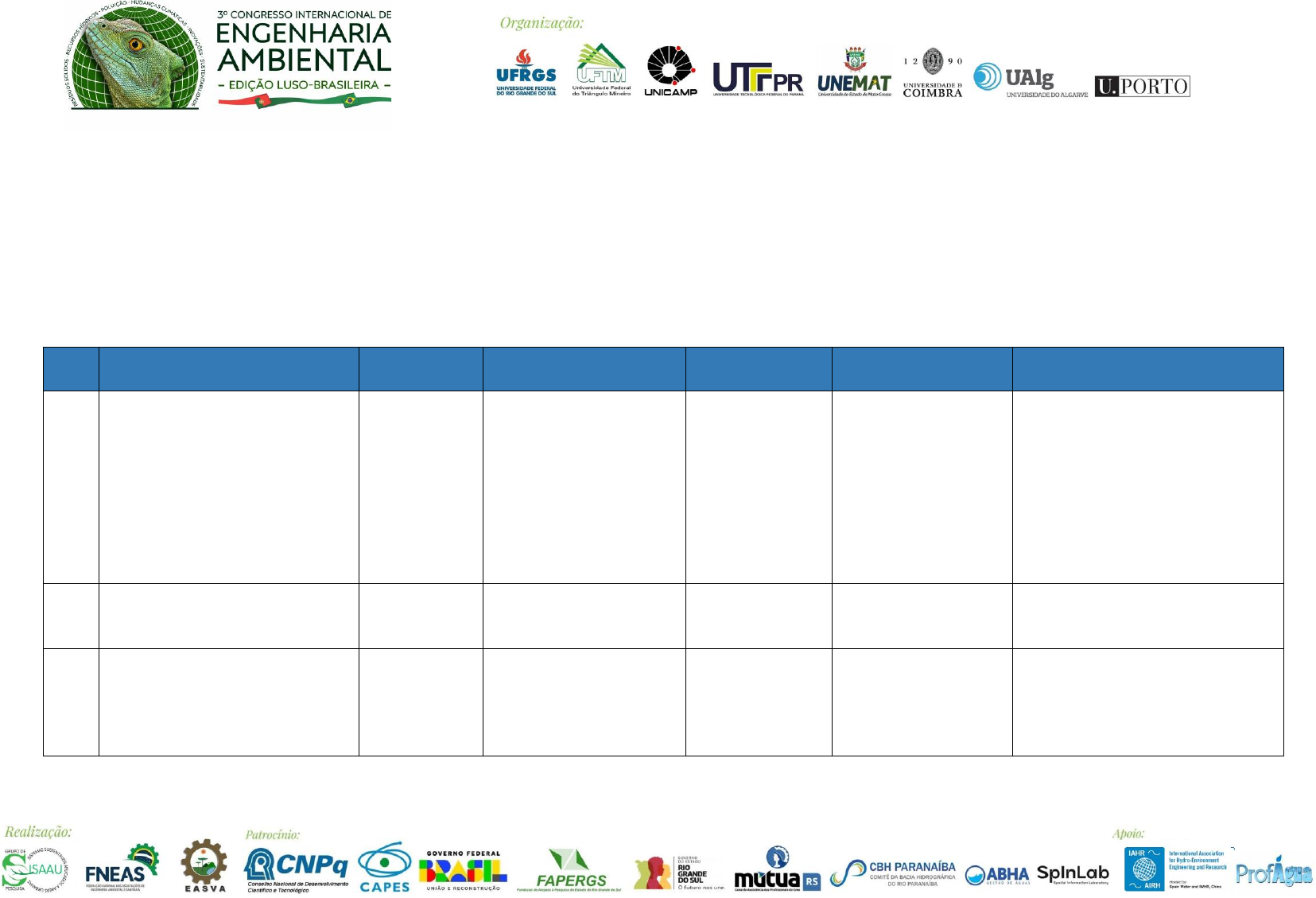 Sessão 01 - ORAL - PRESENCIAL - Assoreamento de Reservatórios e Lagos / Estudos Morfológicos Fluviais e Costeiros / Processos Erosivos e Controle de Voçorocas / Desastres Naturais Data: 27/11 (quarta-feira) Horário: 08:30 – 12:00 Auditório: 04 ID Título PRESENCIAL Área temática Autor principal Instituição do Autor principal Co-Autores e Instituições 24380 APLICAÇÕES DE REDES NEURAIS ARTIFICIAIS NO ESTUDO DO ASSOREAMENTO DE RESERVATÓRIOS: UMA REVISÃO ABRANGENTE Apresentação PRESENCIAL 1) Assoreamento de Reservatórios e Lagos ROSE MARY TEIXEIRA DE LEMOS USP DENISE PARIZOTTO (Universidade de São Paulo (USP)), CAMILA BERMOND BORGES RUEZZENE (Universidade de São Paulo (USP)), RENATO BILLIA DE MIRANDA (Universidade de São Paulo (USP)), FREDERICO FÁBIO MAUAD (Universidade de São Paulo (USP)) 25128 SIMULAÇÃO NUMÉRICA DE CORRENTE DE TURBIDEZ, EM CONFIGURAÇÃO AXISSIMÉTRICA Apresentação PRESENCIAL 5) Estudos Morfológicos Fluviais e Costeiros Sara Maria Mata Sosa PUCRS Karina Ruschel (PUCRS) 25228 APLICAÇÃO DO MODELO DRIFTFLUXFOAM PARA A MODELAGEM DE CORRENTES DE TURBIDEZ EM CONFIGURAÇÃO NÃO-CONFINADA: VALIDAÇÕES Apresentação PRESENCIAL 5) Estudos Morfológicos Fluviais e Costeiros Guilherme Fuhrmeister Vargas Pontifícia Universidade Católica do Rio Grande do Sul Bruno Alvarez Scapin (Pontifícia Universidade Católica do Rio Grande do Sul), Sara Maria Mata Sosa (Pontifícia Universidade Católica do Rio BASEADAS NAS METODOLOGIAS RANS E LES Grande do Sul), Karina Ruschel (Pontifícia Universidade Católica do Rio Grande do Sul) 24397 UTILIZAÇÃO DE ENGENHARIA NATURAL PARA RECUPERAÇÃO DE VOÇOROCA Apresentação PRESENCIAL 12) Processos Erosivos e Controle de Voçorocas Vicente Sousa HYDRO Jonilton Pantoja Paschoa (Mineração Paragominas), Maria Alciene Pereira dos Santo (Mineração Paragominas), Igor do Vale Gonçalves (Mineração Paragominas), Rita dos Santos Sousa (VAllis), Junior Joel Dewes (VAllis) 25222 EROSÕES HÍDRICAS LINEARES NA ÁREA URBANA DE BOTUCATU/SP: INDICAÇÃO DE DEMANDA POR ATUALIZAÇÃO DE CADASTRAMENTO Apresentação PRESENCIAL 12) Processos Erosivos e Controle de Voçorocas Letícia Leão Barbosa Schmidt Universidade Estadual Paulista Júlio de Mesquita Filho (UNESP) Simone Andrea Furegatti (Universidade Estadual Paulista Júlio de Mesquita Filho (UNESP)) 25246 ESTUDO DAS ALTERAÇÕES NO DESEQUILÍBRIO SEDIMENTOLÓGICO OCORRIDAS NO CÓRREGO MUMBUCA NO MUNICÍPIO DE MONTE CARMELO, MG Apresentação PRESENCIAL 12) Processos Erosivos e Controle de Voçorocas Carlos Eugenio Pereira Universidade Federal de Uberlândia Marcio Ricardo Salla (Universidade Federal de Uberlândia (UFU)), Roseli Mendonça Dias (Universidade Federal de Uberlândia (UFU)), Maria Lyda Bolanos Rojas (Universidade Federal de Uberlândia (UFU)), Bruno de Oliveira Lázaro (Universidade Federal de Uberlândia (UFU)), José Eduardo Alamy Filho (Universidade Federal de Uberlândia (UFU)), Caroline Yuka Mori Saito (Universidade Federal de Uberlândia (UFU)), Thaís Cristina de Jesus Fábio Santos (Universidade Federal de Uberlândia (UFU)) 24414 ANÁLISE DA EFICIÊNCIA DE TÉCNICAS DE CONTROLE DE EROSÃO ASSOCIADAS A ATIVIDADES AGROPECUÁRIAS EM BURI (SP) Apresentação PRESENCIAL 12) Processos Erosivos e Controle de Voçorocas Danielle Mendes da Silva Universidade Federal de São Carlos Claúdia Marisse do Santos Rotta (Universidade Federal de São Carlos) 24413 INFLUENCIA DE COBERTURAS VEGETALES ARBÓREAS Y NO ARBÓREAS EN LA ATENUACIÓN DE CAUDALES MÁXIMOS Apresentação PRESENCIAL 2) Desastres Naturais Carlos Francisco García Olmos Universidad Distrital Francisco José de Caldas Andrés Camilo Rey Sánchez (Universidad Distrital Francisco José de Caldas), Juan Carlos Medina Avellaneda (Universidad Distrital Francisco José de Caldas) 25720 ANÁLISE TEMPORAL DE RECORRÊNCIA DE ÁREAS INUNDADAS EM PORTO ALEGRE UTILIZANDO IMAGENS LANDSAT E SENTINEL-1 Apresentação PRESENCIAL 2) Desastres Naturais Vinícius de Azevedo Silva UNICAMP Francisco Lledo dos Santos (UNEMAT), André Luis Sotero Salustiano Martim (UNICAMP), Cristiano Poleto (UFRGS), Hugo de Oliveira Fagundes (UNICAMP) 24248 ANALISE DE VAZAO MINIMA DIARIA E MENSAL EM LOCAIS COM APROVEITAMENTO HIDRELETRICO Apresentação PRESENCIAL 4) Energias Renováveis Cláudia Weber Corseuil UFSC Álvaro José Back (Empresa de Pesquisa Agropecuária e Extensão Rural de Santa Catarina (Epagri)), Bruno Gabriel Ronchi (Universidade Federal de Santa Catarina (UFSC)), Amarfelina Fernandes de Oliveira de Aguiar (Autônomo), Marcos Ricardo Giehl (Universidade Federal de Santa Catarina (UFSC)) 24717 GERAÇÃO DE BIOGÁS E METANO NA DIGESTÃO ANAERÓBIA DE ANTIBIÓTICOS EM REATORES DE BATELADA Apresentação PRESENCIAL 4) Energias Renováveis Marcos Henrique Gomes Ribeiro Universidade Federal do Rio Grande do Sul Mariana Leitune Machado (Universidade Federal do Rio Grande do Sul (UFRGS)), Vinícius Duarte Soroka (Universidade Federal do Rio Grande do Sul (UFRGS)), Maria Cristina de Almeida Silva (Universidade Federal do Rio Grande do Sul (UFRGS)), Odorico Konrad (Universidade do Vale do Taquari), Antônio Domingues Benetti (Universidade Federal do Rio Grande do Sul (UFRGS)) 24959 DESIGN CONSTRUTAL APLICADO A UM DISPOSITIVO DE CONVERSÃO DE ENERGIA DAS ONDAS DO MAR DE COLUNA DE ÁGUA OSCILANTE COM DUAS CÂMARAS Apresentação PRESENCIAL 4) Energias Renováveis Esmael Thums Universidade do Vale do Rio dos Sinos (UNISINOS) Lenon Audibert Cisco (Universidade Federal do Rio Grande do Sul (UFRGS)), Yuri Theodoro Barbosa de Lima (Colégio João XXIII), Flávia Schwarz Franceschini Zinani, (Universidade Federal do Rio Grande do Sul (UFRGS)), Luiz Alberto Oliveira Rocha (Universidade Federal do Rio Grande do Sul (UFRGS)) 25119 A UTILIZAÇÃO DE BIODIGESTORES E DA COMPOSTAGEM COMO UMA SOLUÇÃO ENERGÉTICA SUSTENTÁVEL PARA O SANEAMENTO RURAL Apresentação PRESENCIAL 4) Energias Renováveis Héckzon Antônio Monteiro de Oliveira Uni