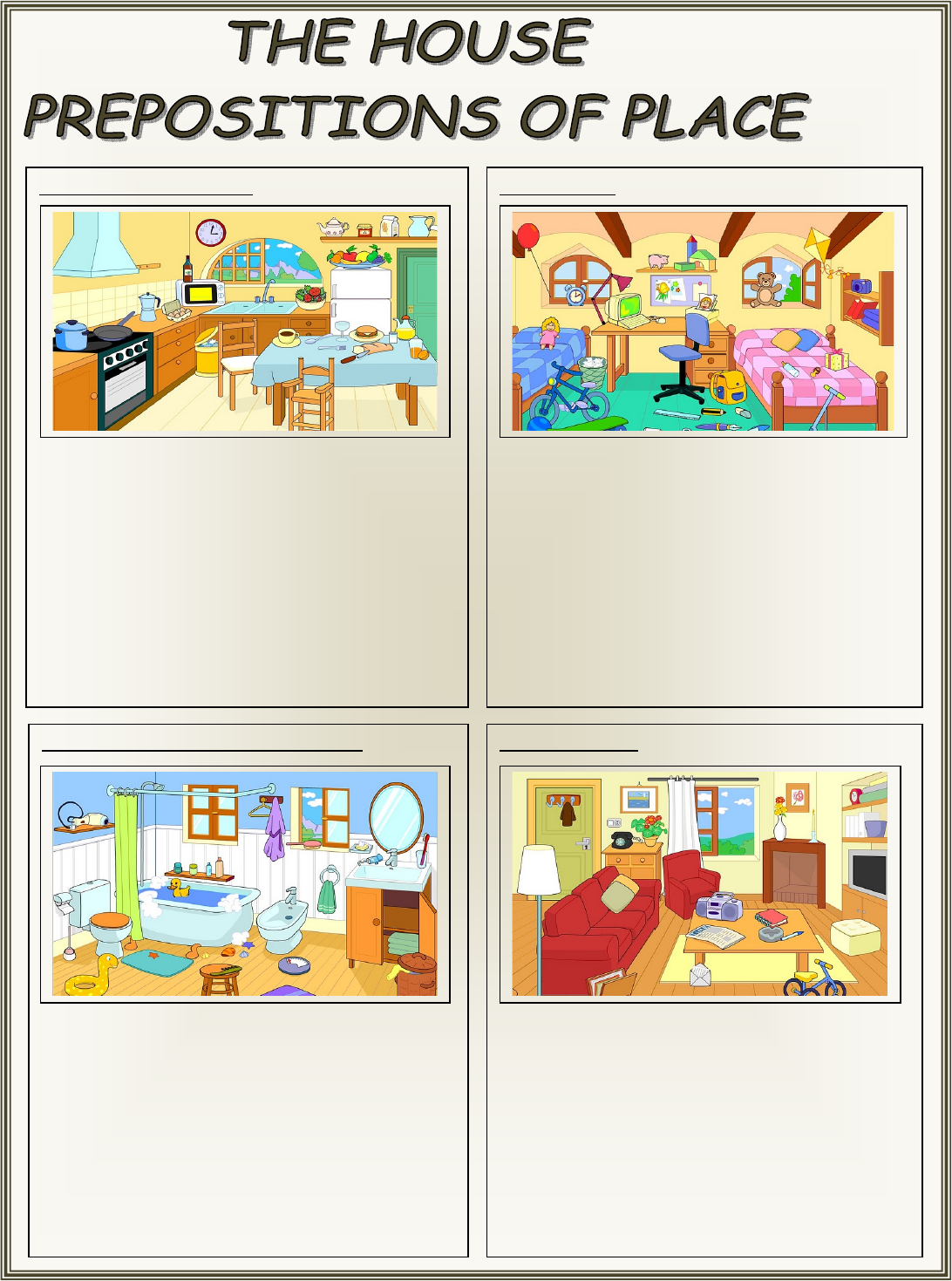 CHOOSE THE RIGHT OPTION 1-THE FRIDGE IS BETWEEN/UNDER THE DOOR AND THE CUPBOARD. 2-THE DOOR IS NEXT TO/UNDER THE SHELF. 3-THE CLOCK IS IN/ON THE WALL. 4-THE CHAIRS ARE UNDER/ NEXT TO THE TABLE 5-THE TABLE IS UNDER/OPPOSITE THE COOKER. 6-THE POT IS ON/IN THE COOKER. 7-THE BIN IS NEAR/ IN FRONT OF THE DRAWERS. 8-THE MICROWAVE IS NEXT TO /UNDER THE WINDOW 9-THE SINK IS ABOVE/UNDER THE WINDOW. TRUE OR FALSE 1- THE CHAIR IS NEXT TO THE DESK 2-THE BEDS ARE OPPOSITE THE WINDOWS 3-THE COMPUTER IS UNDER THE DESK 4-THE BOOKCASE IS ON THE WALL. 5-THE BIN IS BETWEEN THE BED AND THE DESK 6-THE LAMP IS ON THE DESK. 7-THE POSTER IS ABOVE THE SHELF 8-THE WINDOWS ARE ABOVE THE BEDS 9-THE CLOCK IS ON THE BED. COMPLETE WITH THE RIGHT PREPOSITION 1-THE TOILET IS ………………..THE BATH 2-THE CURTAIN IS………………….THE TOILET AND THE BATH. 3-THE SHELF IS …………….THE WALL 4-THE MIRROR IS …………….THE WASHBASIN 5-THE CUPBOARD IS …………………..THE WASHBASIN 6-THA MAT IS ………………..THE TOILET 7-THE STOOL IS ……………….THE BATH. 8-THE BIN IS ………………..THE CUPBOARD. 9-THE TOWELS ARE ……………..THE CUPBOARD. MULTIPLE CHOICE 1- THE DOOR IS…………… THE TELEPHONE UNDER - NEXT TO – OPPOSITE 2-THE T.V IS …………..THE SOFA NEAR – OPPOSITE – BEHIND 3-THE MAT IS …………….THE TABLE UNDER – BEHIND – ABOVE 4-THE PICTURE IS ……………THE WINDOW AND THE DOOR. IN – ON – BETWEEN iSLCollective.com