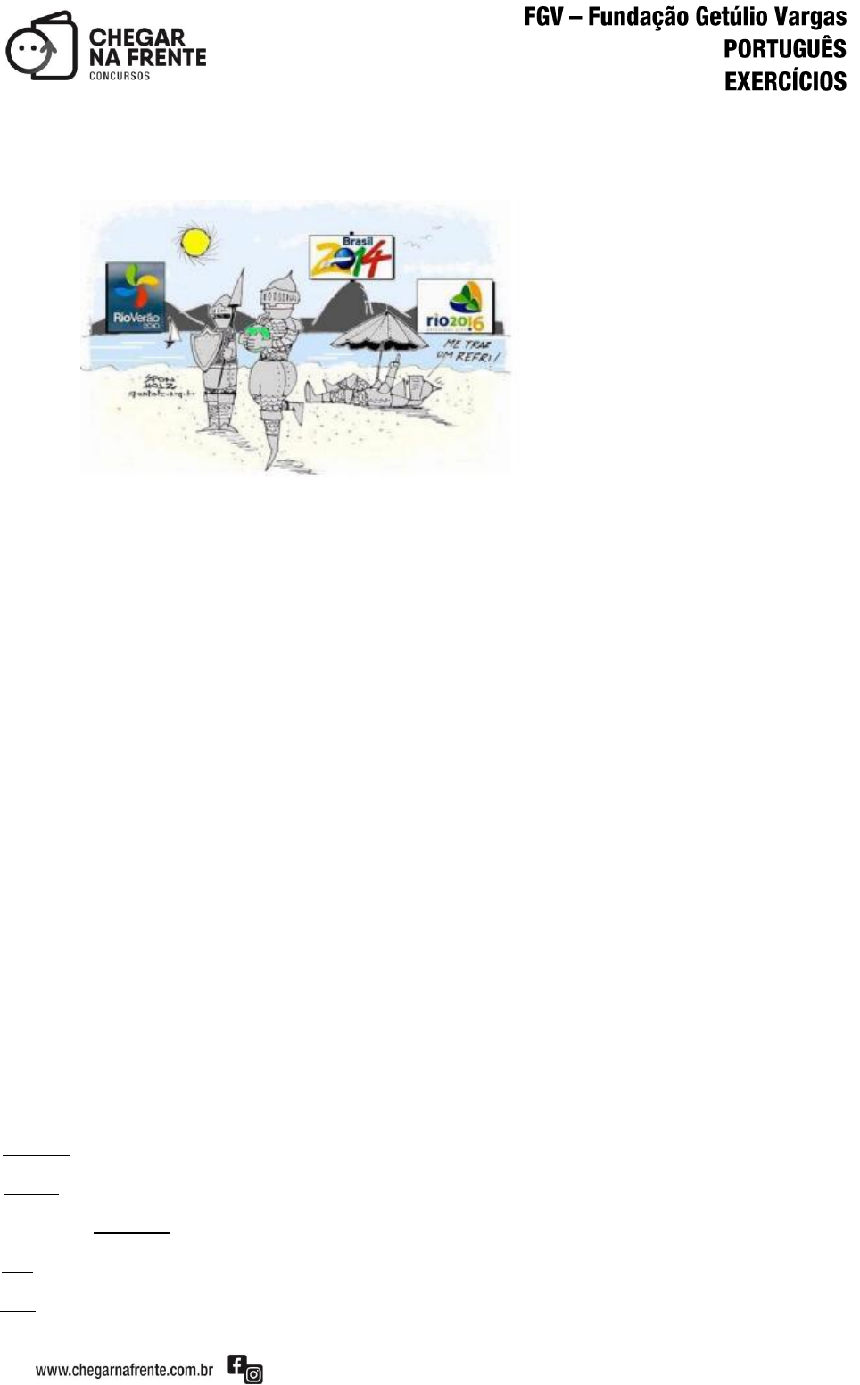 47 118 - ( 2016 - MPE-RJ - Analista Ministerial - Área Processual ) Sobre a charge acima, pode-se dizer que sua temática básica é: a) a inadequação dos turistas no Rio de Janeiro; b) o excesso de eventos na capital carioca; c) a falta de segurança nas praias do Rio; d) a crítica ao calor excessivo no verão do Rio; e) a crítica à poluição das águas no Rio. 119 - ( 2016 - MPE-RJ - Analista Ministerial - Área Processual ) Na mesma charge, considerando-se que o humor é fruto da ruptura de uma expectativa, pode-se observar que, nessa imagem, o humor é causado pelo(a) a) contraste entre o calor e a idealização dos cartazes; b) oposição entre as armaduras e o cenário da praia; c) impossibilidade de alguém de armadura tomar água de coco; d) improbabilidade de haver sol em todos os eventos; e) choque entre os eventos passados e o futuro. 120 - ( 2016 - MPE-RJ - Analista Ministerial - Área Processual ) A frase ‚Me traz um refri‛ tem um vocábulo abreviado da mesma forma que o vocábulo sublinhado abaixo: a) O portuga não me pagou o que deve! b) O atraso dos trens me deixou irritado. c) Assisti a um Fla X Flu no domingo. d) A CPI dos Correios deu encrenca! e) A Uerj fará vestibular no próximo sábado.