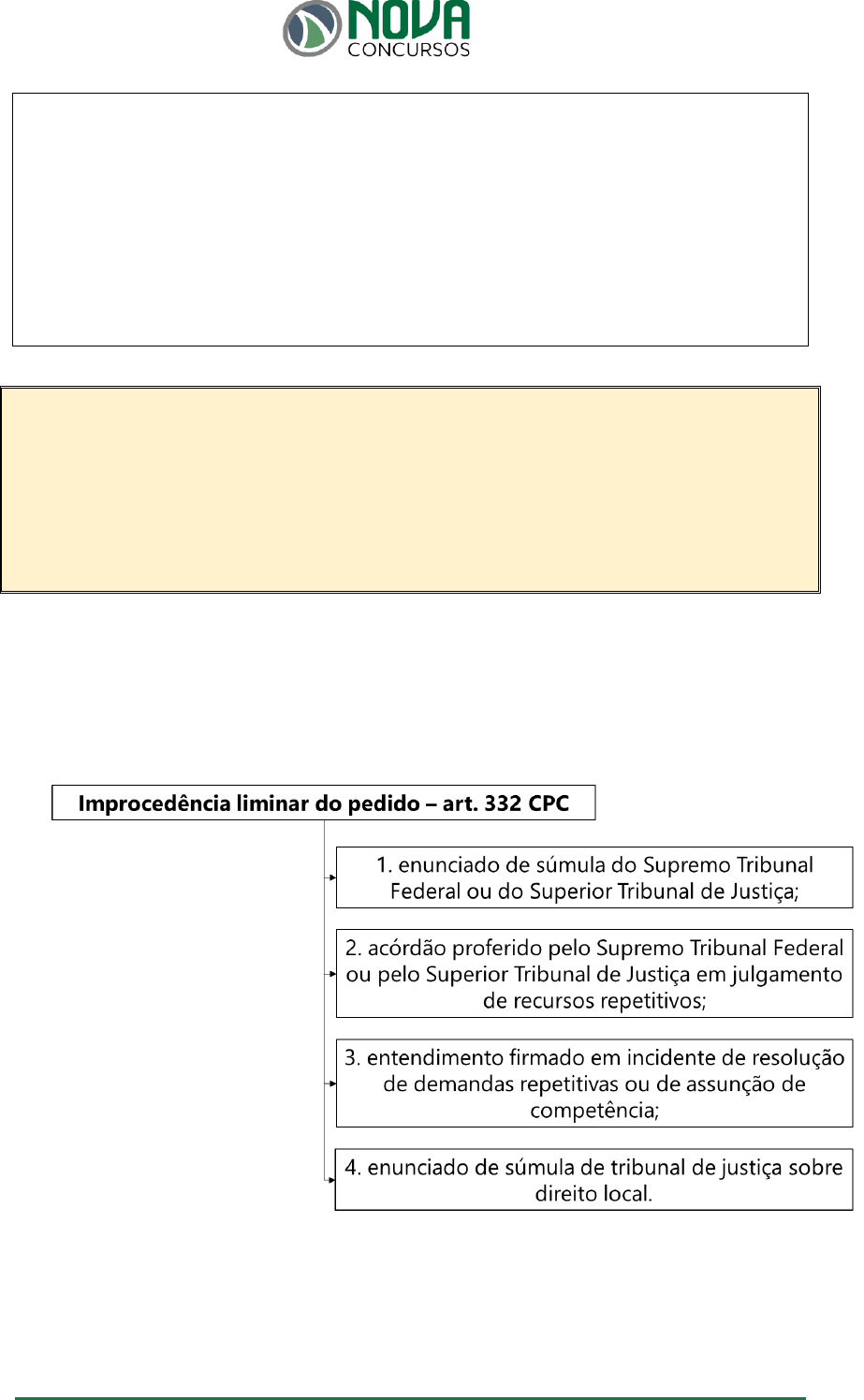 Direito Processual Civil TJ/SP - Escrevente Prof.ª Vanessa André de Paiva 18 de 21 www.novaconcursos.com.br Alternativa correta: E. Art. 332, NCPC. Nas causas que dispensem a fase instrutória, o juiz, independentemente da citação do réu, julgará liminarmente improcedente o pedido que contrariar: (...) IV - Enunciado de súmula de tribunal de justiça sobre direito local. #FICADICA As hipóteses de indeferimento da petição inicial estão diretamente ligadas ao direito formal; As hipóteses de improcedência liminar do pedido estão diretamente ligadas ao direito material. Assim, nas causas que dispensem a fase instrutória, o juiz, independentemente da citação do réu, julgará liminarmente improcedente o pedido que contrariar: Na parte geral do Código, encontramos mais um tema que foi exigido pela VUNESP no certame para TJSP: Atos processuais. https://www.novaconcursos.com.br/?utm_source=pdf&utm_medium=pdf&utm_campaign=pdf-tj-sp-dicas-questoes
